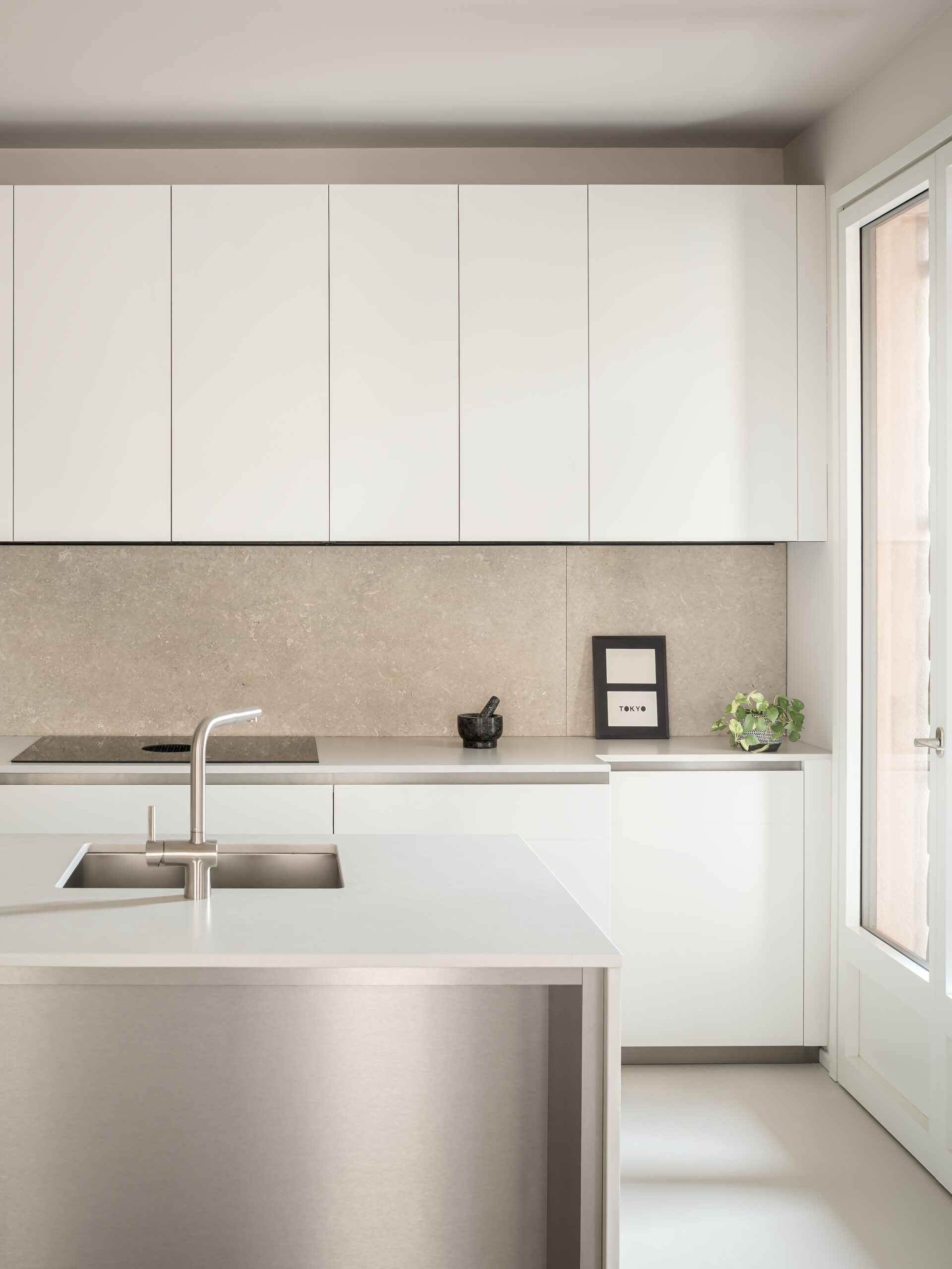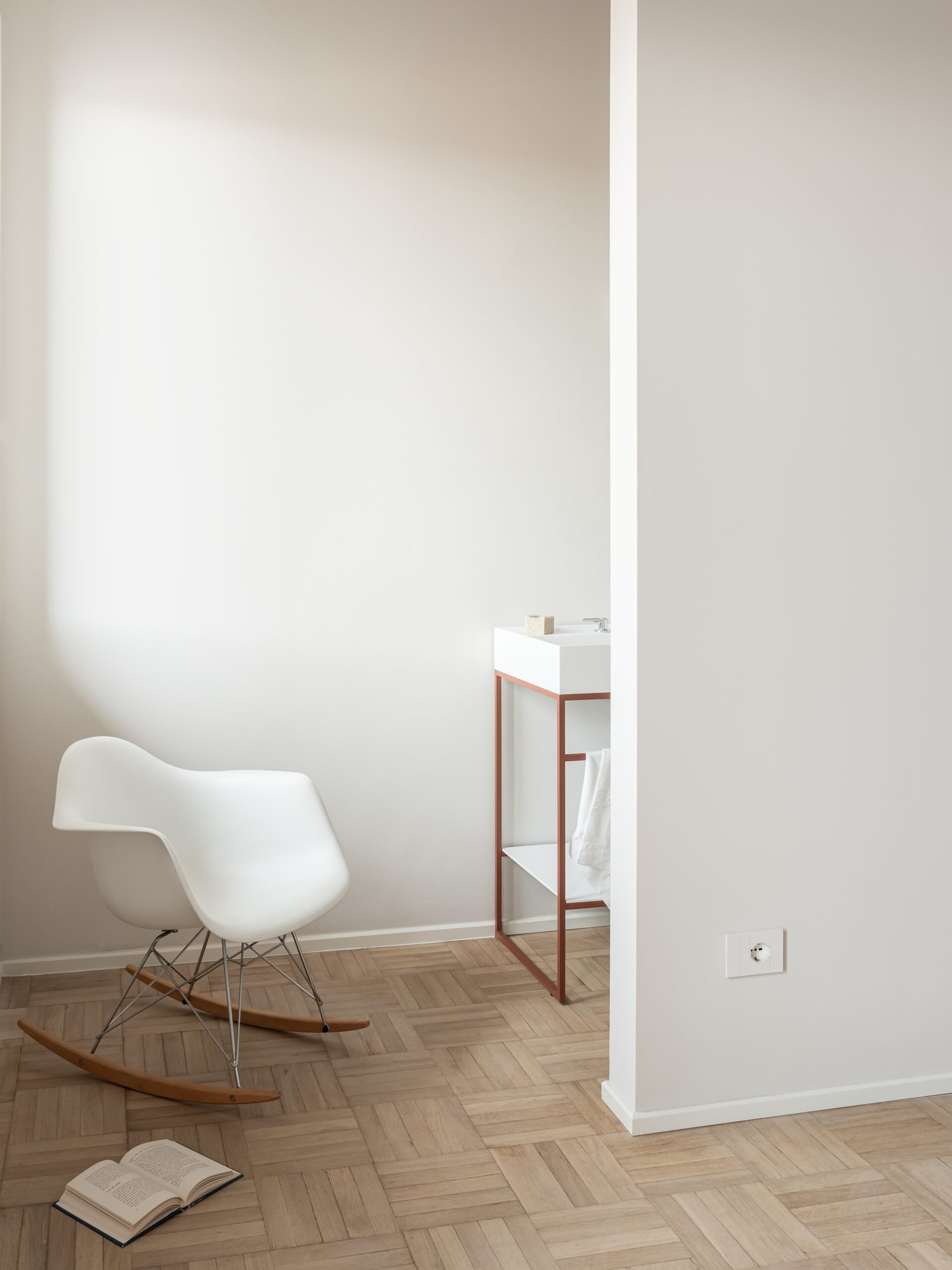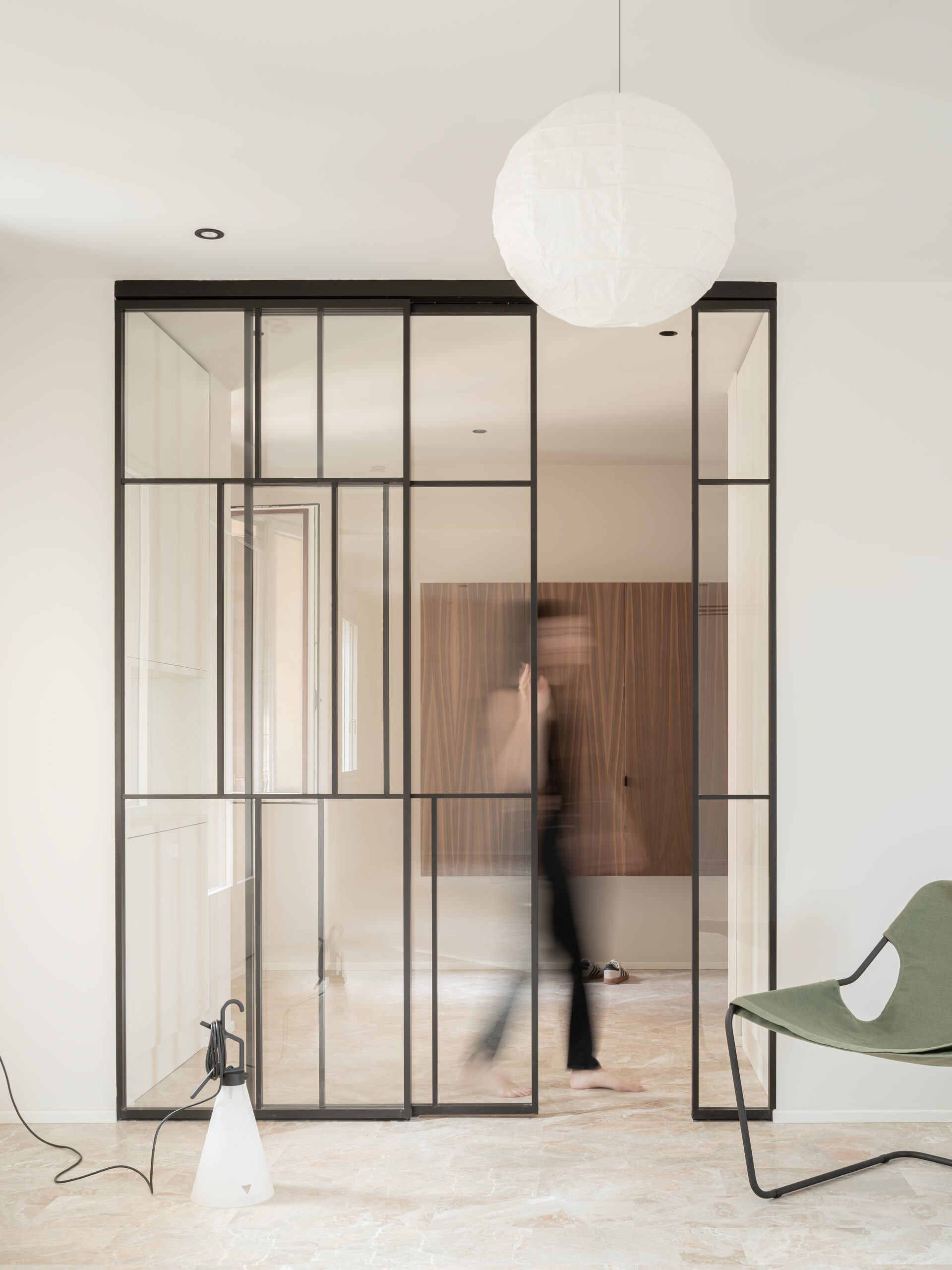 La luce naturale diventa strumento compositivo primario. Attraverso la rimozione selettiva di alcune partizioni e una ridefinizione del layout interno, gli spazi sono stati resi più permeabili, favorendo una continuità visiva e funzionale tra zona giorno e ambienti di servizio. La disposizione degli arredi su misura contribuisce a guidare i flussi, senza interrompere la circolazione dell’aria e della luce, che ora attraversano l’appartamento con maggiore libertà. Il risultato è un interno arioso, fluido e coerente, in cui ogni elemento partecipa a un equilibrio complessivo.