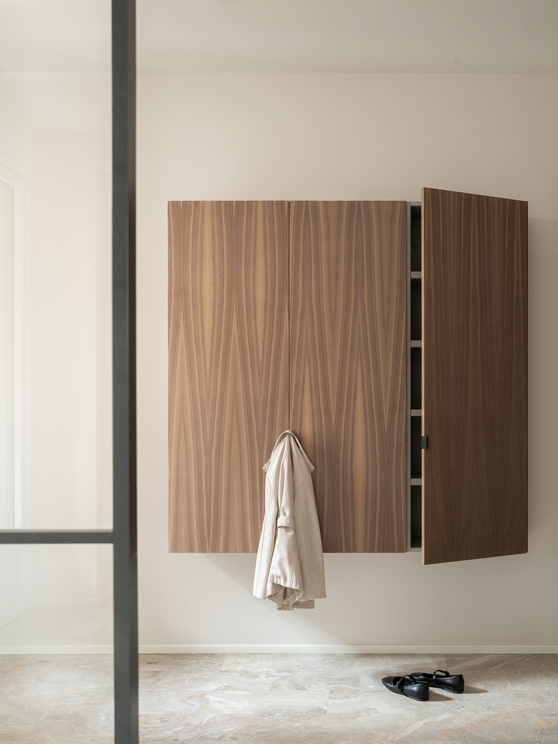 I pavimenti originali in marmo Breccia Damascata e in legno sono stati accuratamente restaurati, recuperando la qualità materica e il valore storico delle superfici. A questi si affiancano nuovi inserti in pietra Grigio Alpi di Vicenza, utilizzata per definire soglie, dettagli e superfici funzionali, in un raffinato equilibrio cromatico. La palette si completa con una resina neutra e luminosa, scelta per amplificare la percezione dello spazio, e con arredi su misura in legno di noce, progettati come elementi architettonici capaci di organizzare e qualificare gli ambienti.