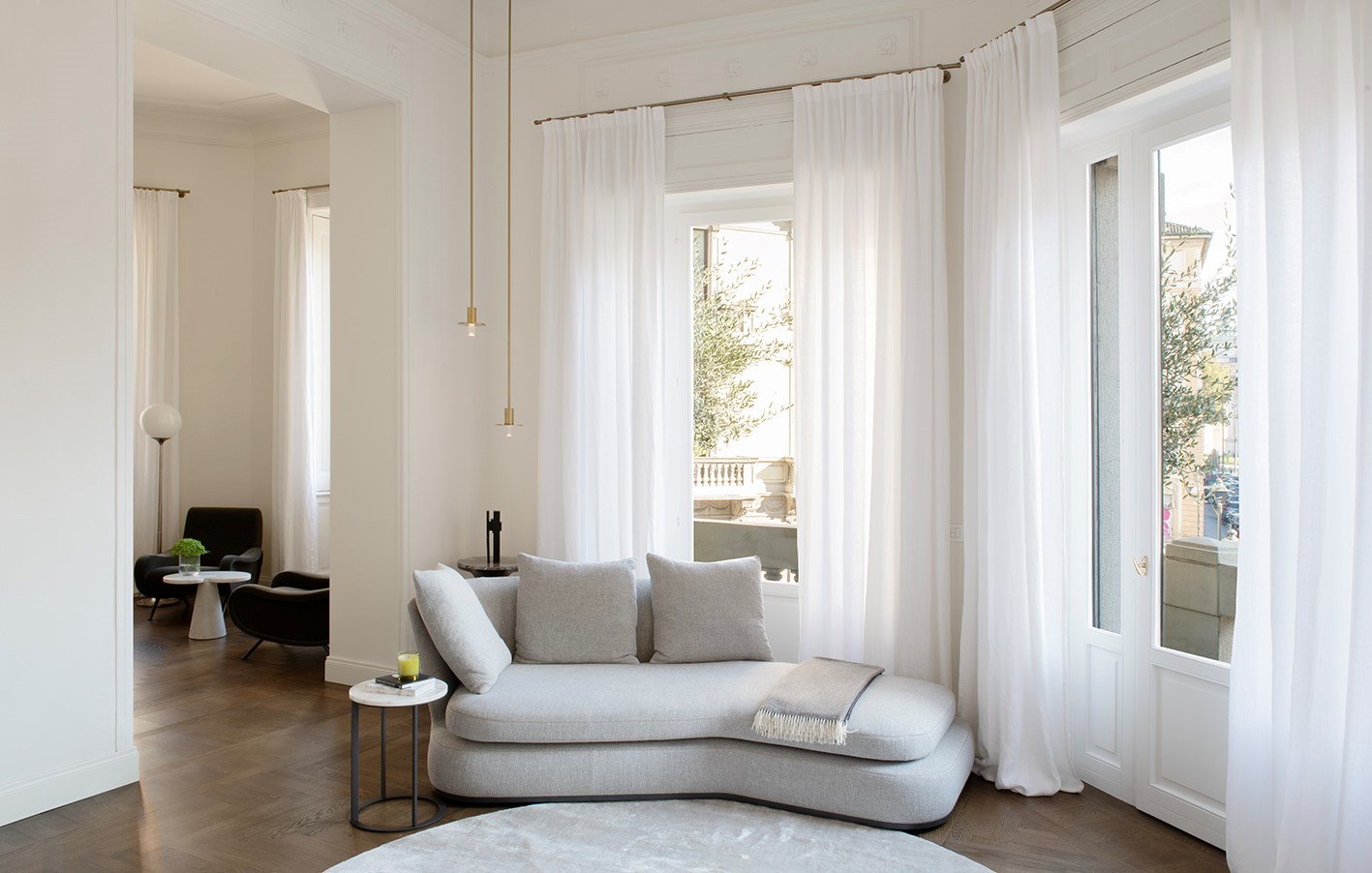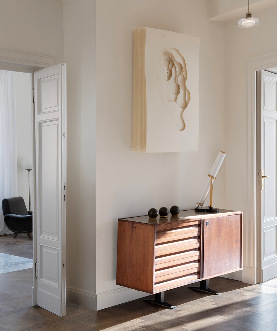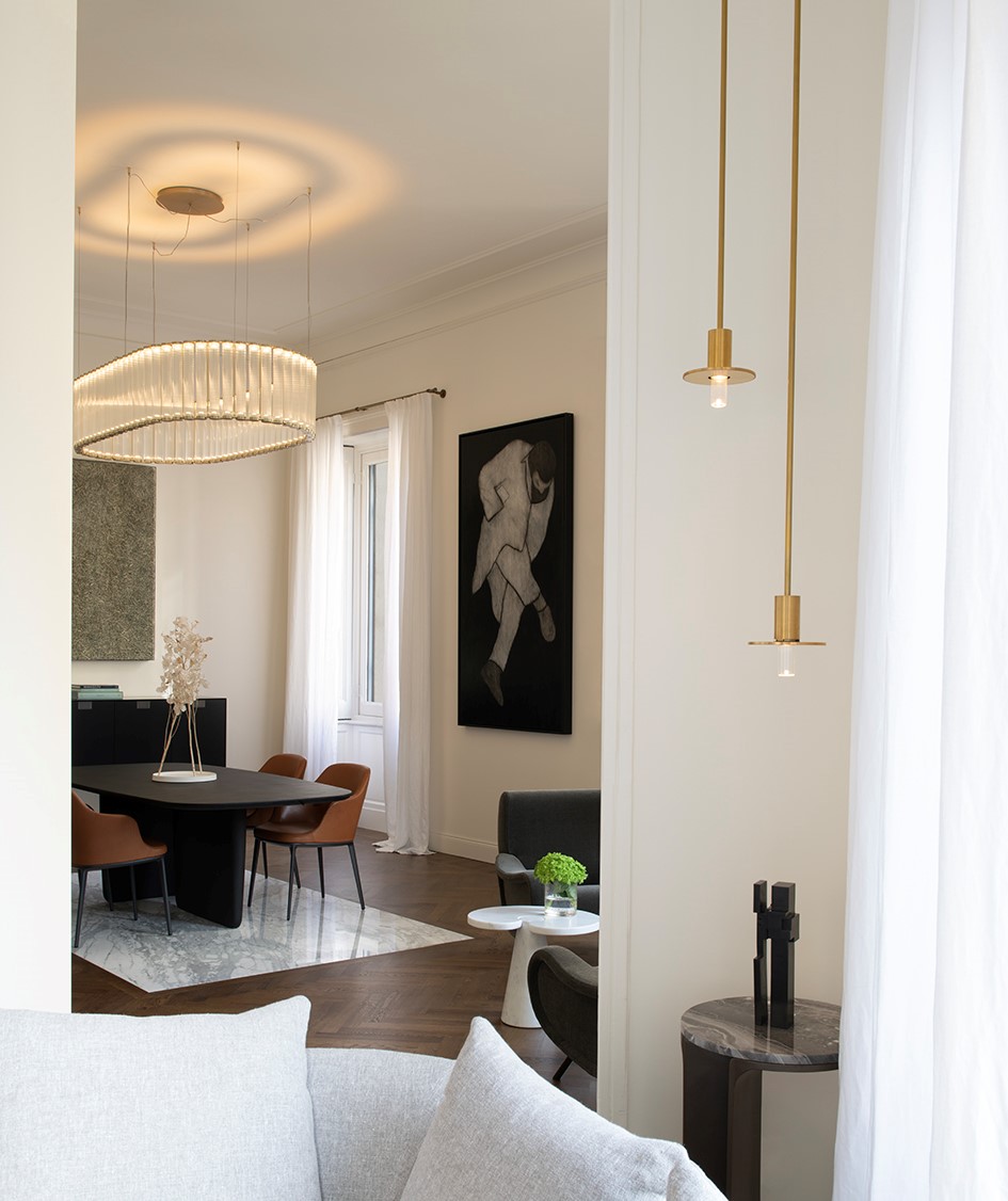 Il progetto ha preservato l’anima originaria dell’edificio, riportando alla luce soffitti, pavimenti e infissi d’epoca attraverso un attento lavoro di restauro. Gli elementi storici, mantenuti e valorizzati, diventano la cornice ideale per un linguaggio d’interni essenziale ma ricercato, in cui il comfort contemporaneo incontra la nobiltà dei materiali e delle proporzioni originarie.