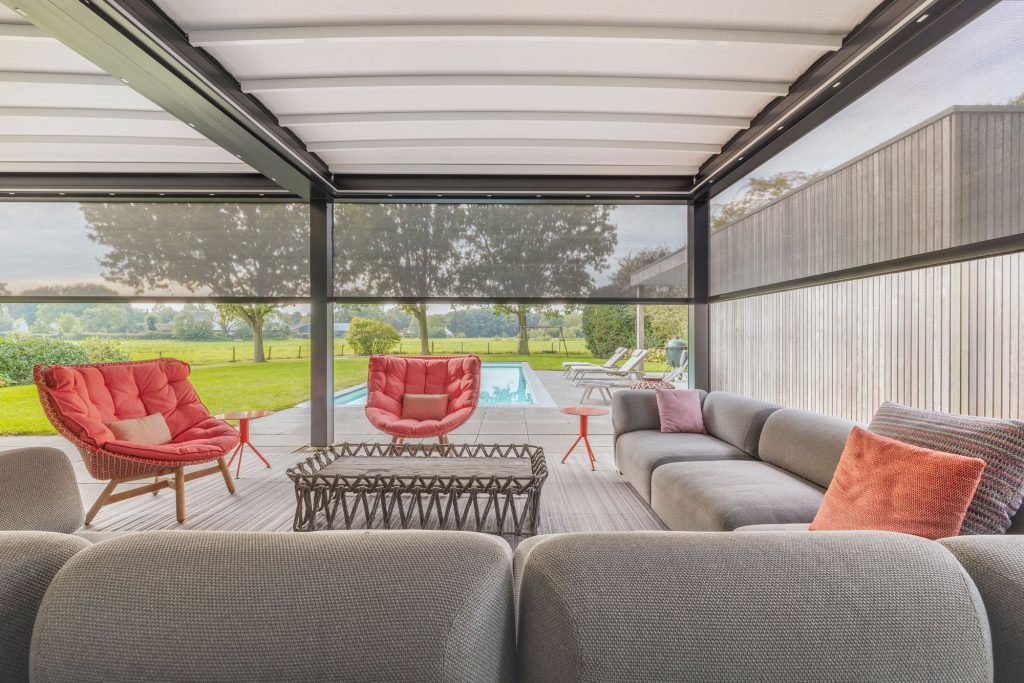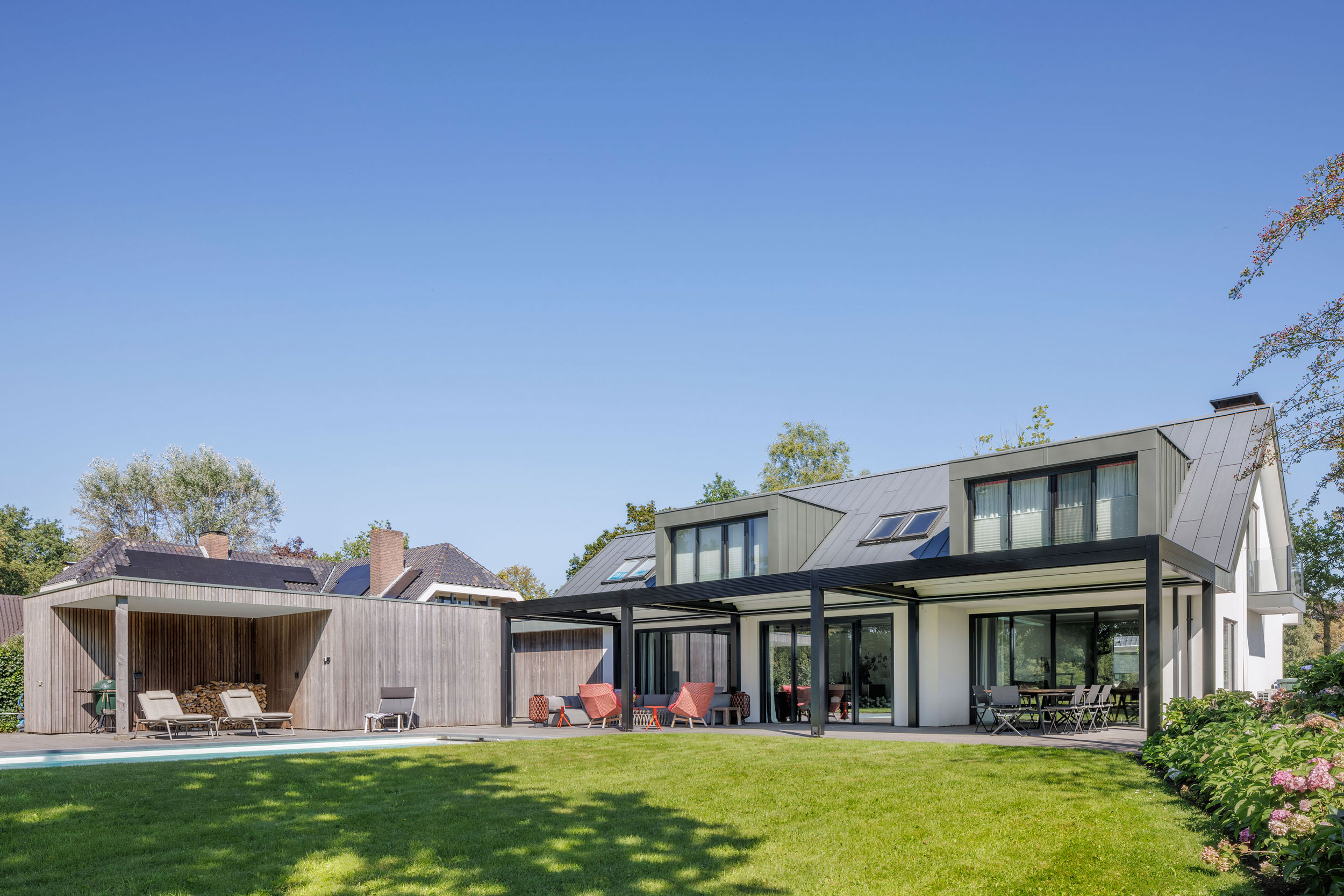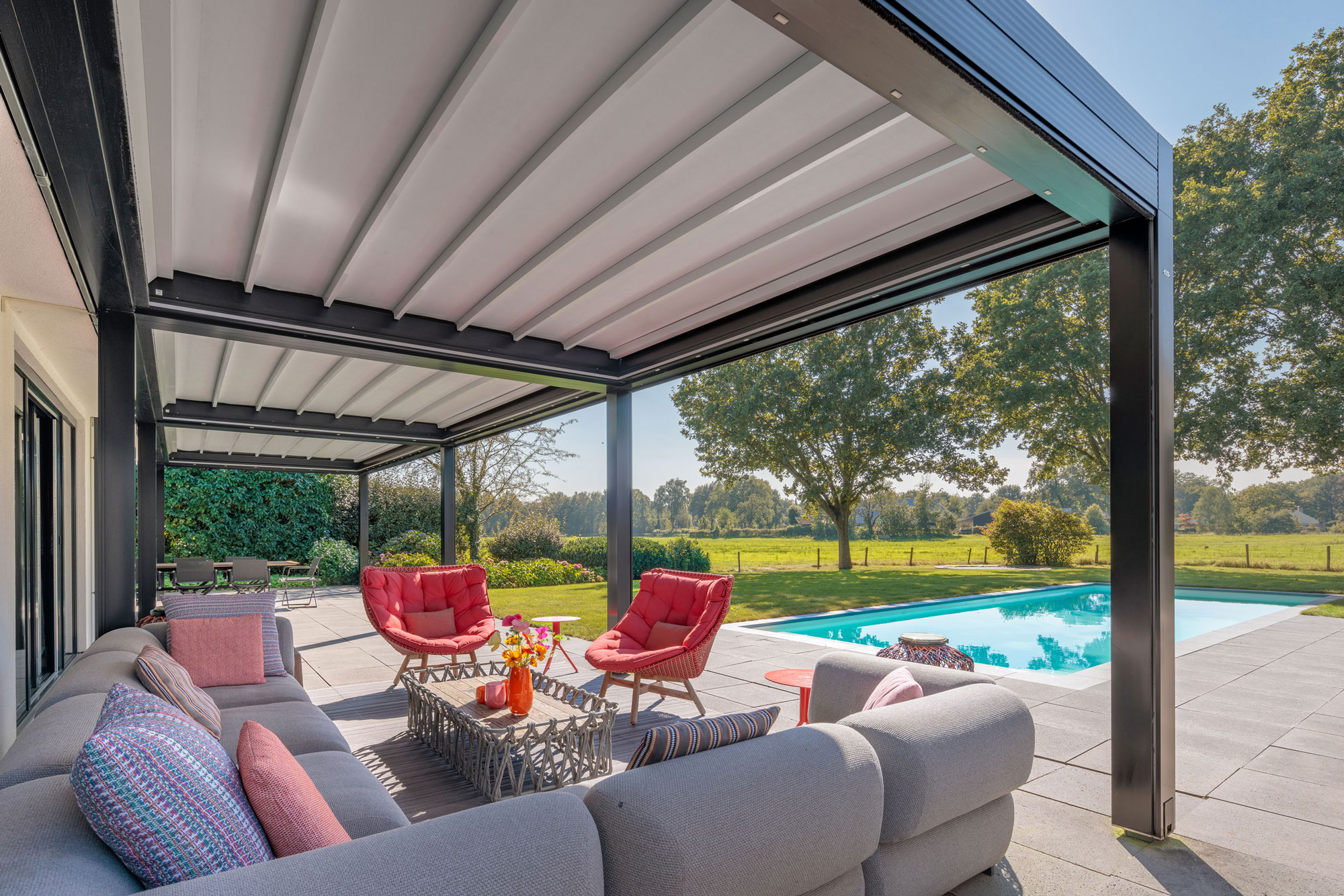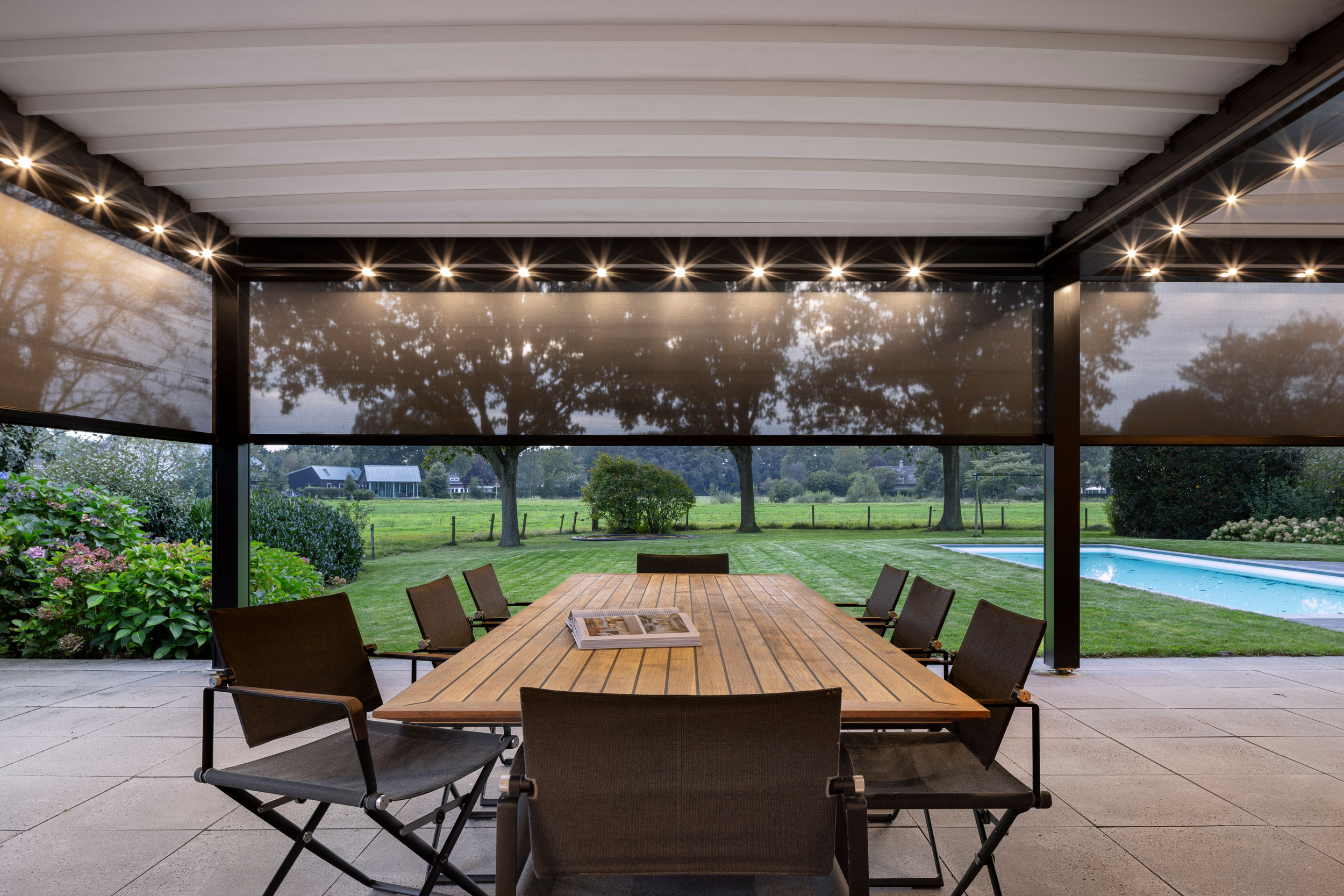 Grazie alla loro versatilità, nonché in conseguenza del cambiamento climatico, le pergole impacchettabili stanno oggi diventando un’apprezzata soluzione anche in paesi dal clima più rigido. È il caso di questa splendida abitazione unifamiliare, situata a Zwolle nei Paesi Bassi, che presenta, nella parte superiore, i caratteri tipici delle costruzioni olandesi - dalla copertura a falde molto spioventi ai generosi bow-window che rendono abitabili le camere nel sottotetto - mentre la parte inferiore si rivela simile a un’abitazione che potremmo trovare in Italia. Al pian terreno, lungo l’intero prospetto meridionale, si estende infatti una pergola impacchettabile Azimut di Gibus, ampia tre campate, che accoglie un’estensione all’aperto del living - con divano ad angolo, poltrone e tavolo basso, per il relax e la conversazione - e una zona pranzo con tavolo e sedute pieghevoli dall’immagine “outdoor”. Delimitati a ovest dal padiglione di servizio, il soffice prato all’inglese e la piscina completano la composizione.
