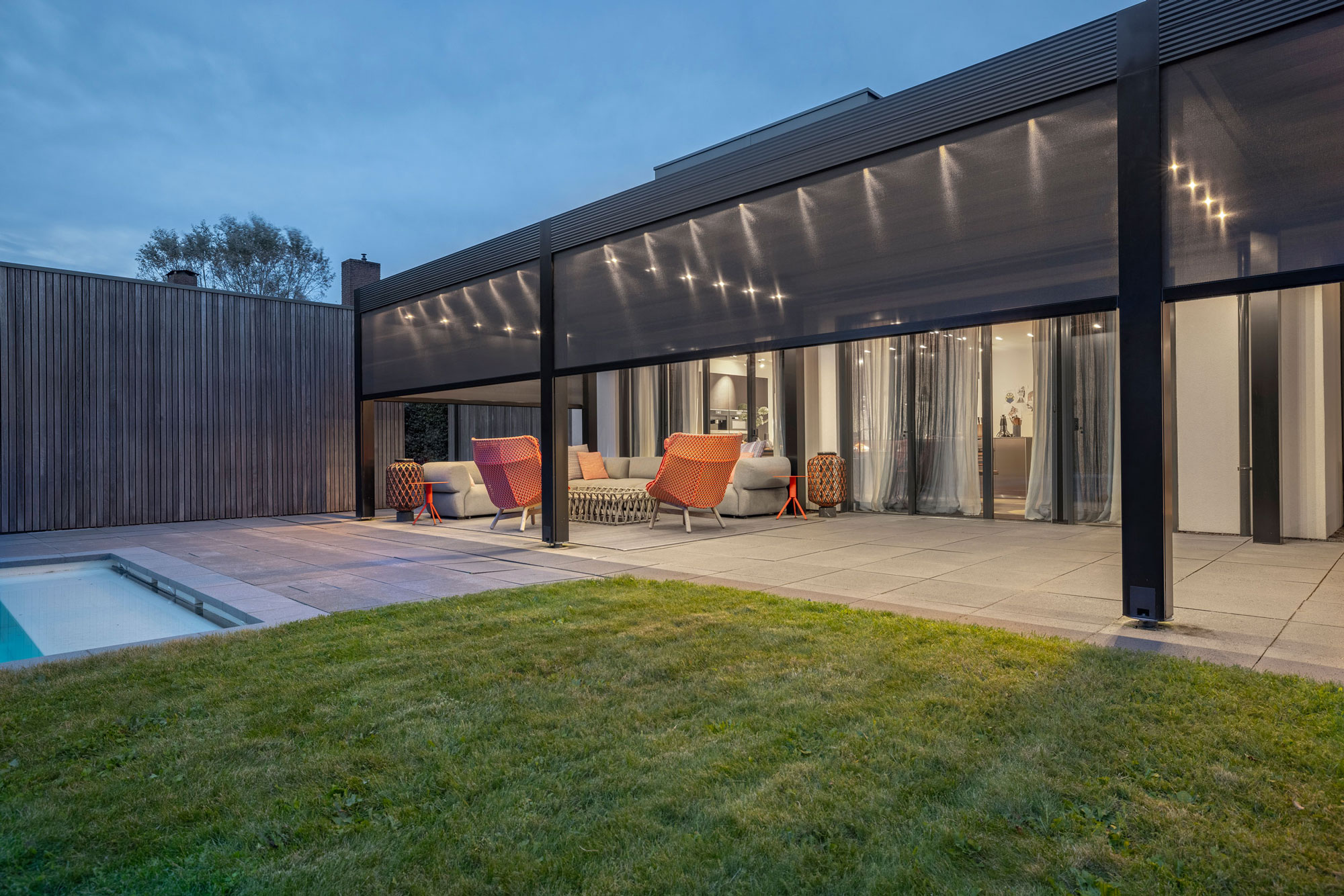 Azimut è stata qui selezionata per l’eccellente mix di caratteristiche estetiche, tecniche e funzionali. La snella struttura portante, di colore grigio antracite, ridisegna il fronte esposto a sud con campate di ampiezza differente, sottolineando il ritmo irregolare della facciata. La copertura impacchettabile riprende il colore chiaro delle pareti esterne e, durante le giornate scarsamente soleggiate, permette la penetrazione della luce naturale in tutta la zona giorno. Realizzato con tessuto oscurante in pvc, impermeabile e resistente ai raggi ultravioletti, il telo ombreggiante è scandito dai rompitratta che rinforzano la struttura in caso di vento e precipitazioni. Celato dentro gli elementi strutturali, il perfetto sistema di drenaggio mantiene l’intero pergolato perfettamente asciutto. A conferire ulteriore flessibilità alla struttura sono inoltre le chiusure laterali in tessuto screen integrate nella pergola, che garantiscono una gestione dell’illuminazione naturale ancora più mirata. Soluzione in grado di restituire spazi en plein air suggestivi ed emozionanti, Azimut è qui dotata di punti luce LED, integrati nei profili strutturali, che vivacizzano la pergola al calare delle prime ombre della sera, con la corretta intensità luminosa.