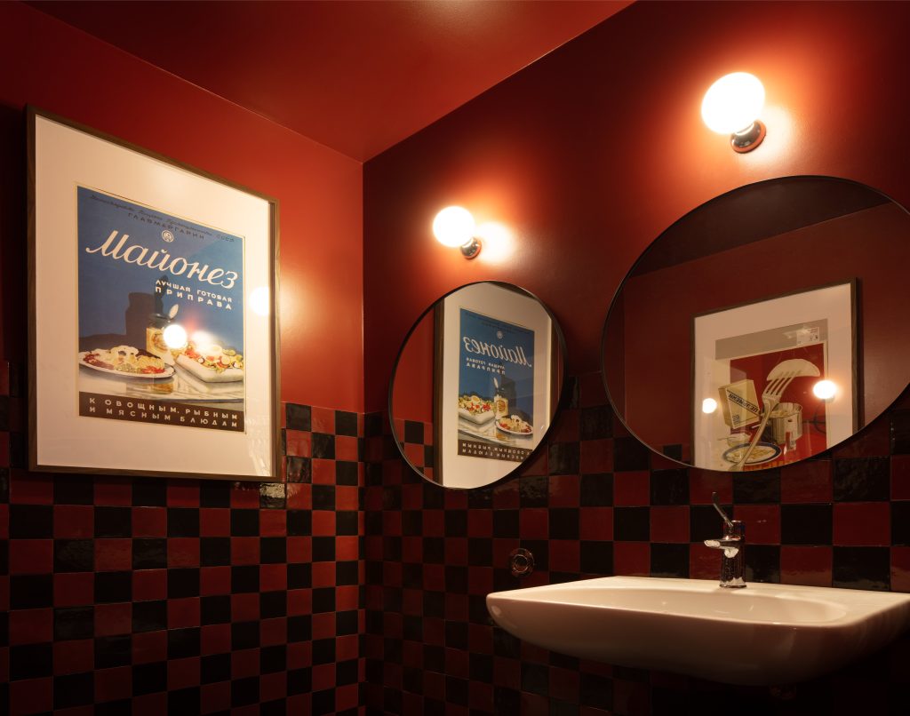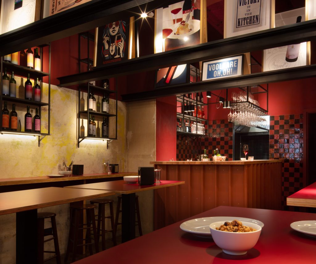 Sulle pareti, librerie in ferro nero accolgono le bottiglie di vino, mentre le lampade a sospensione creano un'atmosfera intima e accogliente. A conferire un tocco grafico e distintivo all’ambiente è il rivestimento a scacchi nero e rosso che abbraccia la zona del banco bar e caratterizza il bagno clienti.