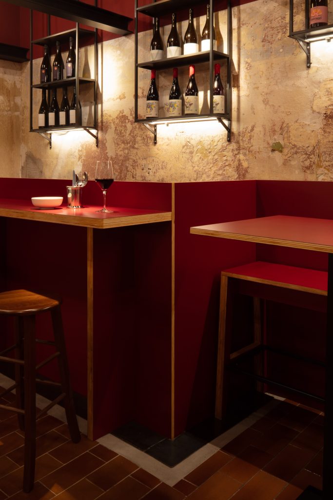 Lo spazio si sviluppa in senso longitudinale: una singola vetrina su strada introduce a un ambiente che si svela immediatamente nella sua continuità visiva. La prima porzione del locale accoglie tavoli, mensole a parete e sedute alte, mentre nella seconda prende forma il cuore operativo, con il banco bar che fa da soglia alla cucina. La palette cromatica - dominata da rossi profondi, sfumature di nero e tonalità terrose - contribuisce a definire un’atmosfera calda e genuina. L’arredo interpreta una sobrietà funzionale: tavoli e mensole in multistrato a vista sono rivestiti in laminato plastico, materiale iconico dei bar italiani del dopoguerra, riproposto qui in una lettura attuale e misurata.