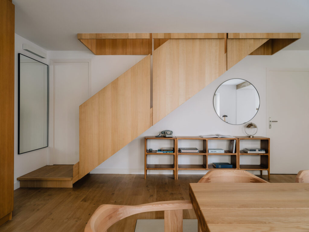 Inizialmente guardata con diffidenza dalla committenza, la valorizzazione delle strutture lignee è diventata fulcro dell’intervento, grazie a un meticoloso lavoro di falegnameria su misura. Ogni dettaglio ridisegna le proporzioni, apre punti di vista inattesi e restituisce misura e intimità agli ambienti, combinando poesia e funzionalità.