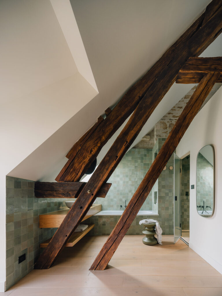 La scelta dei materiali e la palette cromatica è essenziale e misurata: rovere naturale, murature in mattoni lasciate a vista e superfici intonacate creano spazi caldi e contemporanei, in dialogo costante con l’identità rurale dell’edificio. Il colore diventa strumento di equilibrio, continuità e armonia, delicato ma incisivo, a sottolineare la coesione tra passato e presente.