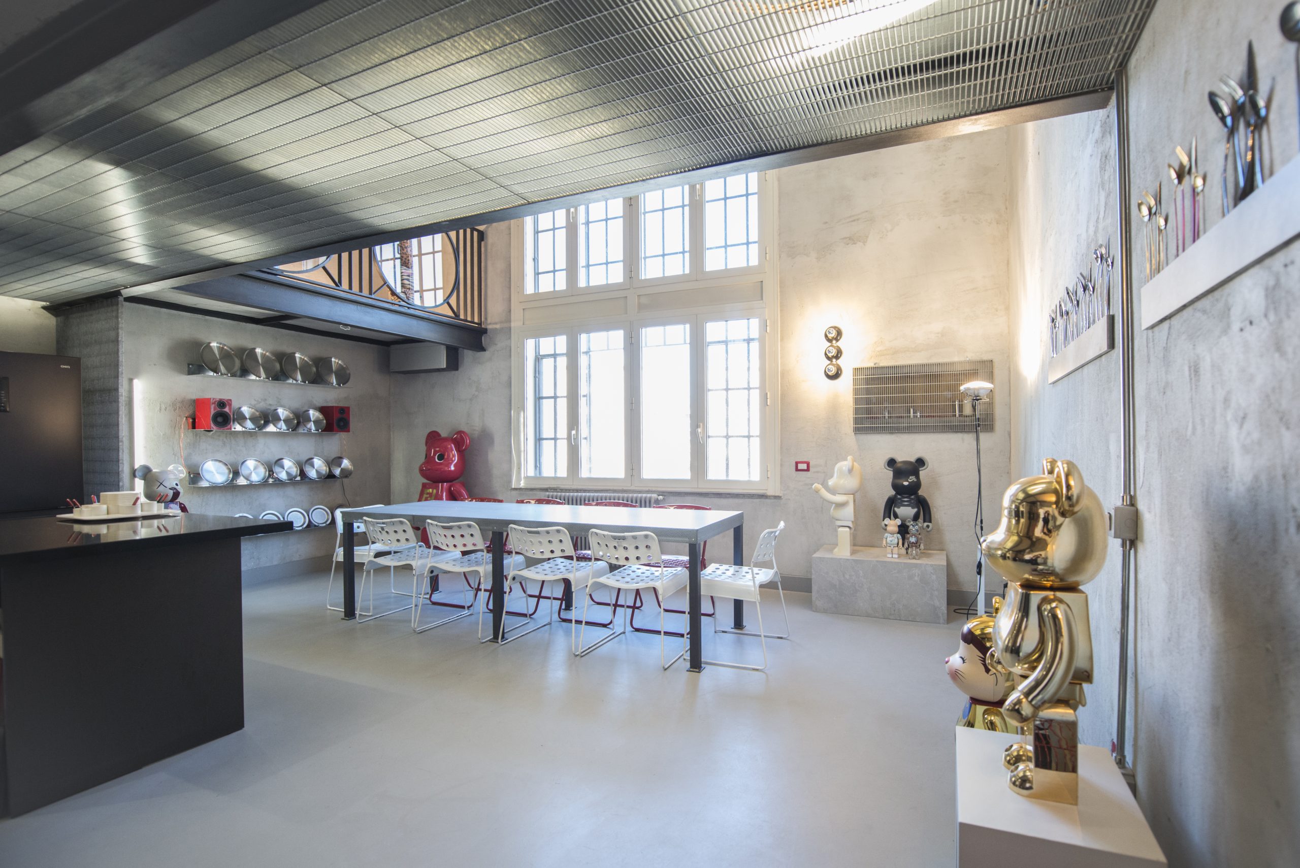 Dal carattere quasi sperimentale, l'intervento mira a valorizzare le qualità intrinseche dello spazio, amplificandone la vocazione industriale e costruendo al contempo un ambiente fortemente riconoscibile e identitario. I pochi elementi d’arredo sono progettati ad hoc o recuperati, prevalentemente dagli anni Settanta, e dialogano - talvolta in contrasto - con opere d’arte contemporanea di ambito Micro Pop giapponese e americano, rafforzando la dimensione personale e stratificata del progetto.