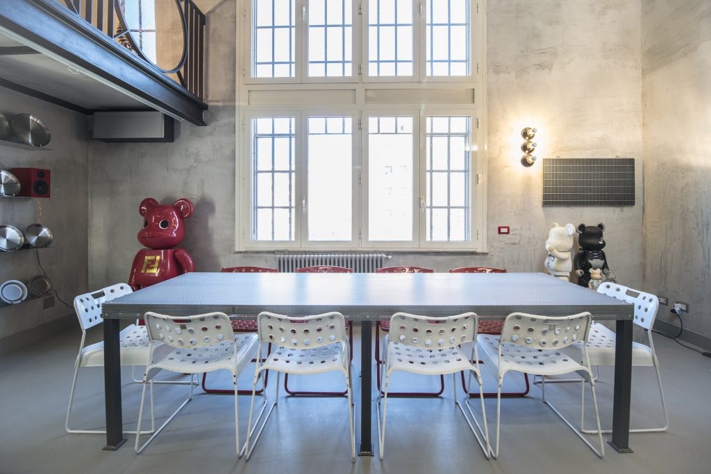 Al piano terra dello spazio Brutal Bites prende posto la cucina, collocata sotto le travi metalliche: al loro interno, tubolari LED e reti Keller costruiscono un sistema di illuminazione inaspettato, tecnico e insieme scenografico. Al centro dello spazio si impone un grande tavolo in ferro, realizzato su disegno con tubolari metallici e rete microforata, pensato come fulcro delle serate di degustazione curate da Poggi. Una scala in ferro, leggera e quasi industriale, conduce al livello superiore, dove affacciati sul vuoto del soggiorno si sviluppano una zona relax con pavimento in gomma rossa a bolli e un volume semi-aggettante rivestito in lamiera, che accoglie una piccola camera.