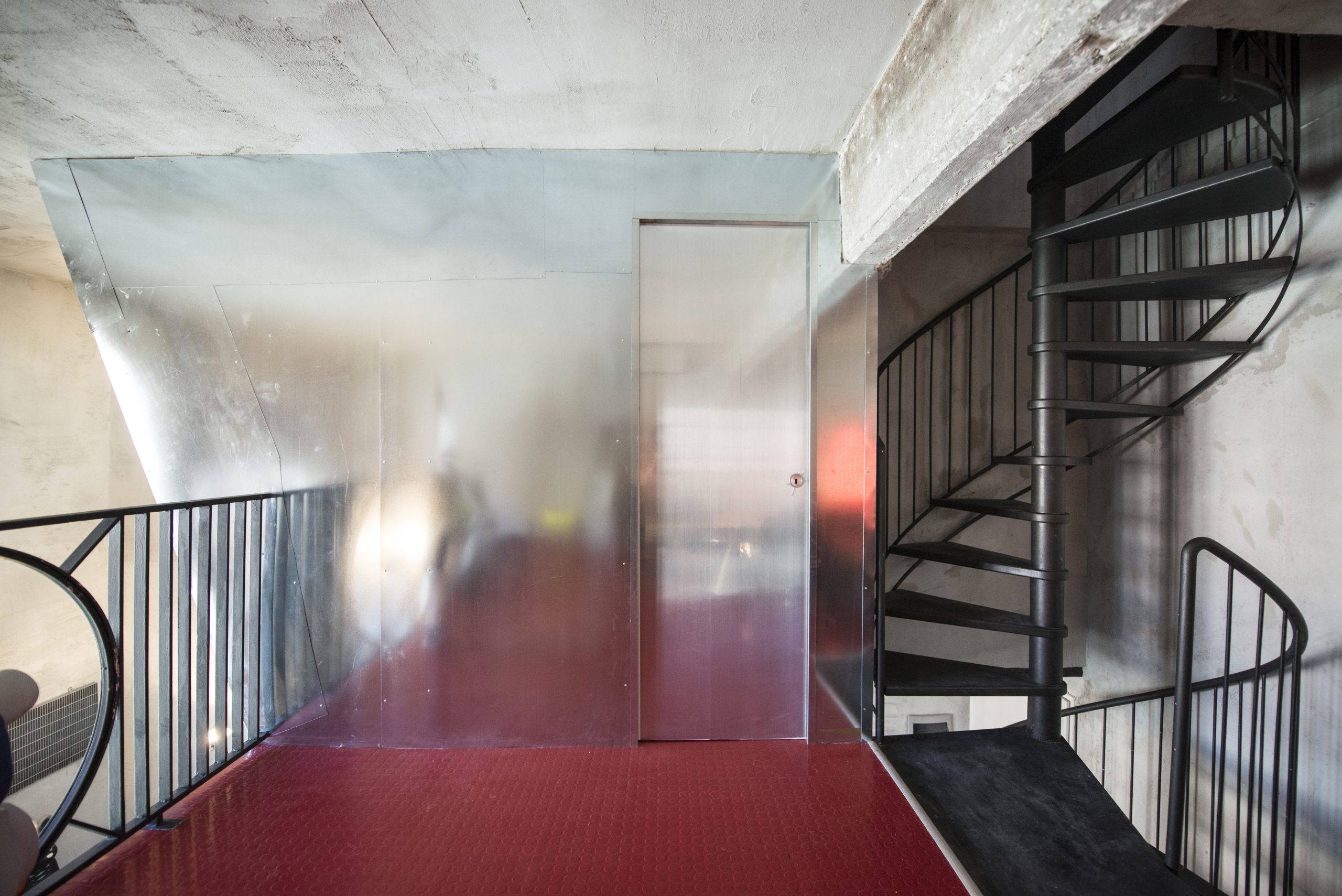 Ne risulta un linguaggio radicale, improntato a un’unitarietà industriale priva di decorazioni, che definisce un ambiente volutamente imperfetto e non rifinito. Un’estetica asciutta che, paradossalmente, riesce a trasmettere una forte dimensione accogliente, quasi quella di un rifugio urbano. Dal ballatoio d’ingresso si accede allo spazio principale a doppia altezza, dominato da una grande finestra di oltre quattro metri che incornicia il paesaggio cittadino, ritmato dal passaggio costante dei treni sulla ferrovia adiacente.