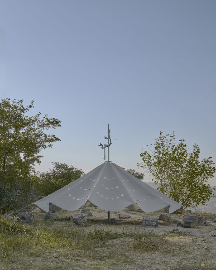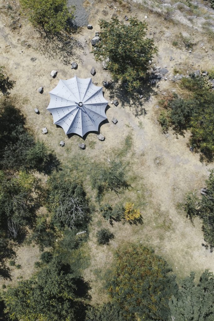 Osservato dall’alto, Campato in Aria si presenta come un equilibrio di forze in tensione. La leggerezza della tenda sospesa dal suolo è bilanciata dal peso di dodici massi, uno per ciascuno degli spicchi che compongono la struttura. È come se un delicato gioco gravitazionale trattenesse il tendaggio al terreno, trasformando la leggerezza in stabilità. A rimando degli abiti tradizionali armeni, 320 monetine sovradimensionate in acciaio ornano la superficie della tenda che agitate dal vento creano un perenne tintinnio.