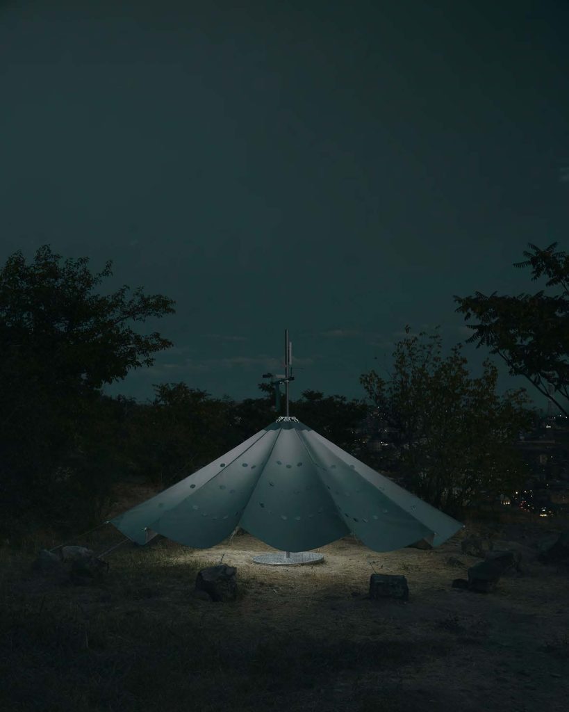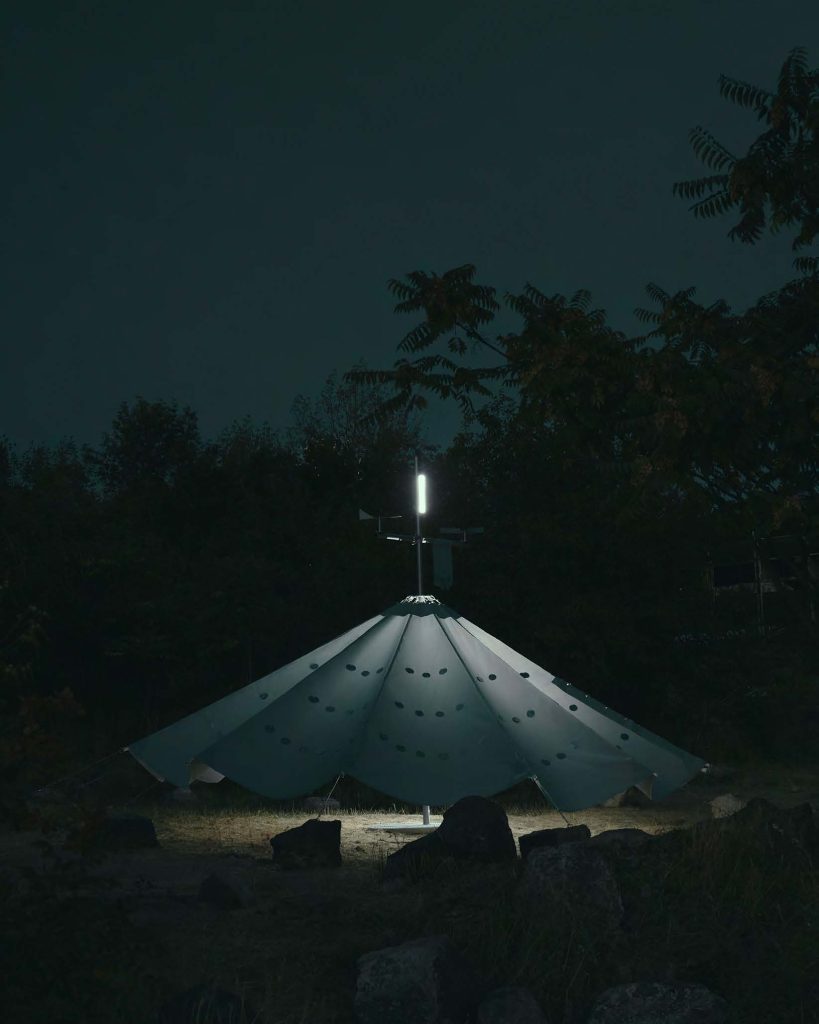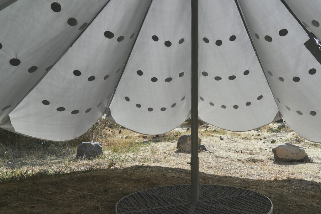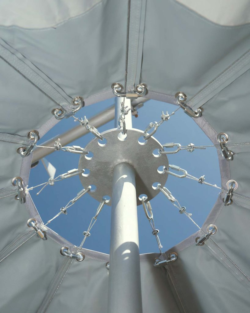 I materiali utilizzati sono essenziali e ridotti al minimo: una tenda in nylon, dodici cavi d’acciaio e un palo centrale, anch’esso in acciaio, che si eleva per 3,5 metri dal suolo.