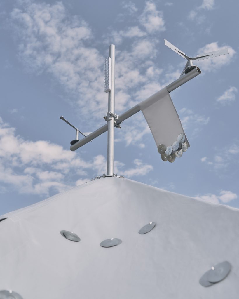 Il tendaggio, dalla forma dodecagonale, copre una superficie di circa 50 metri quadrati. Il padiglione è sormontato da un’asta orizzontale di 1,25 metri che sostiene, al di sopra della copertura, oggetti ispirati all’immaginario delle stazioni meteorologiche: anemometri, una bandiera, una luce notturna. Questi elementi rendono visibile, attraverso il movimento, la direzione e l’intensità del vento.