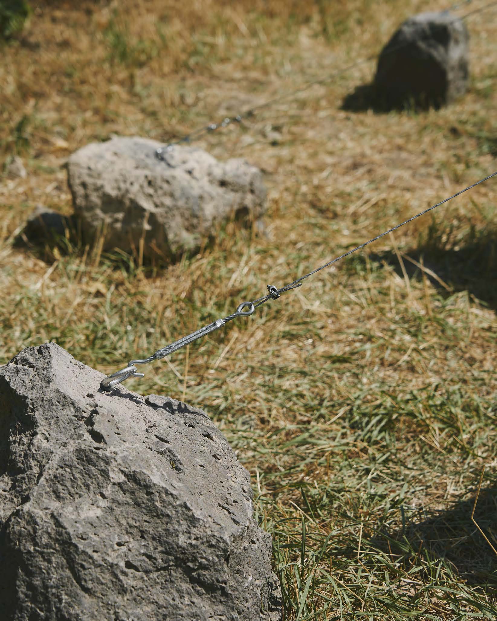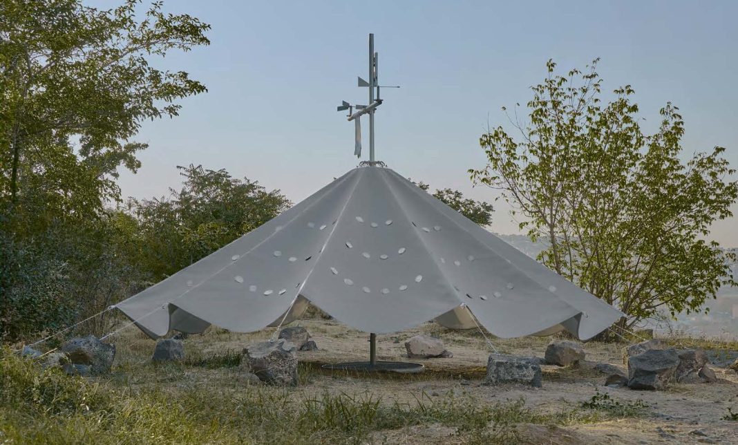 Osservato dall’alto, Campato in Aria si presenta come un equilibrio di forze in tensione. La leggerezza della tenda sospesa dal suolo è bilanciata dal peso di dodici massi, uno per ciascuno degli spicchi che compongono la struttura. È come se un delicato gioco gravitazionale trattenesse il tendaggio al terreno, trasformando la leggerezza in stabilità. A rimando degli abiti tradizionali armeni, 320 monetine sovradimensionate in acciaio ornano la superficie della tenda che agitate dal vento creano un perenne tintinnio.