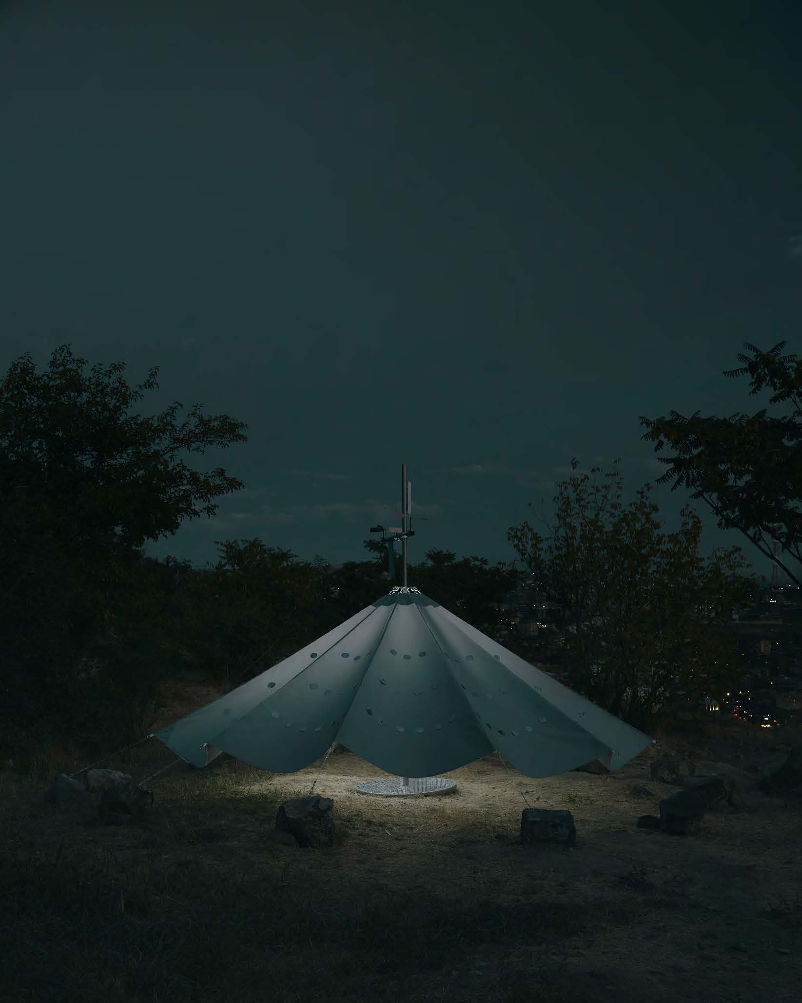 Il tendaggio, dalla forma dodecagonale, copre una superficie di circa 50 metri quadrati. Il padiglione è sormontato da un’asta orizzontale di 1,25 metri che sostiene, al di sopra della copertura, oggetti ispirati all’immaginario delle stazioni meteorologiche: anemometri, una bandiera, una luce notturna. Questi elementi rendono visibile, attraverso il movimento, la direzione e l’intensità del vento.