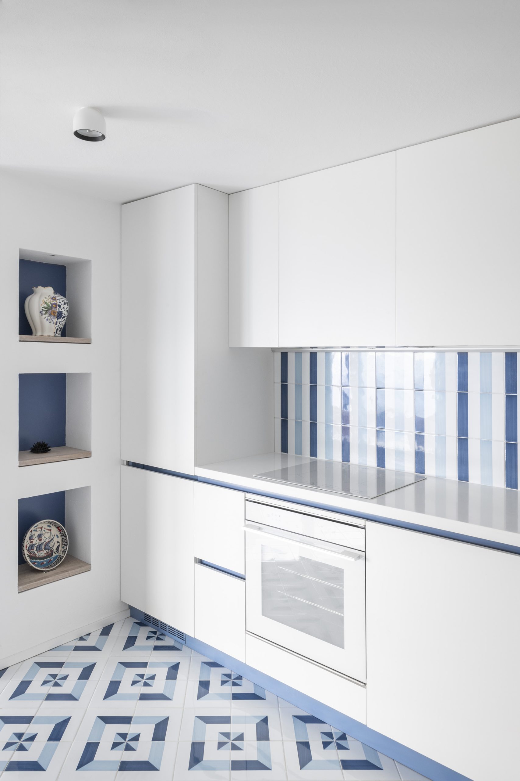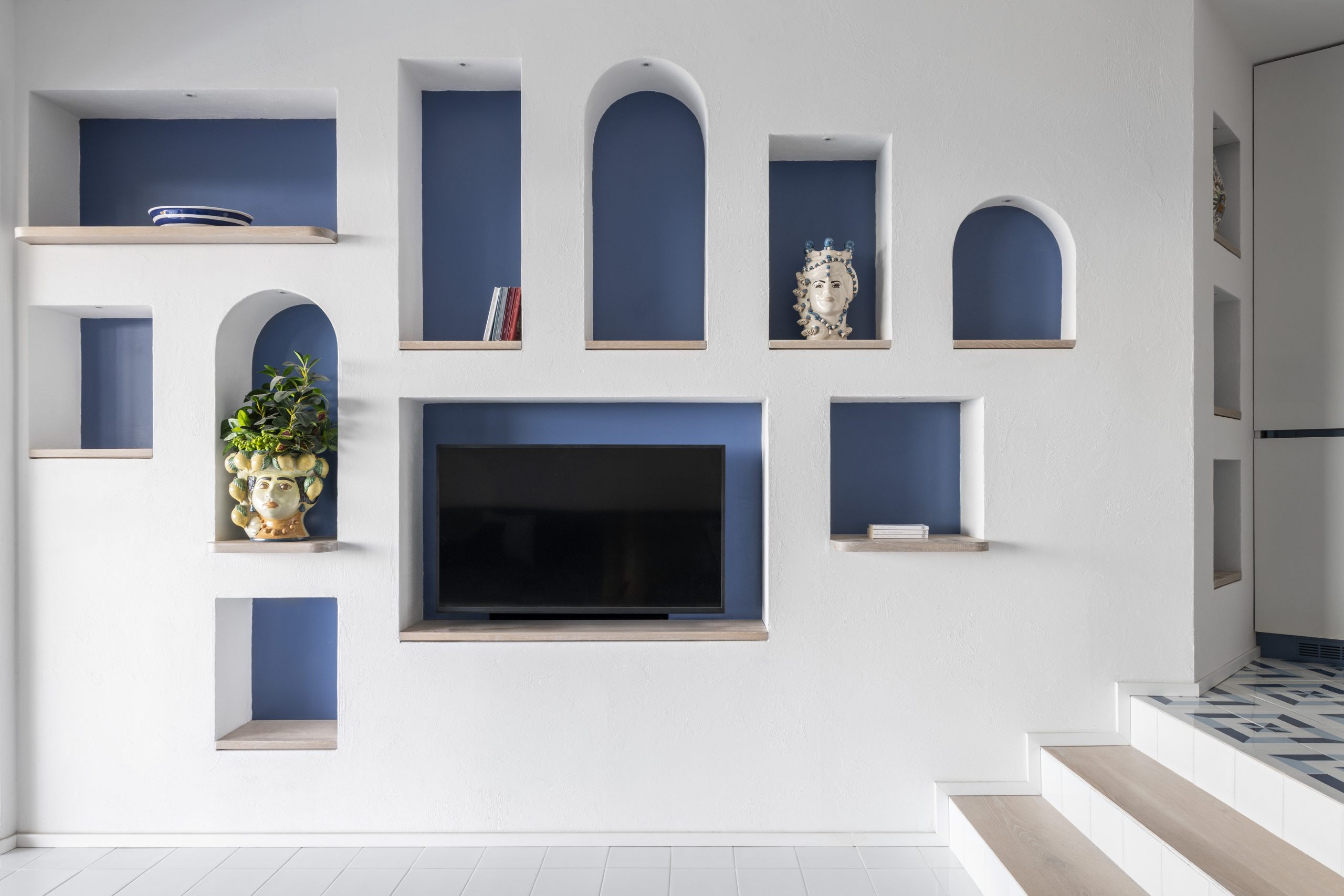 Il piano in corian bianco, le gole e il battiscopa blu riprendono la palette marina, mentre le nicchie che circondano l’area living – tutte disegnate ad hoc – accolgono oggetti e ricordi dei proprietari, integrandosi nel disegno architettonico.