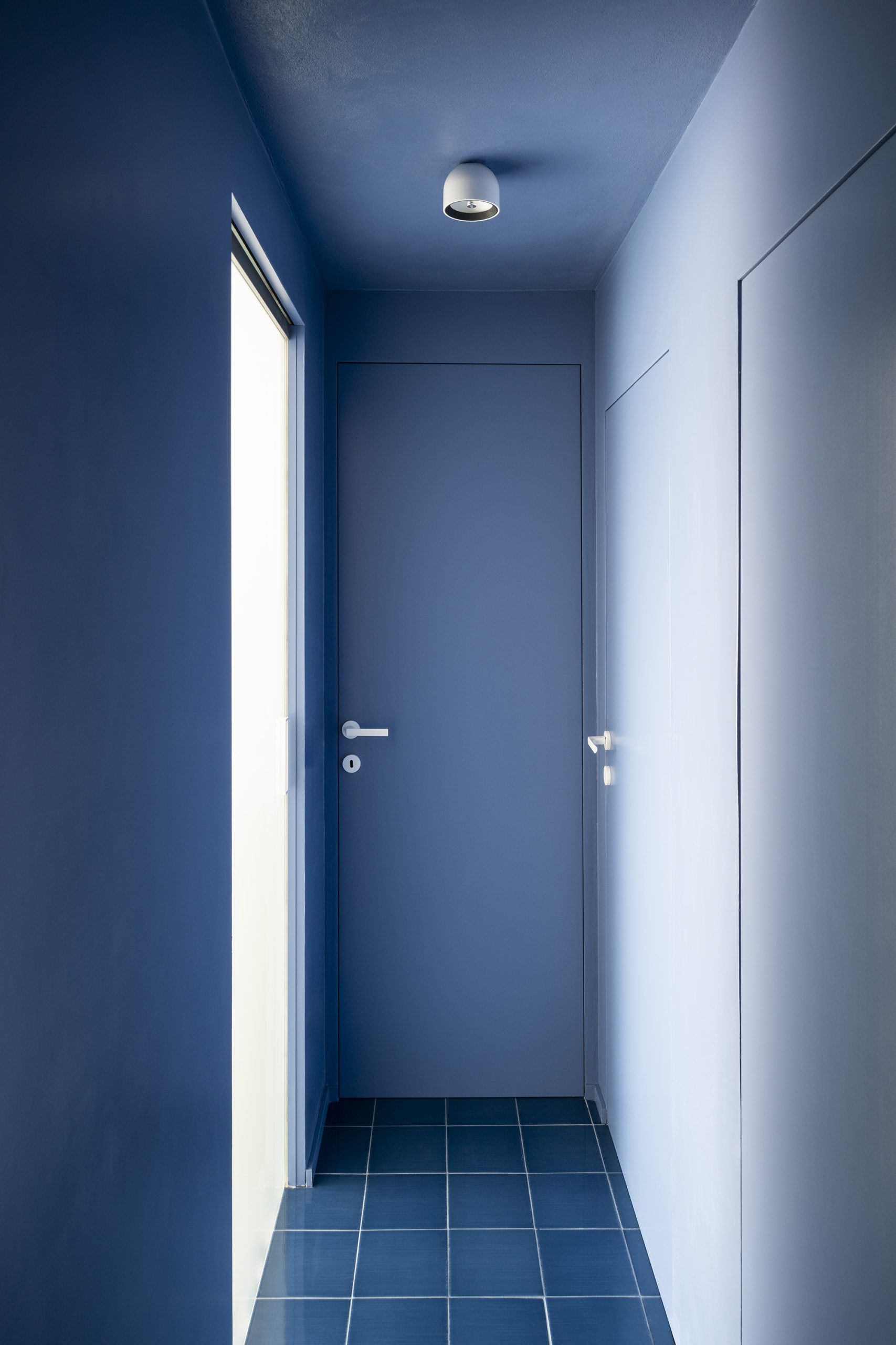 Il disimpegno, immerso in una tonalità blu profonda, segna la transizione tra la zona giorno e quella notte. Nei bagni, il pavimento mantiene la stessa cromia, accostandosi a una parete blu e a una rivestita di mattonelle bianche che amplificano la luminosità. Le camere da letto, invece, alternano il blu dell’ingresso al bianco puro della zona notte, creando una progressione cromatica che alleggerisce gli spazi e riflette la luce naturale, in perfetta sintonia con il paesaggio costiero.