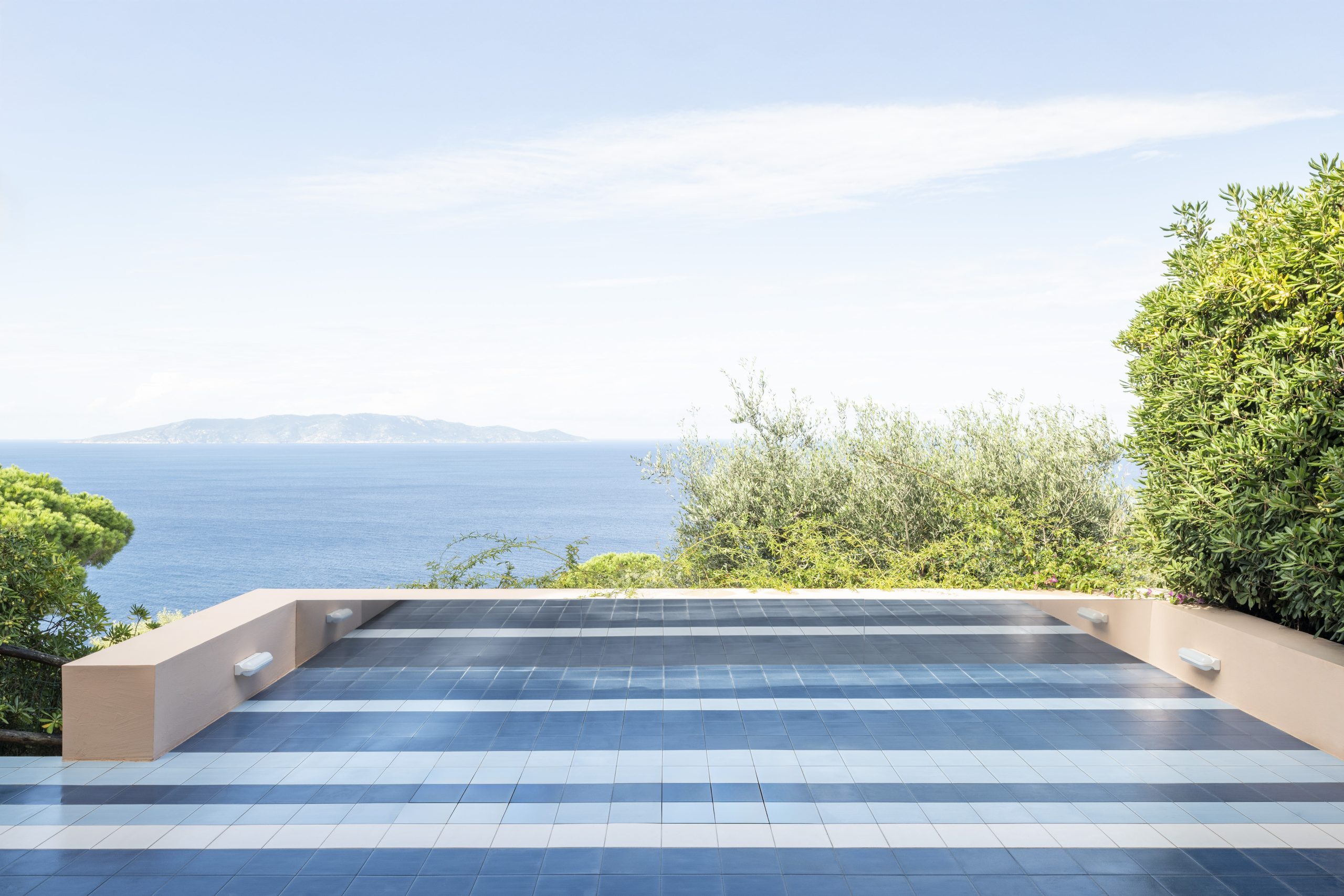 Elemento iconico del progetto di SPREAD OUT STUDIO è la terrazza “perpetua”, vero e proprio prolungamento della casa verso il mare. Pavimentata con mattonelle artigianali che sfumano dal bianco all’azzurro fino al blu profondo, la superficie dialoga con una lastra di acciaio lucidata a specchio posta sul muretto perimetrale. Il dettaglio riflette i colori del pavimento, amplificando l’effetto ottico e proiettando idealmente lo spazio abitato verso l’orizzonte.