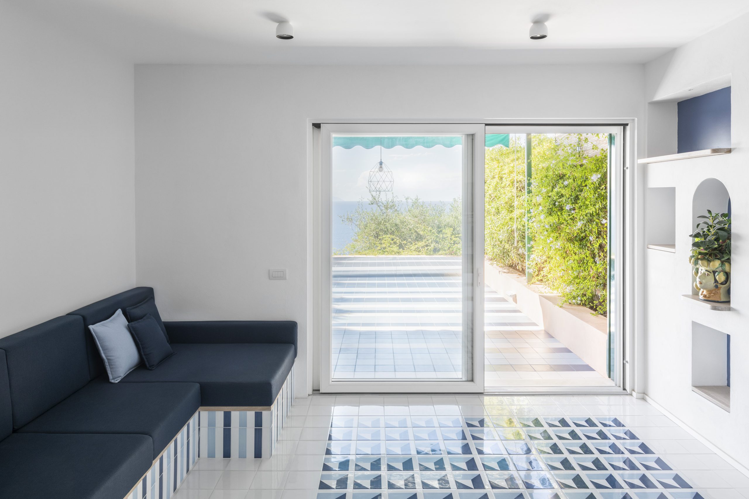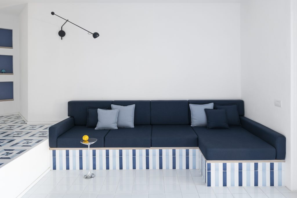 All’interno, il soggiorno si sviluppa su due livelli: la parte più bassa dedicata al relax e, sul retro, la cucina e la sala da pranzo. Il pavimento è rivestito da ceramiche disegnate da Gio Ponti, un tappeto di geometrie nei colori del mare che cambia ritmo nella zona pranzo con un motivo a quadrati concentrici. Il grande divano contenitore, realizzato su misura, diventa elemento centrale della composizione: il suo basamento riprende il disegno delle ceramiche, in un elegante gioco di righe verticali.