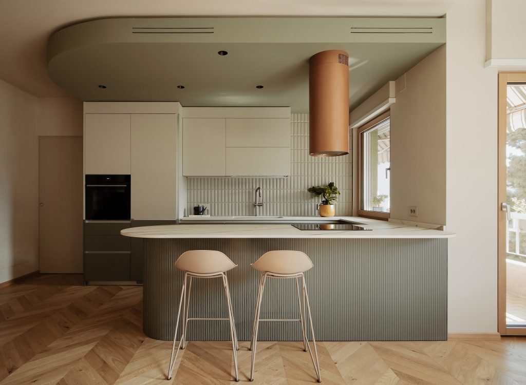Nel progetto, la cucina non è semplice funzione, ma centro identitario della casa. Ogni dettaglio è pensato per sostenere la socialità e la vivacità dei committenti, a partire dalla scelta di colori intensi e animati. Una cappa in rame diventa elemento iconico e dialoga con le sfumature verdi e beige delle superfici, componendo un’atmosfera brillante e raffinata. L’impostazione generale dell’abitazione riflette una volontà chiara: creare spazi fluidi, accoglienti, in grado di far sentire chiunque immediatamente a proprio agio.
