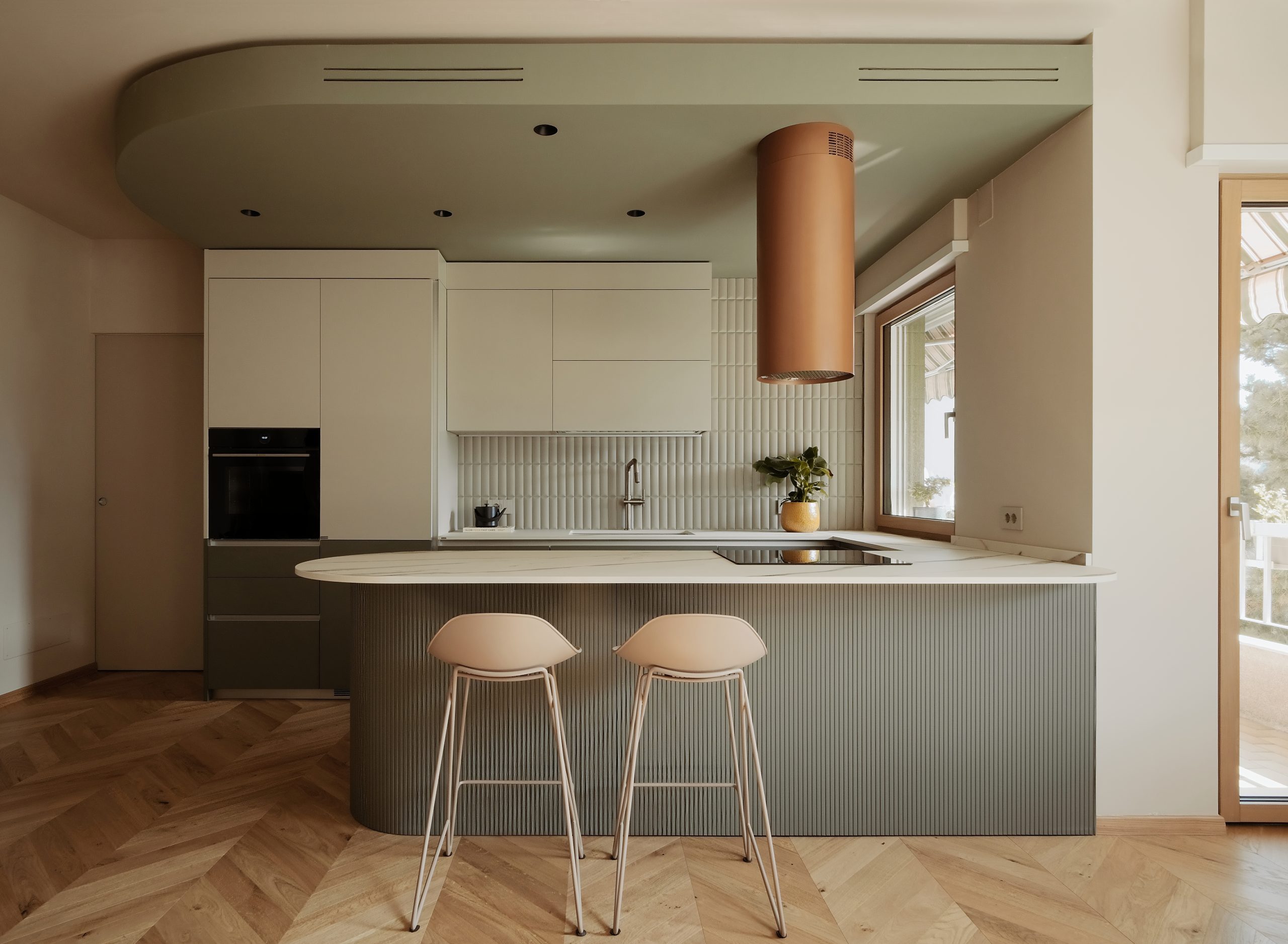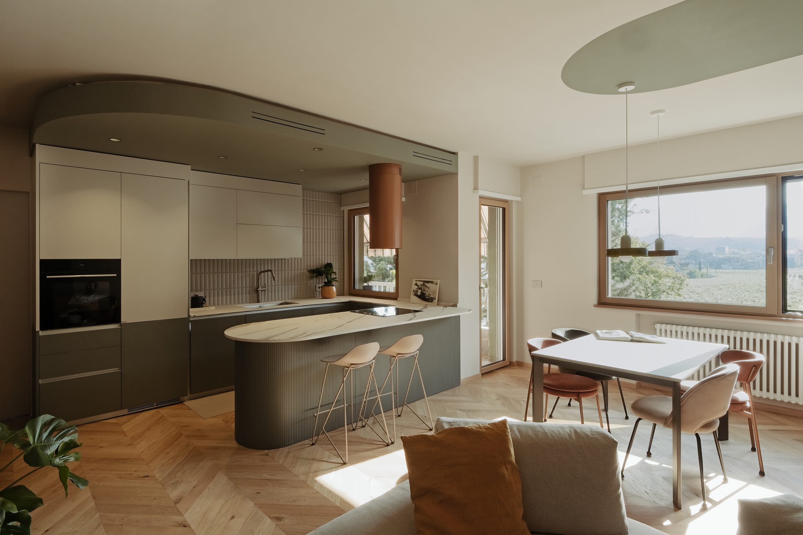 Il controsoffitto della cucina, elemento tecnico e al tempo stesso segno distintivo, segue la forma dell’isola centrale e diventa parte della continuità visiva della zona giorno. Le curve si estendono fino al salotto, coinvolgendo pareti e superfici, mentre macchie di colore incorniciano i corpi illuminanti. L'ambiente si apre poi su un balcone esposto a sud, con vista sulle vigne di Bolzano, che porta ulteriore luminosità all’insieme.