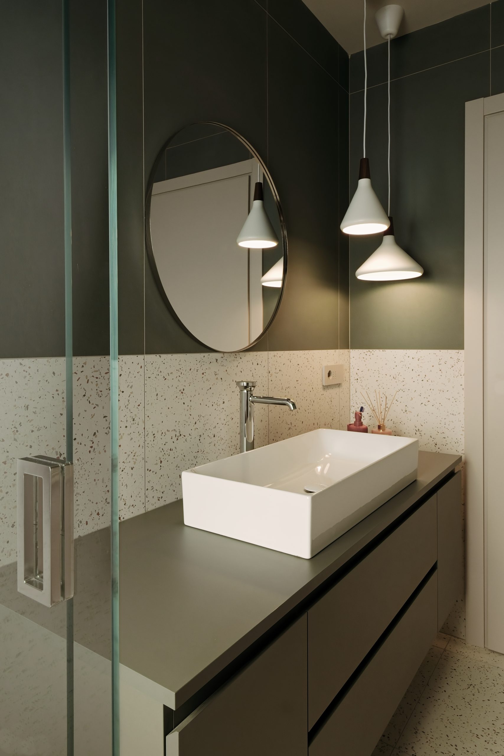 Dal corridoio si accede alla prima camera da letto, anch’essa affacciata sul balcone. Il percorso culmina nella master room, articolata in zona notte e bagno privato. In quest’ultimo, i toni vivaci della casa tornano attraverso un sapiente accostamento di superfici: piastrelle terrazzo più chiare per pavimento e parte delle pareti, e piastrelle verde prato nella parte superiore. L’elemento della doccia, arricchito da una cascata a muro, introduce un’idea di benessere che completa l’ambiente.