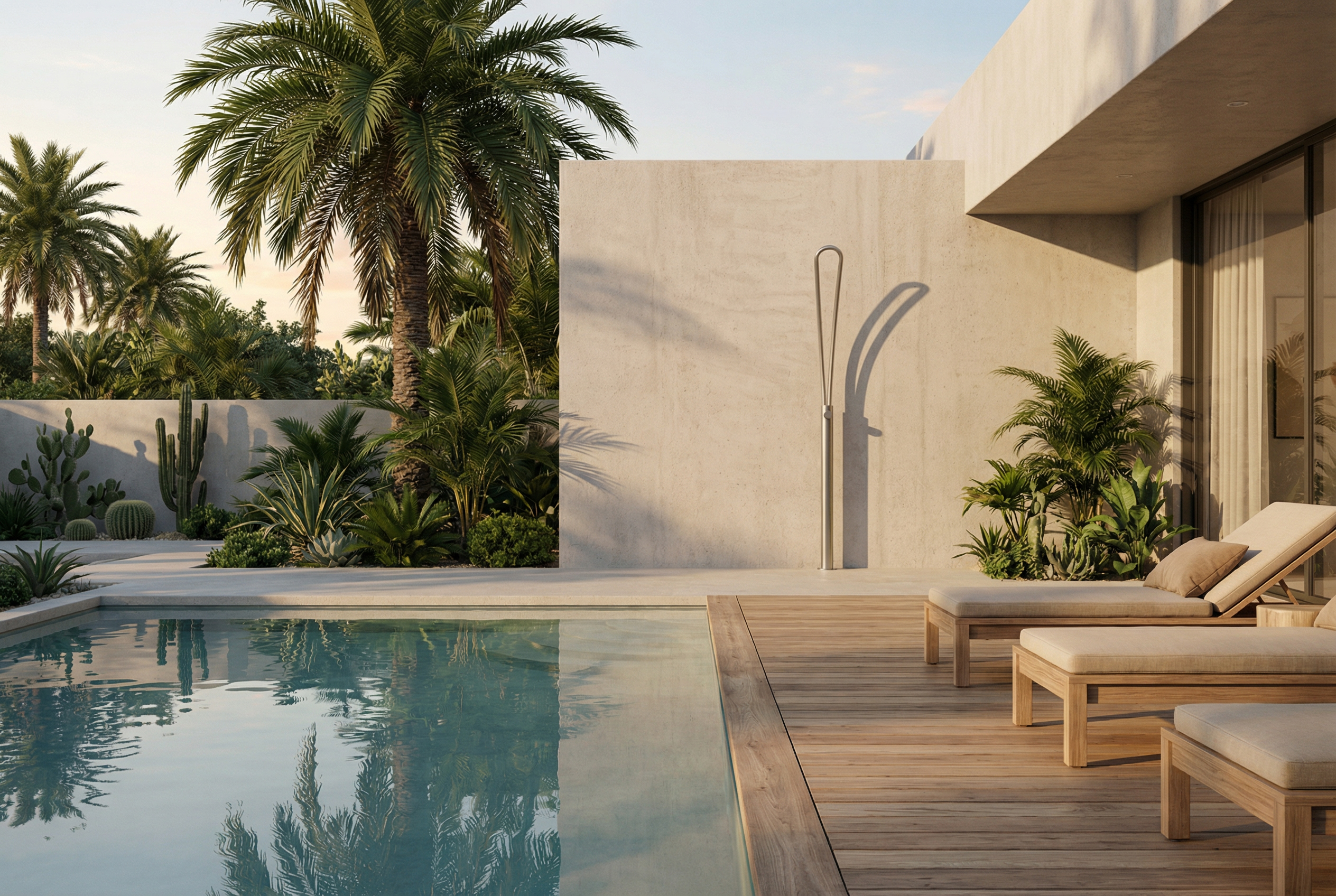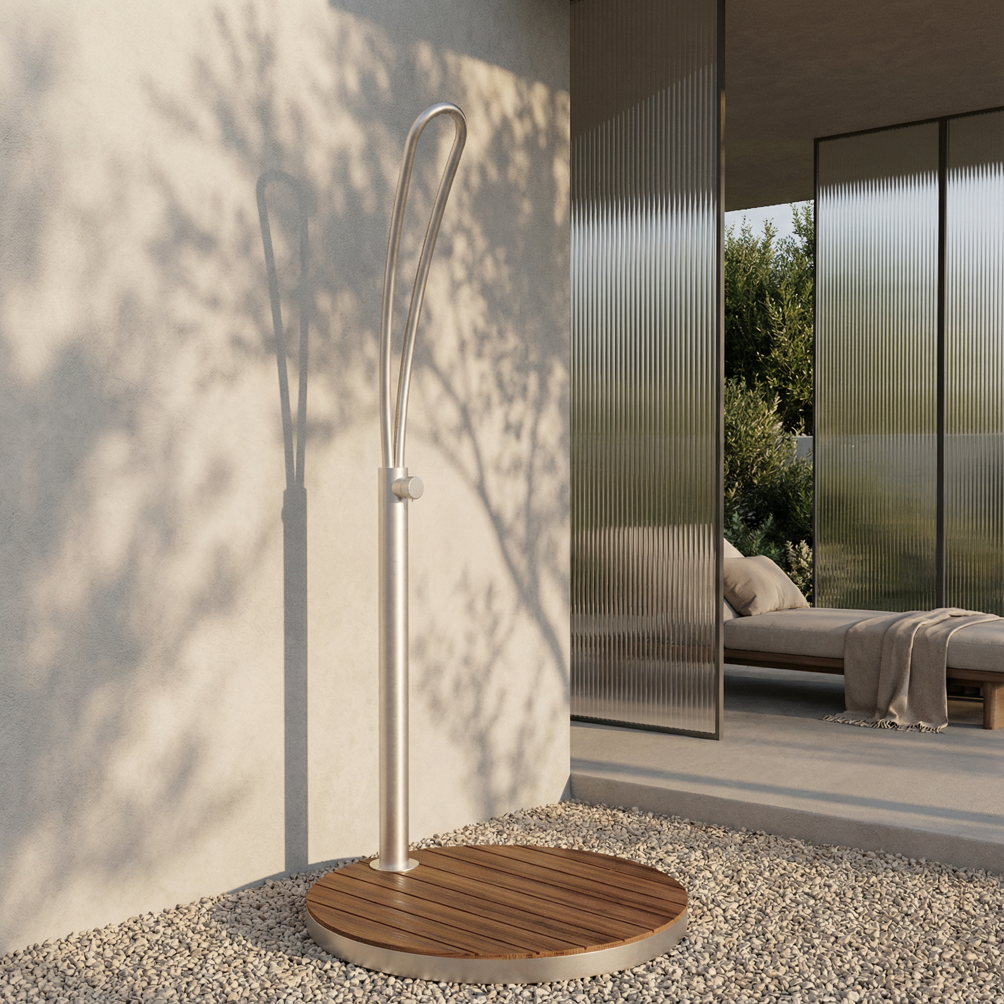 La versatilità è un altro punto di forza della Collezione Cruna, che si presenta sul mercato in tre distinte configurazioni per adattarsi a ogni esigenza progettuale. È disponibile nella versione a parete, per chi cerca un’integrazione architettonica discreta, nella variante freestanding per una maggiore libertà di posizionamento, e infine nella versione freestanding arricchita da una pedana in Teak. Quest’ultima opzione combina la fredda eleganza dell’acciaio con il calore materico del legno, scelto specificamente per la sua robustezza e il suo fascino contemporaneo. Più che un semplice prodotto tecnico, Cruna si configura come un’esperienza che si integra perfettamente nel paesaggio, portando raffinatezza, benessere e un equilibrio sofisticato tra natura e design negli spazi outdoor.