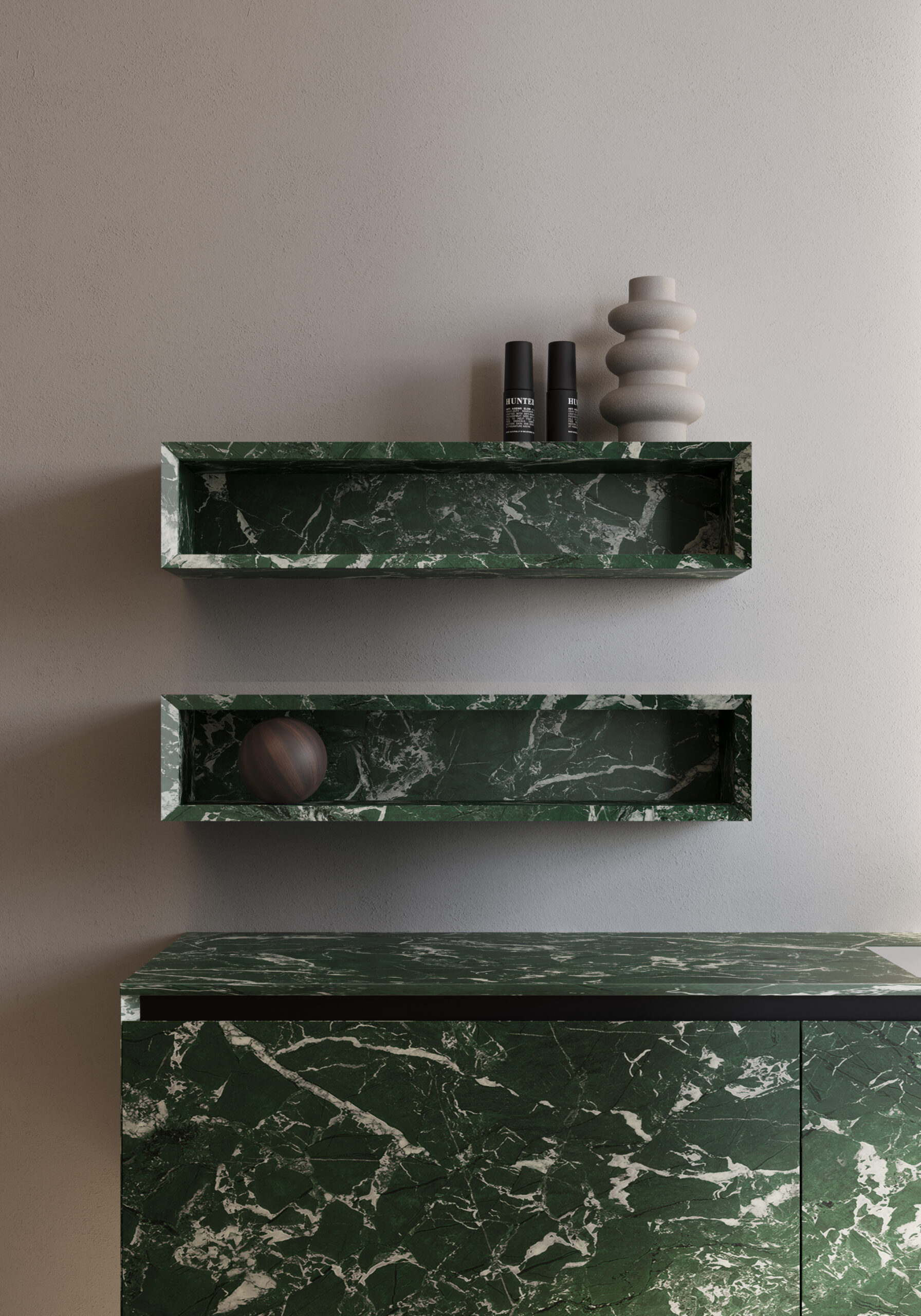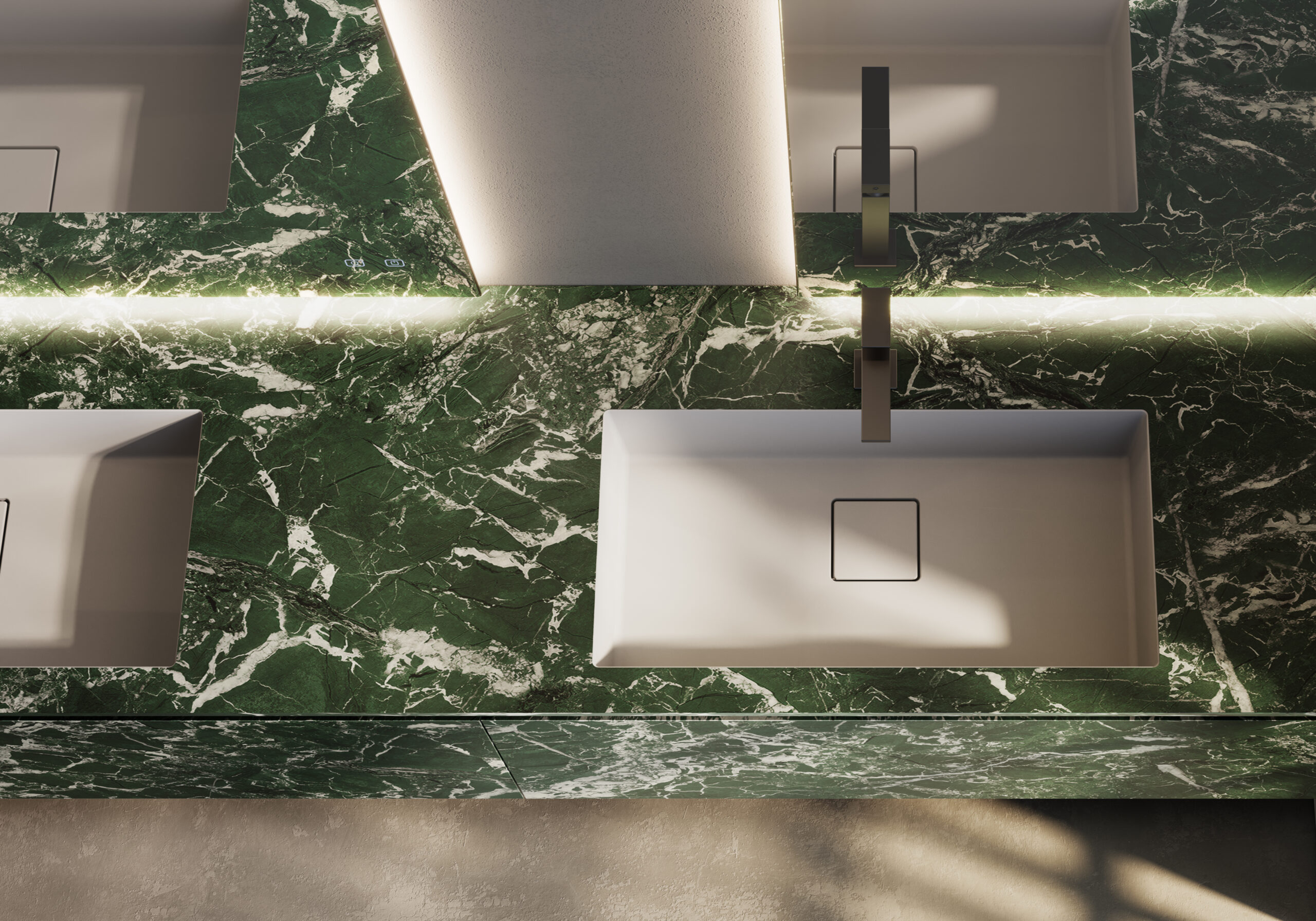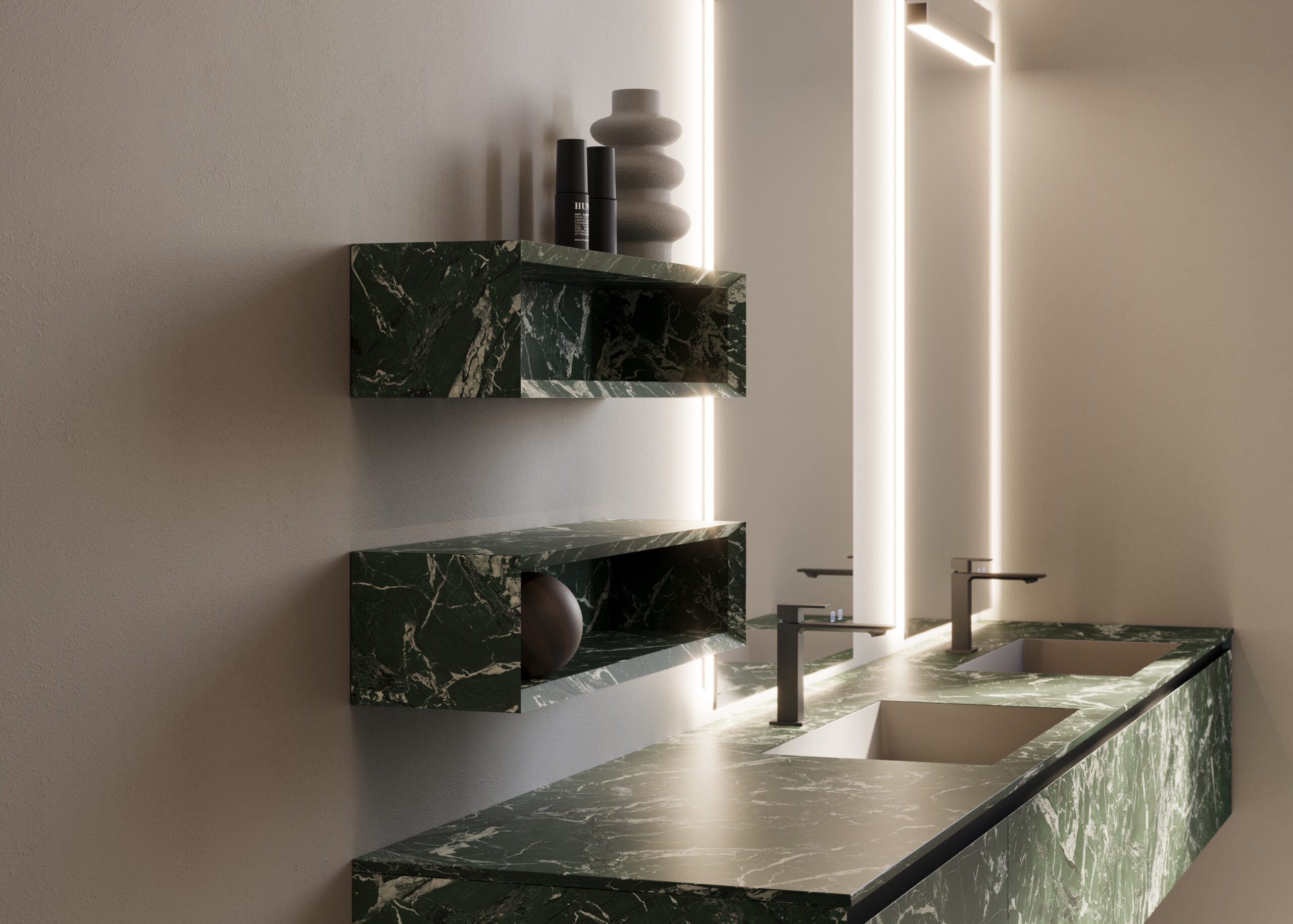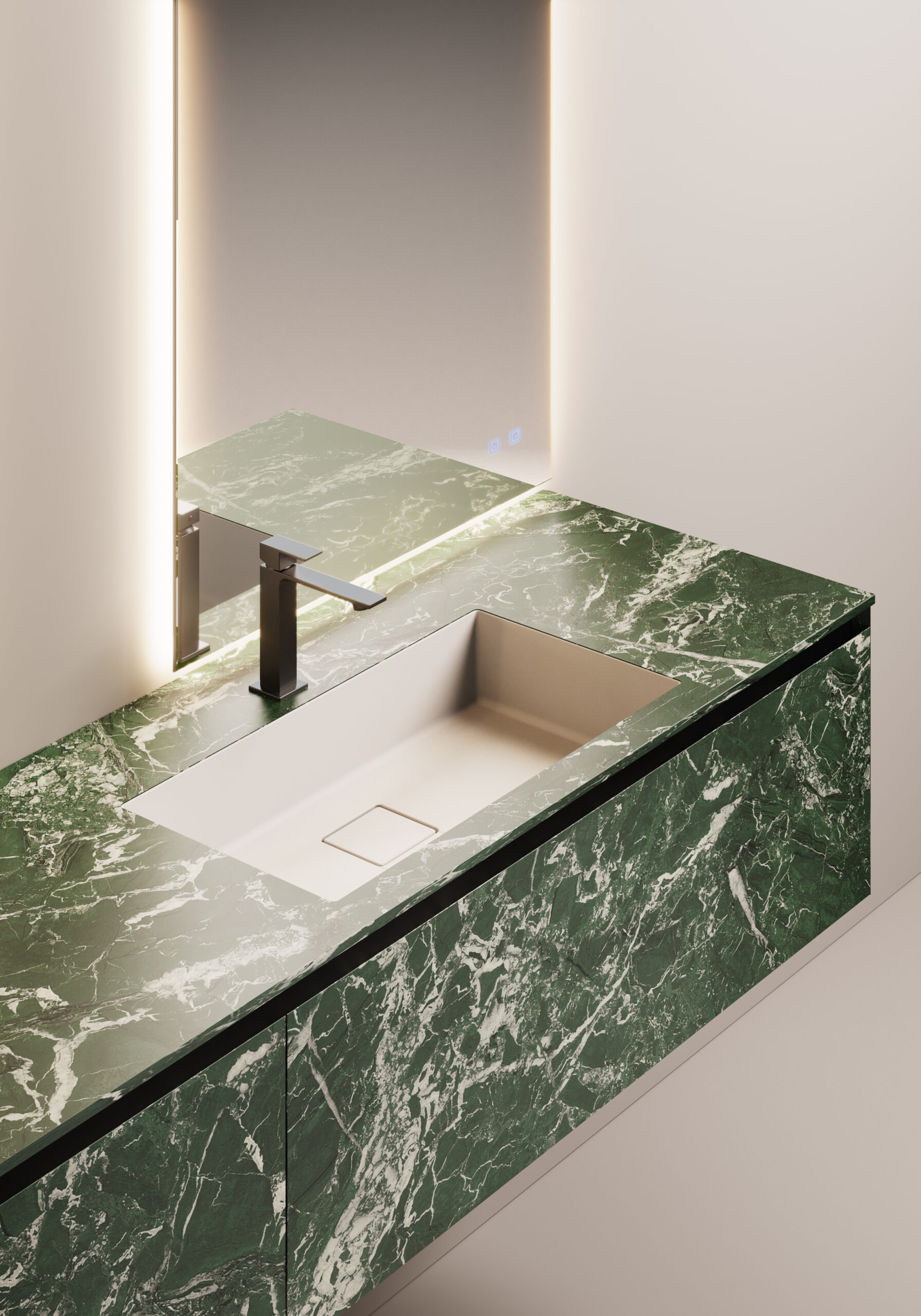 Sul fronte materico, la collezione si arricchisce di nuove finiture che ne accentuano il carattere sofisticato. I legni Rovere Caffè e Rovere Termo, lavorati con cura sartoriale, esprimono una qualità tattile e visiva attraverso la venatura “in biglia”, estesa con continuità su frontali e fianchi terminali: un dettaglio che rafforza la percezione di unicità del prodotto. A questi si affiancano i laminati Unicolor HPL effetto marmo (Verde Dolomiti, Grigio Yule, Rosso Maya, Bianco Olimpo) e le tinte unite effetto polvere, declinate in tonalità evocative come Scintilla, Firmamento, Lampo, Bagliore e Meteora.