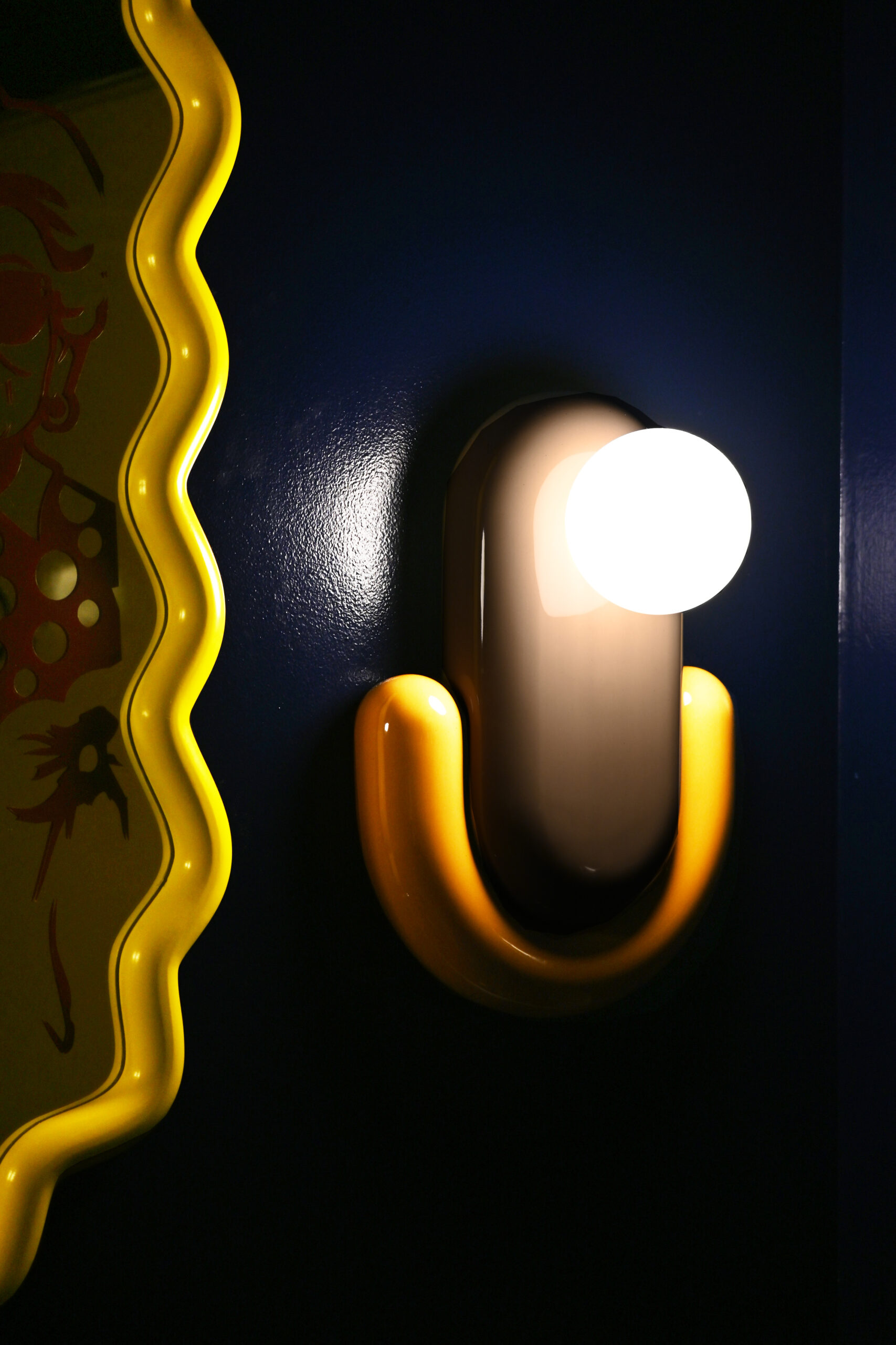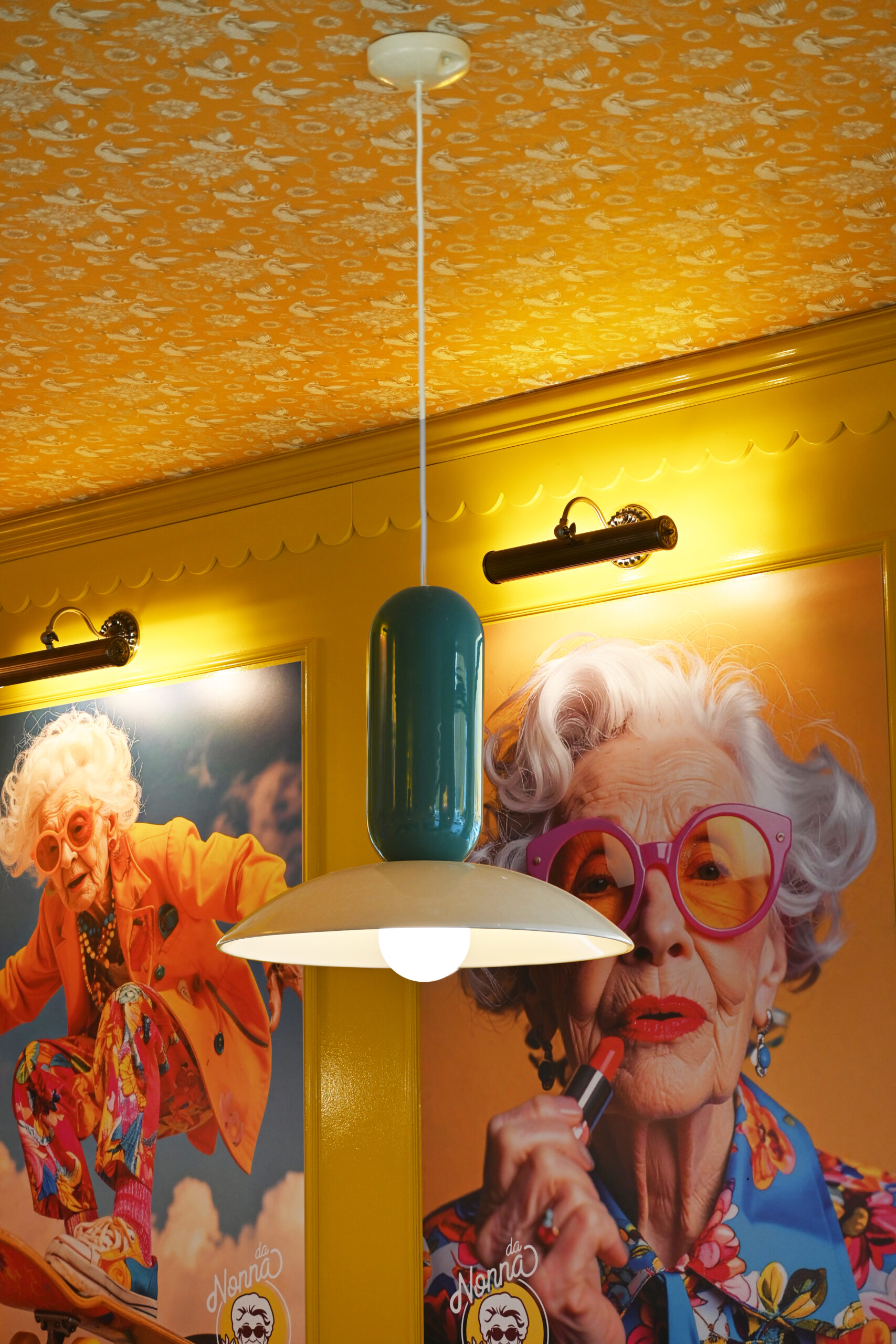 In questo sistema cromatico, la luce assume un ruolo centrale nella costruzione dell’atmosfera. Lampade sospese e corpi illuminanti dal carattere rétro scandiscono lo spazio con accenti puntuali, esaltando materiali e texture e guidando lo sguardo verso i grandi ritratti della nonna: elementi scenografici che abitano l’ambiente con una presenza al tempo stesso ironica e affettuosa.