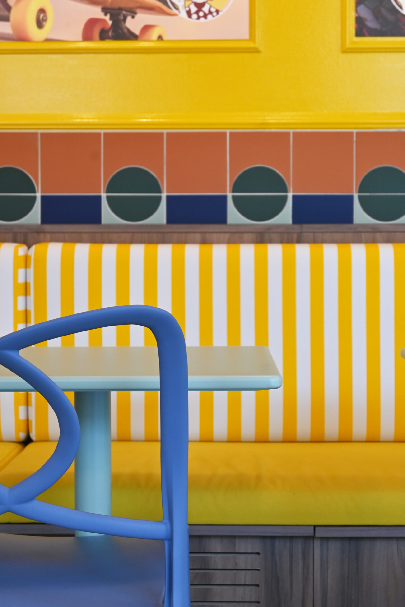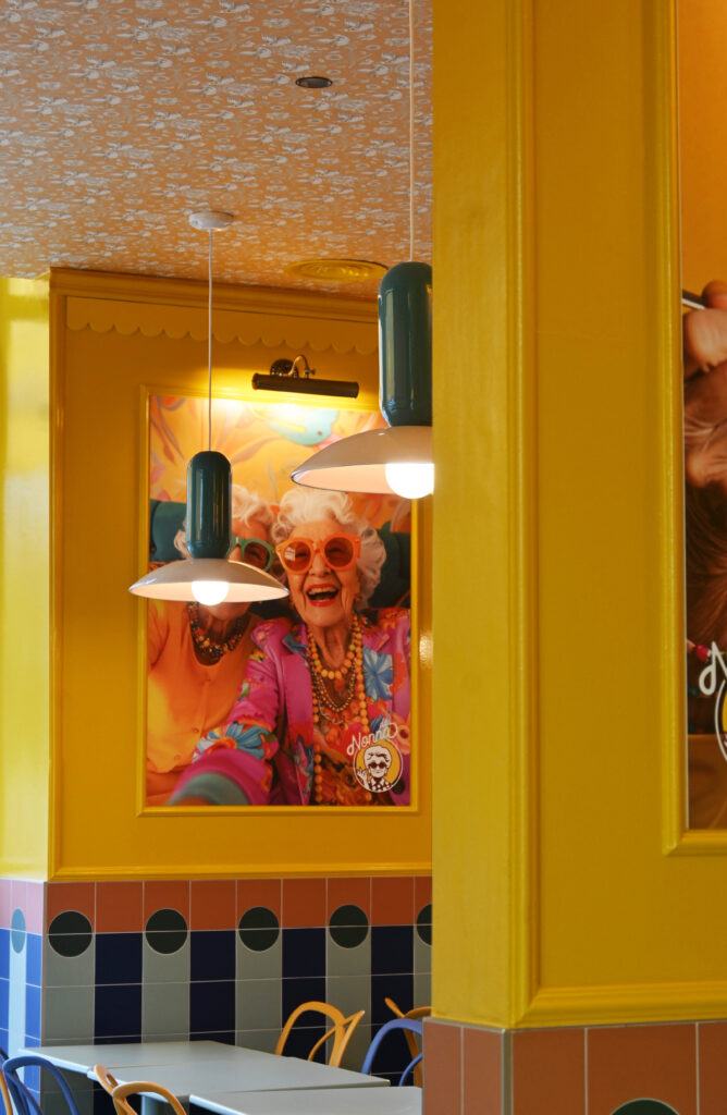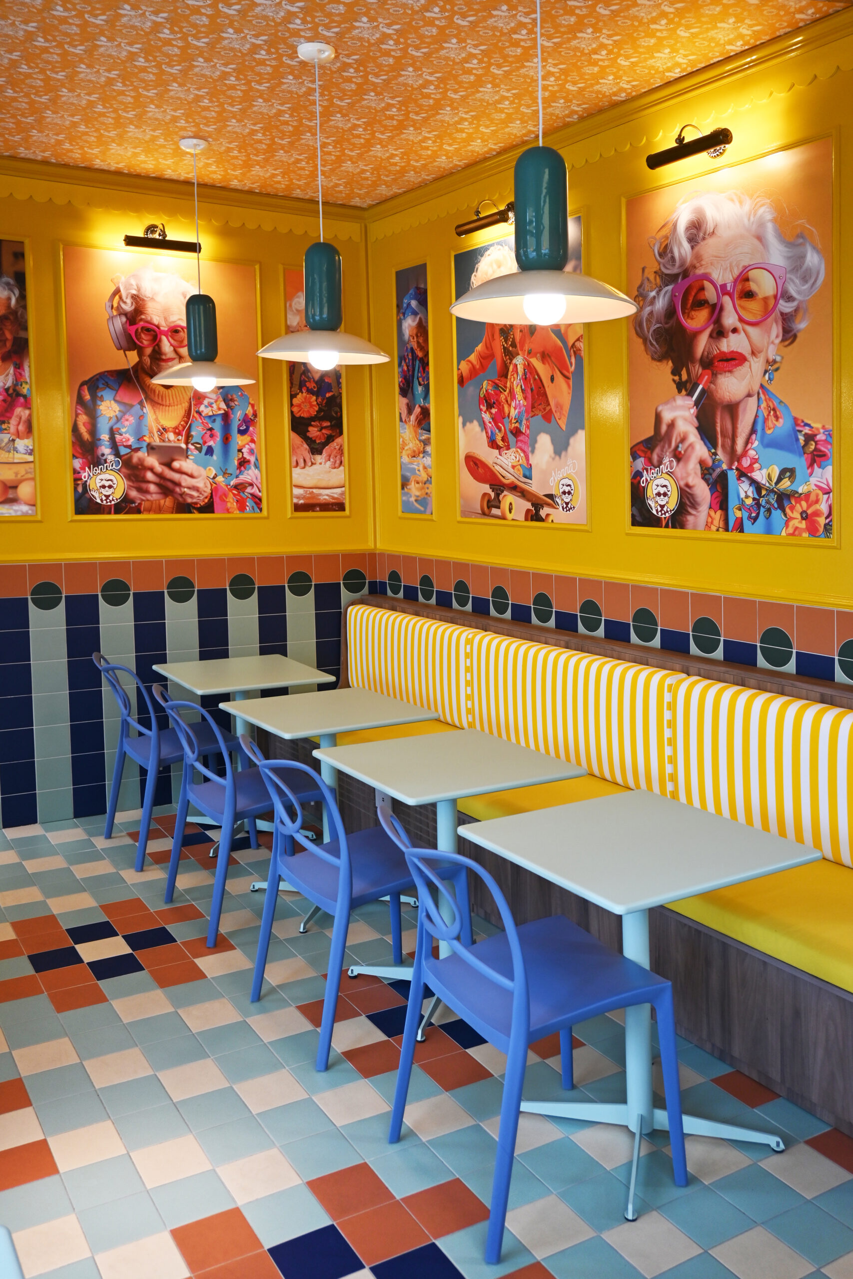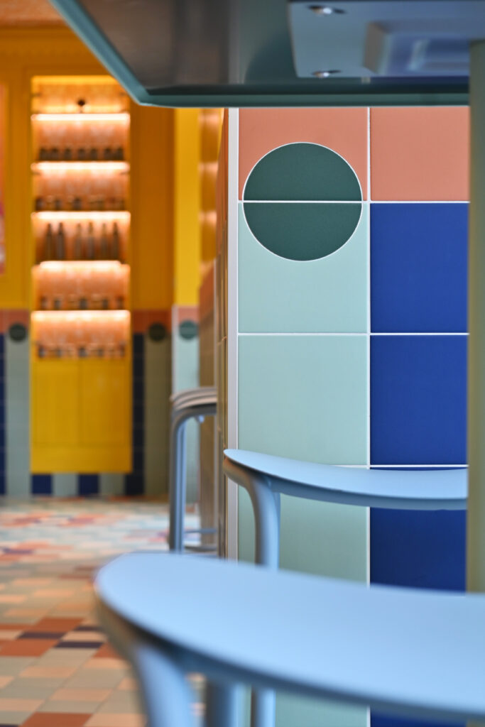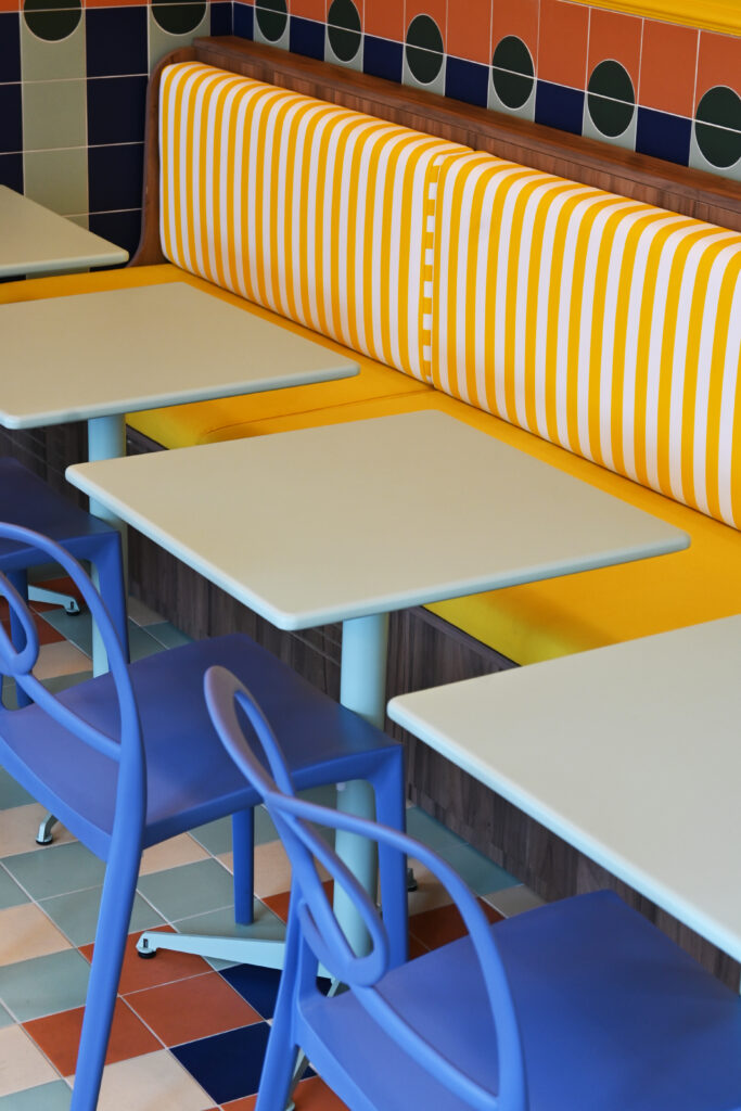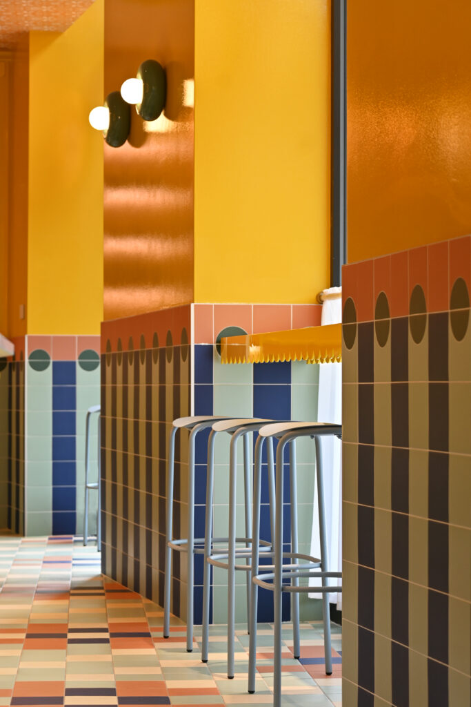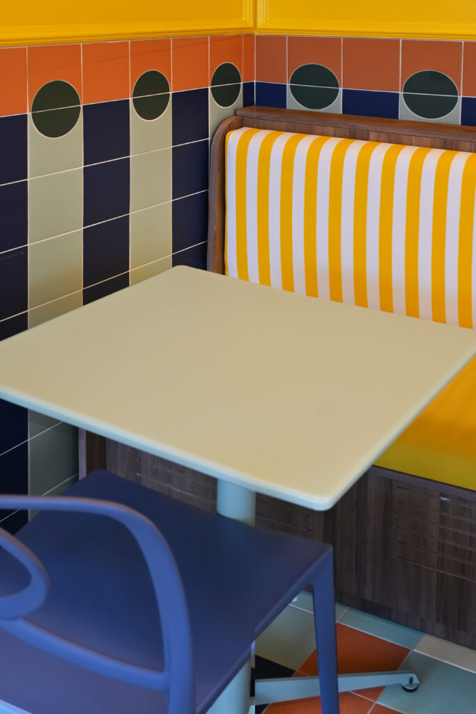 Gli interni si articolano attraverso un uso espressivo e consapevole del colore, vero fulcro della composizione. Le tonalità calde del giallo si intrecciano con accenti di rosa, blu e verde menta, dando vita a una palette vivace ma equilibrata che attraversa superfici, arredi e rivestimenti ceramici. Le piastrelle geometriche e lucide costruiscono un ritmo visivo che richiama le cucine mediterranee, mentre panche a righe e sedute pastello introducono un registro pop che rende lo spazio immediatamente riconoscibile e accessibile.