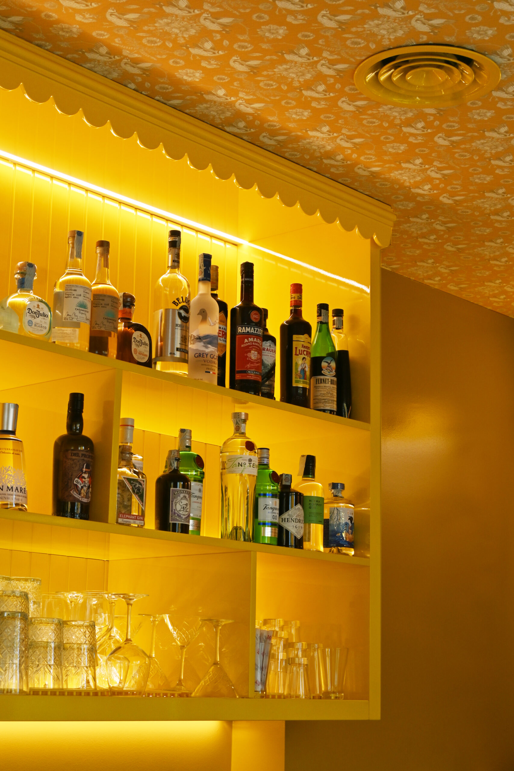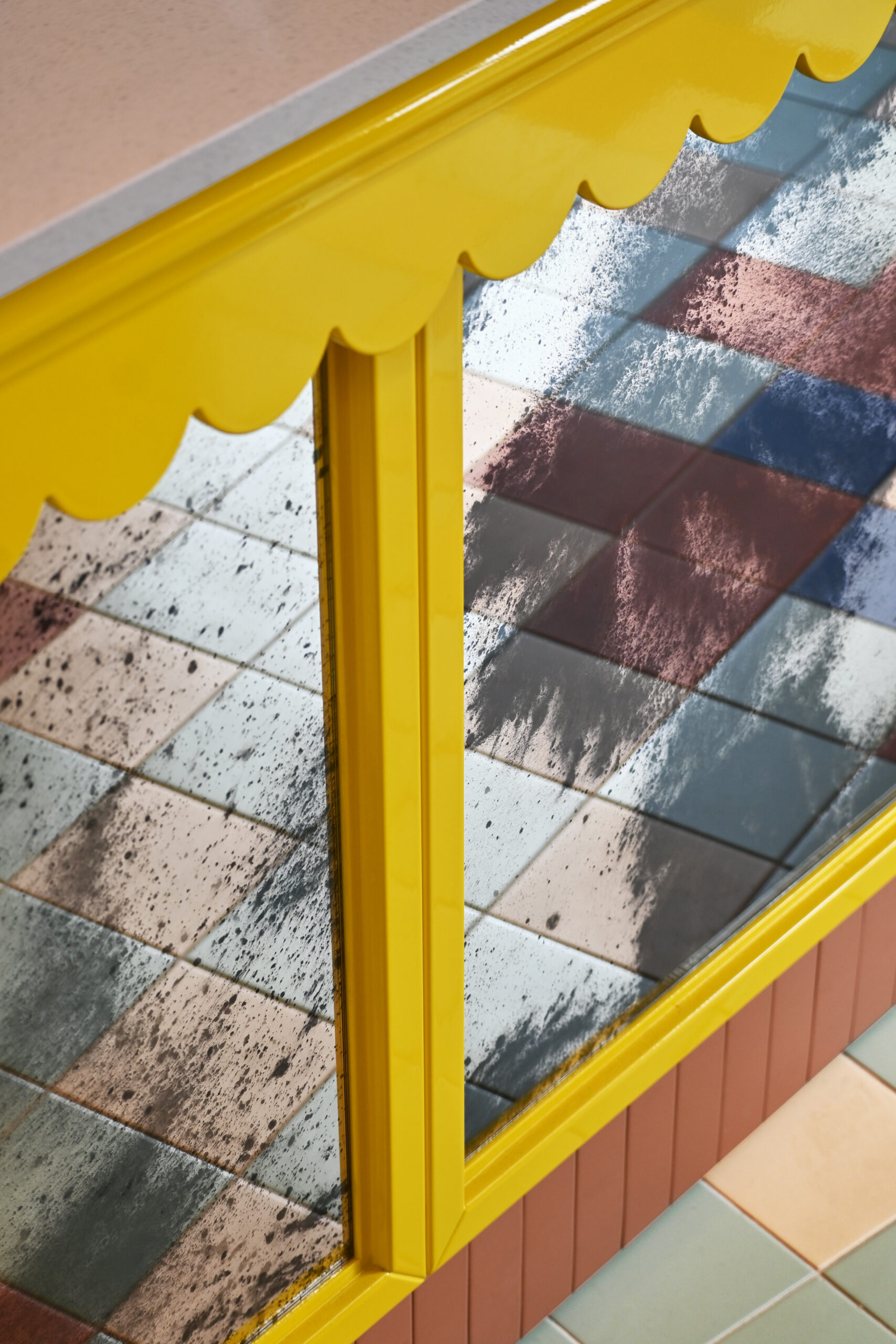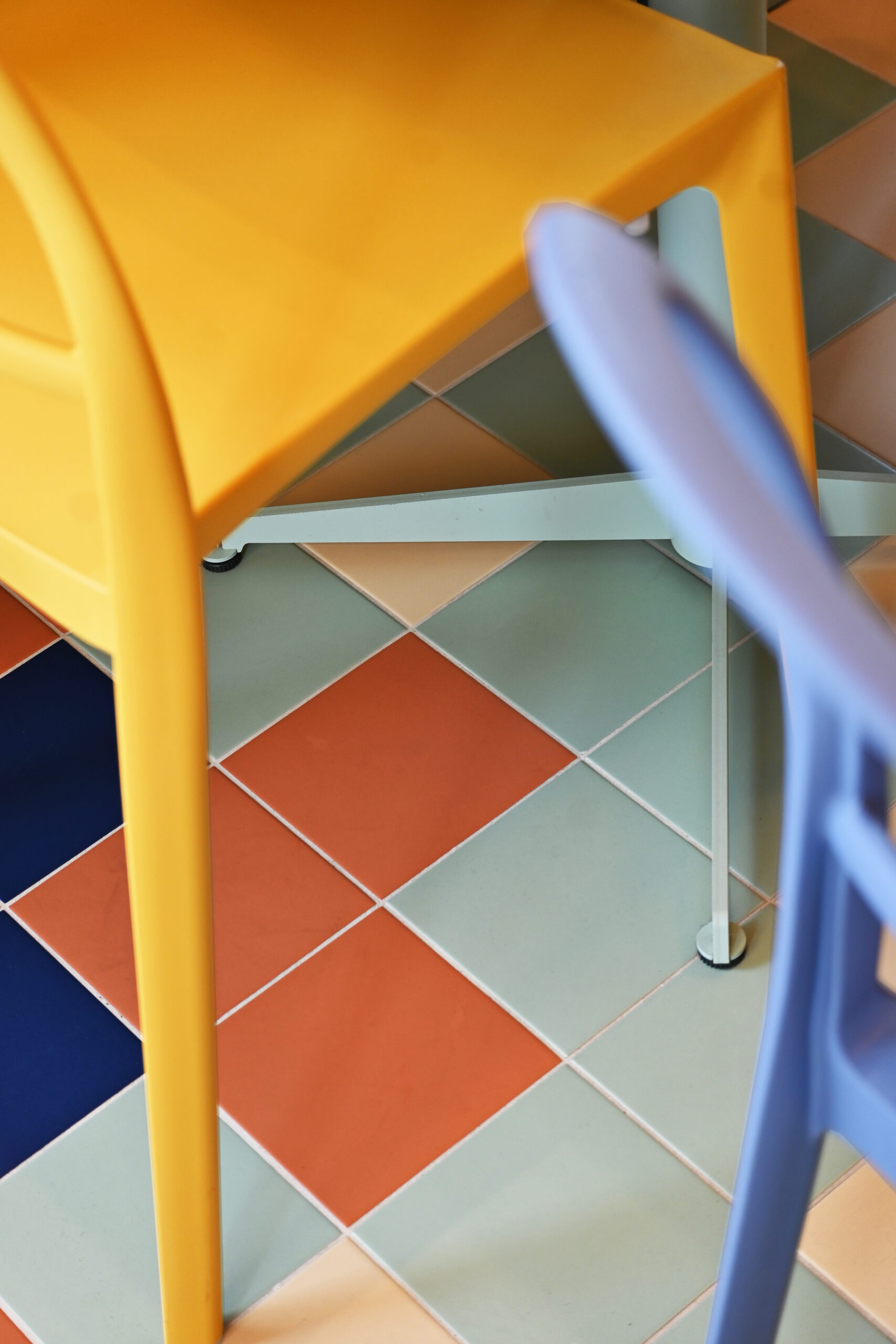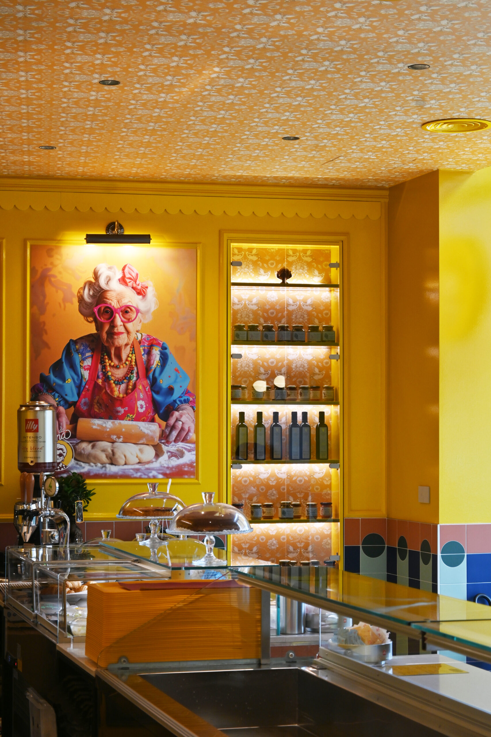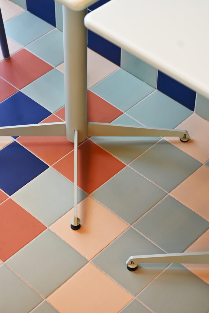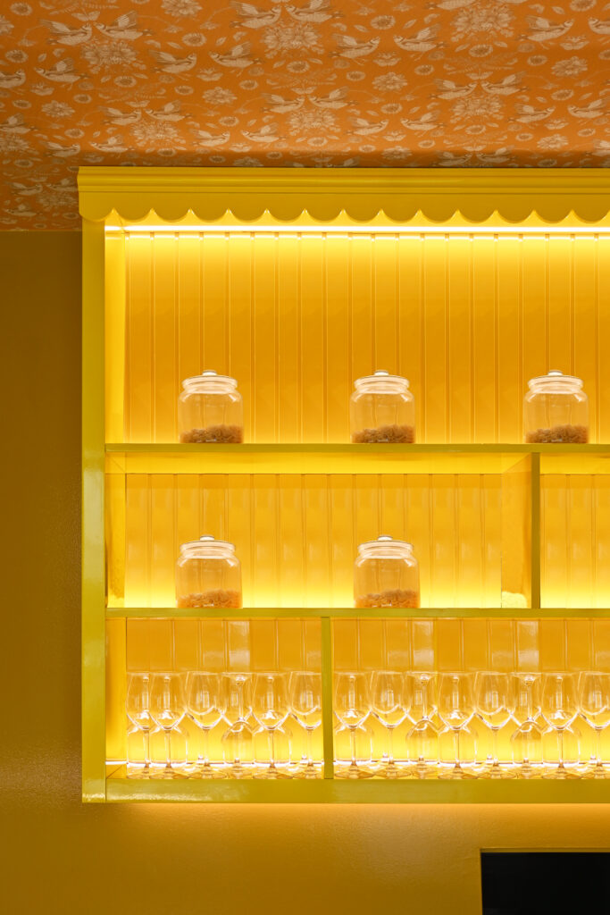 Gli interni si articolano attraverso un uso espressivo e consapevole del colore, vero fulcro della composizione. Le tonalità calde del giallo si intrecciano con accenti di rosa, blu e verde menta, dando vita a una palette vivace ma equilibrata che attraversa superfici, arredi e rivestimenti ceramici. Le piastrelle geometriche e lucide costruiscono un ritmo visivo che richiama le cucine mediterranee, mentre panche a righe e sedute pastello introducono un registro pop che rende lo spazio immediatamente riconoscibile e accessibile.
