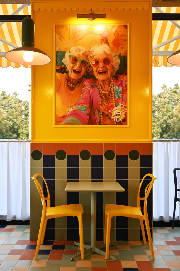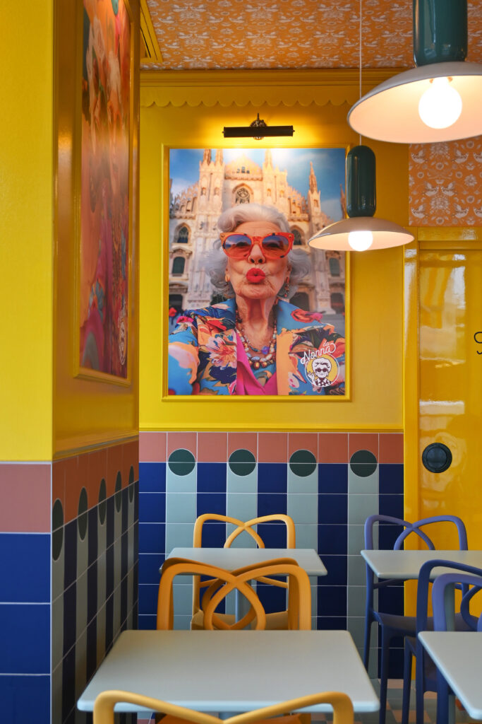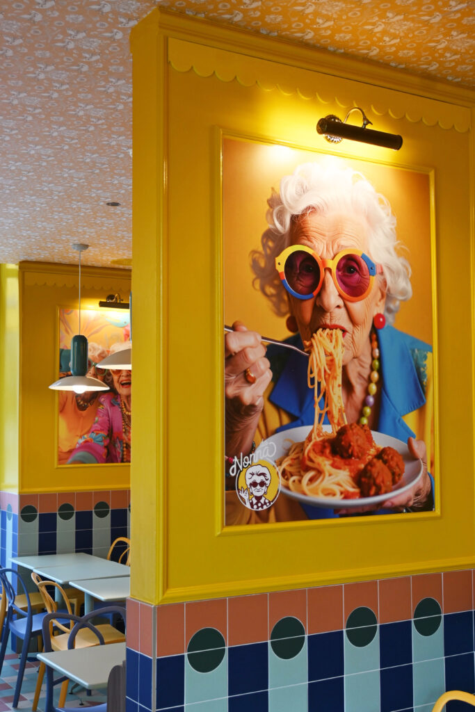 Il punto di partenza è la figura archetipica della “nonna”, evocata non tanto in chiave nostalgica quanto come simbolo affettivo universale, portatore di valori come convivialità, cura e ritualità quotidiana. Attorno a questa presenza evocativa si costruisce un racconto visivo stratificato, in cui l’estetica domestica viene reinterpretata con sensibilità contemporanea, trasformando il ristorante in uno spazio narrativo in cui progetto e atmosfera si fondono.
