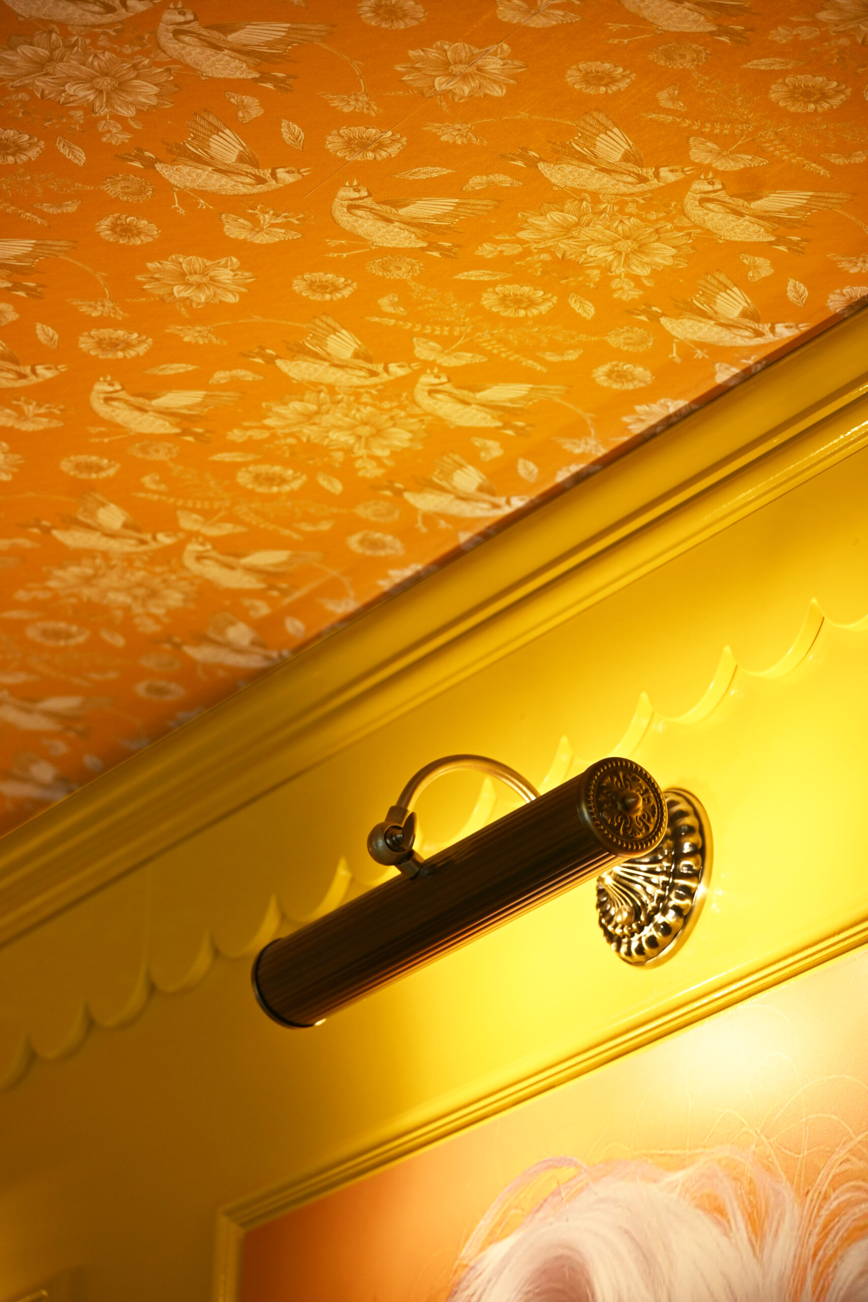 Il progetto gioca consapevolmente sul dialogo tra registri differenti: i richiami domestici convivono con segni grafici contemporanei, i motivi floreali del soffitto si intrecciano con le geometrie delle superfici ceramiche, mentre cornici decorative e dettagli smerlati introducono una dimensione quasi teatrale. Ne deriva un sistema di contrasti – tra memoria e immaginario pop, tra intimità e spettacolo – che restituisce uno spazio dinamico, stratificato e profondamente umano.