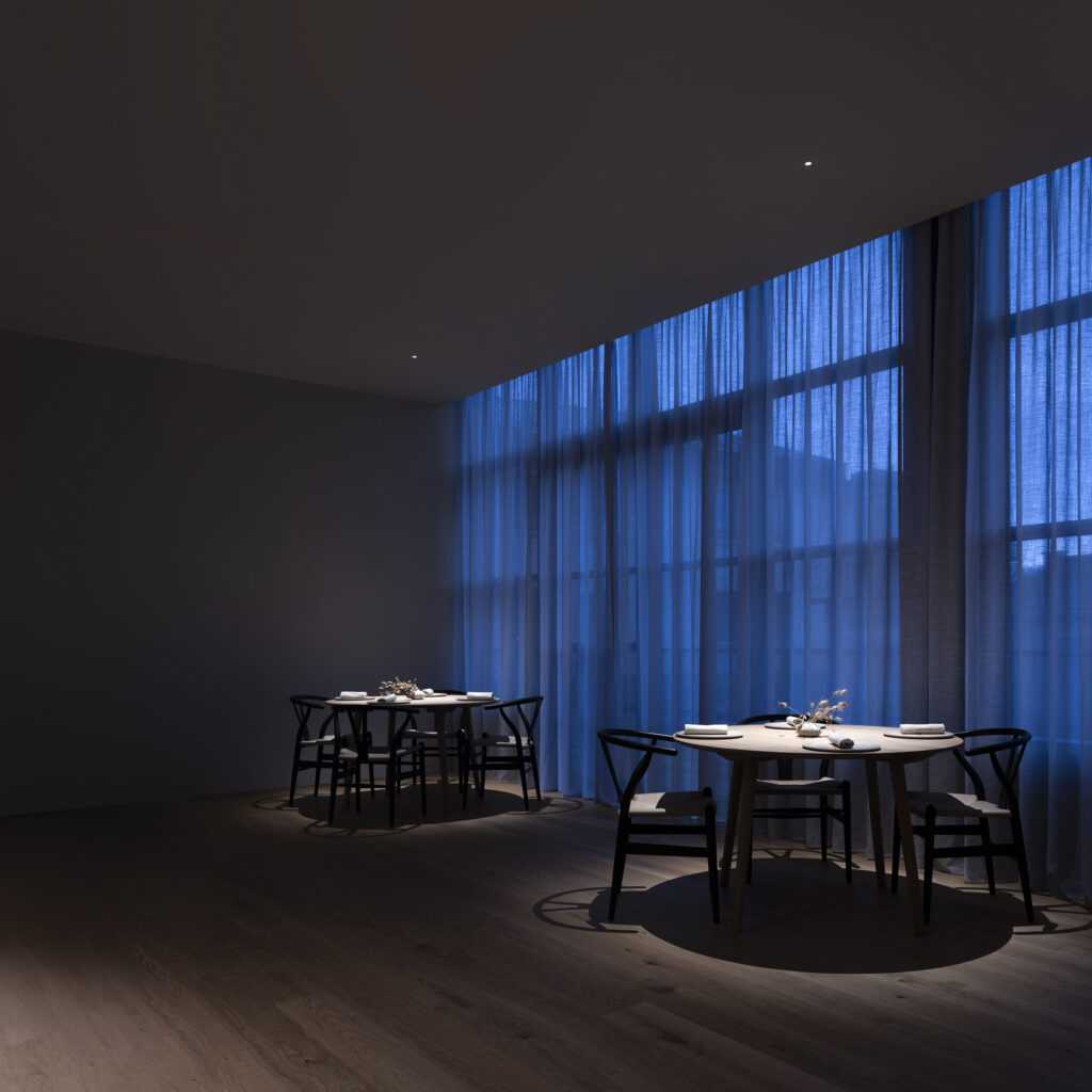 La luce naturale gioca un ruolo fondamentale nel progetto, trasformando continuamente la percezione dell’ambiente nel corso della giornata e delle stagioni. Le grandi vetrate amplificano il rapporto tra interno ed esterno, mettendo in risalto le venature del legno, le superfici in pietra e la qualità artigianale degli arredi. Al calar della sera, l’illuminazione restituisce un’atmosfera più intima e raccolta, in cui i volumi si dissolvono e l’attenzione si concentra sui dettagli e sulle linee degli arredi.