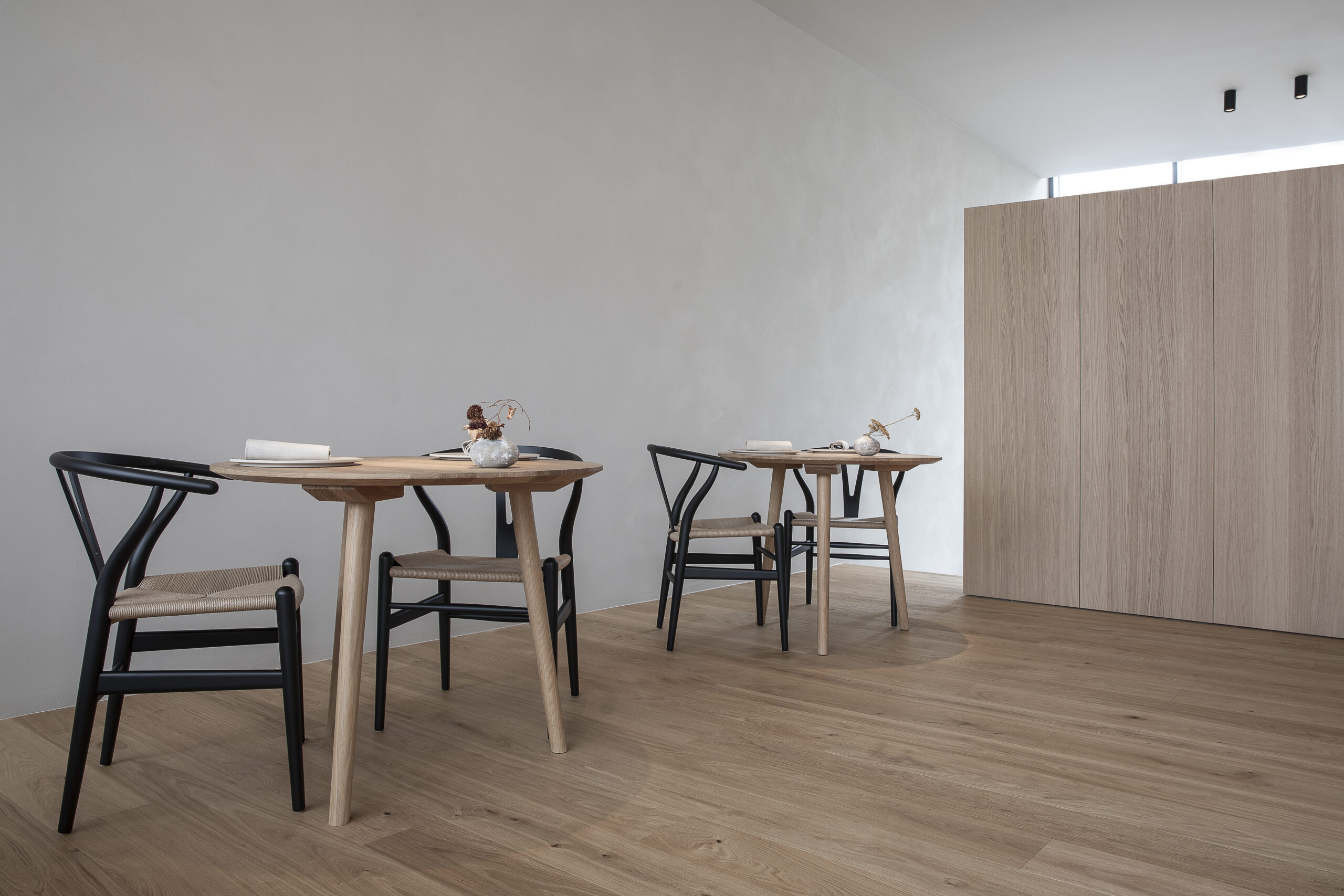 Il ristorante ha sede in un ex pennellificio completamente riqualificato nell’area di Milano Certosa District (via Varesina 177) e si distingue per essere un luogo che mette in relazione due linguaggi architettonici distinti: l’anima storica di un edificio industriale in mattoni del secolo scorso e la visione contemporanea, espressa con l’inserimento di elementi in vetro e acciaio. Un contesto ideale per accogliere la celebre sedia CH24 Wishbone Chair, capace di attraversare epoche e stili grazie alla forte e rappresentativa identità che la contraddistingue. Il set di sedie, selezionate nella finitura nero faggio con seduta in corda naturale, accompagna gli otto tavoli in rovere posizionati nell’ampia sala da pranzo con vista cucina.