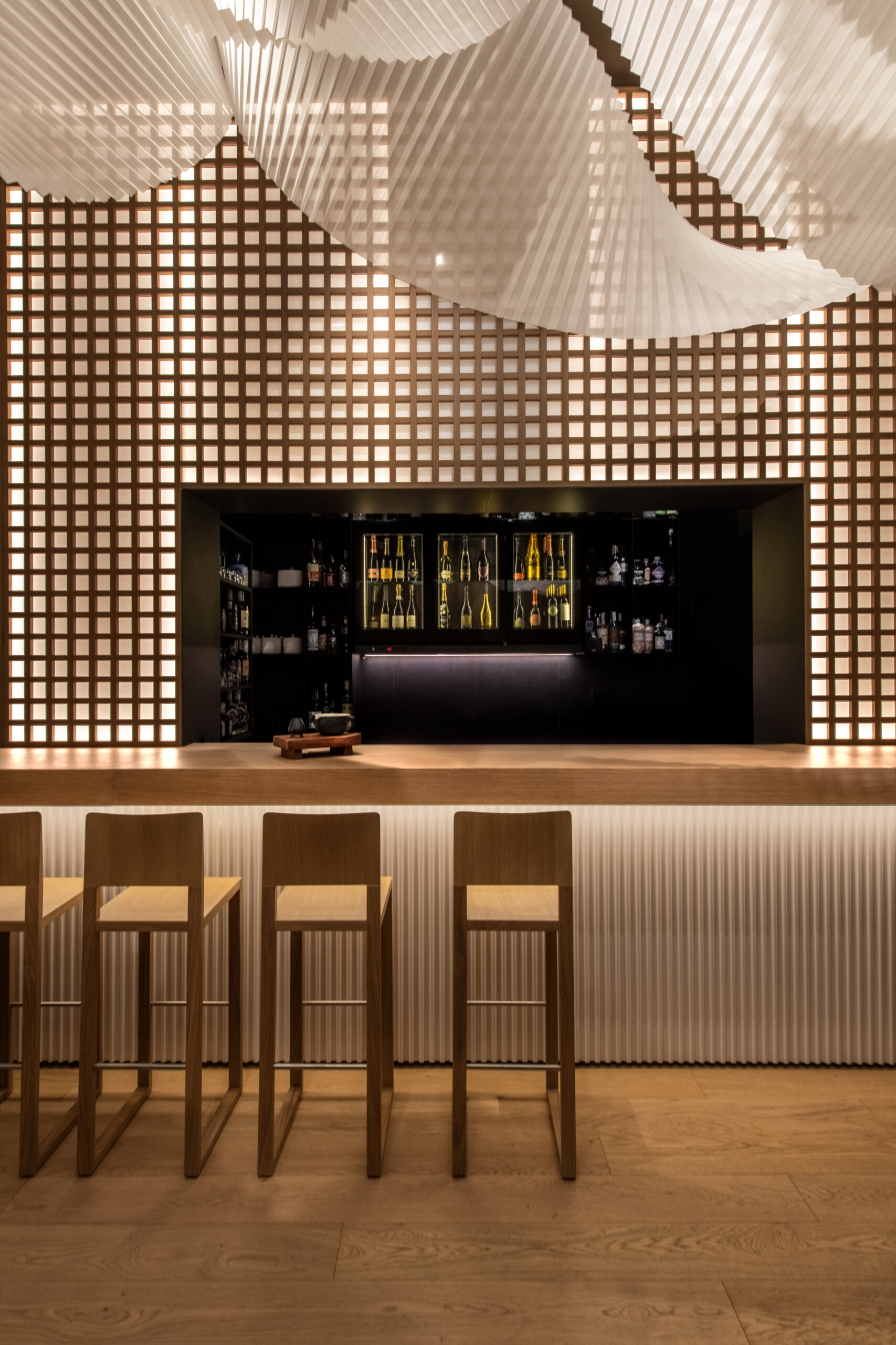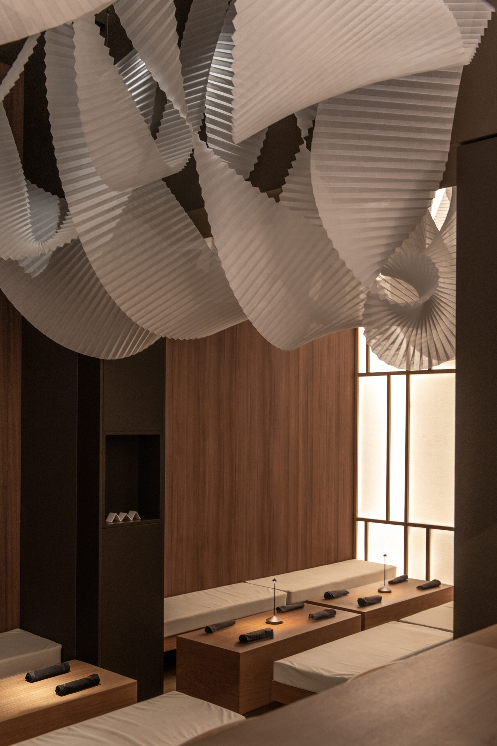 Elemento iconico di HIO Oriental Bar è il soffitto in tessuto, modellato come una struttura leggera e dinamica. Ispirato all’arte dell’origami, trasforma un materiale morbido in un sistema di pieghe fluide e sospese. Non si tratta di un semplice rivestimento, ma di un vero e proprio paesaggio aereo che introduce movimento e tridimensionalità.