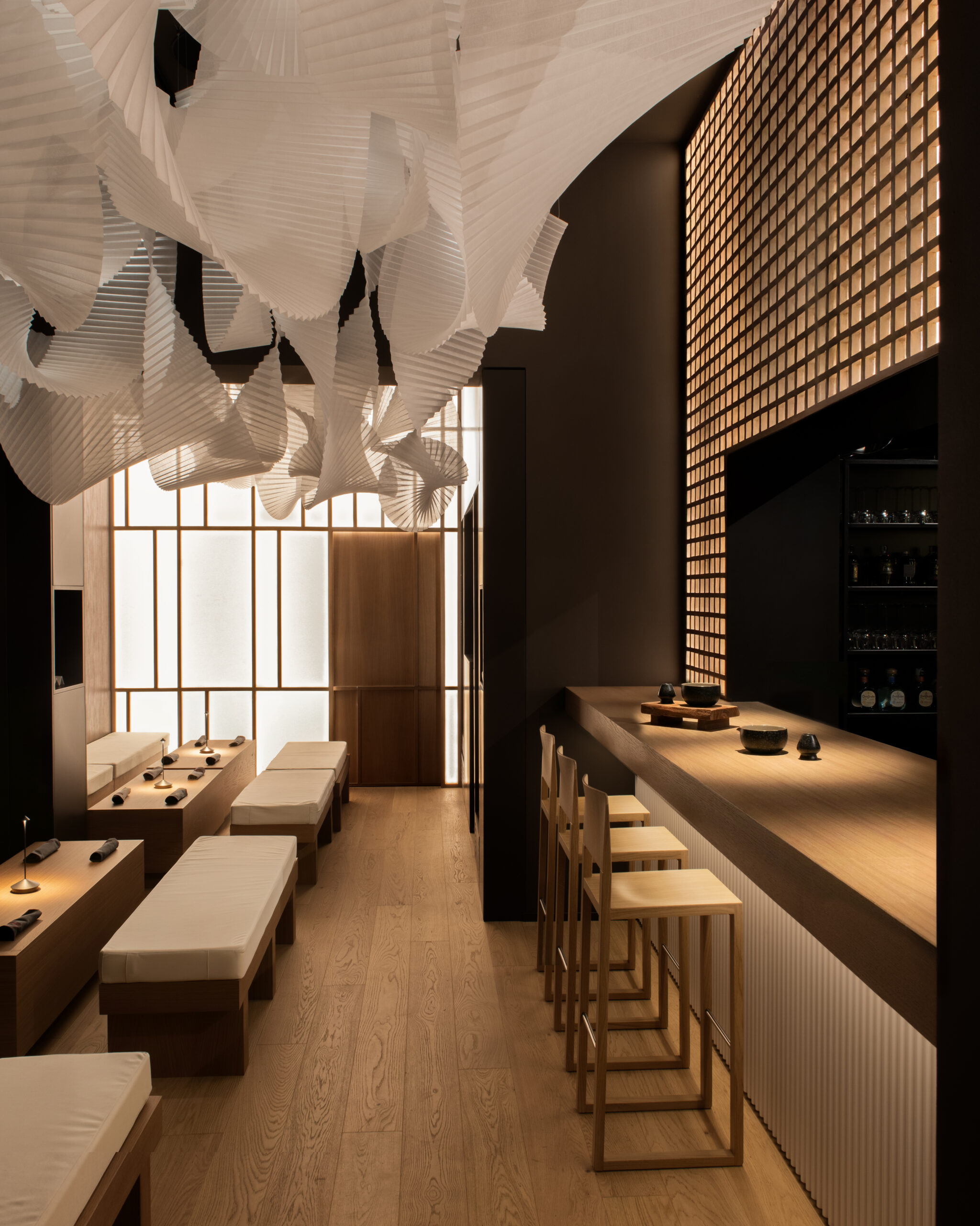 L’arredo segue una logica di riduzione all’essenziale: panche basse, tavolini discreti, volumi compatti che favoriscono una convivialità raccolta, in linea con lo spirito delle izakaya giapponesi. L’assenza di elementi superflui valorizza il vuoto come spazio attivo, come pausa visiva e mentale.