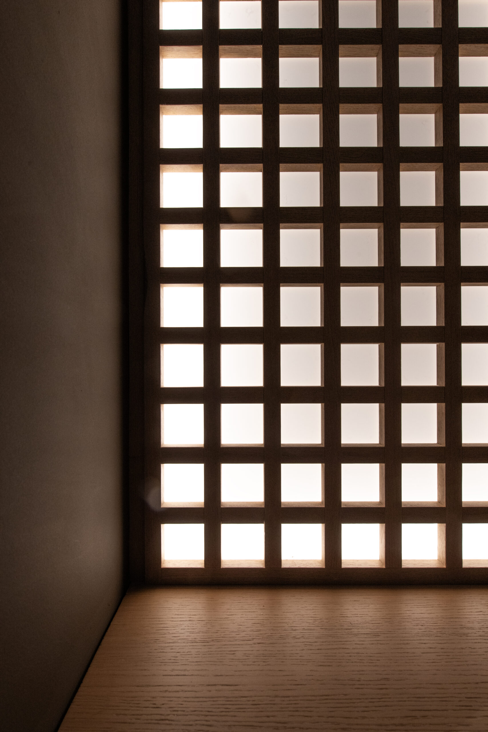 I pannelli a parete reinterpretano le tradizionali schermature giapponesi in carta di riso attraverso una trama geometrica rigorosa, declinata con materiali contemporanei. La griglia diventa principio ordinatore, espressione di disciplina formale e controllo proporzionale.