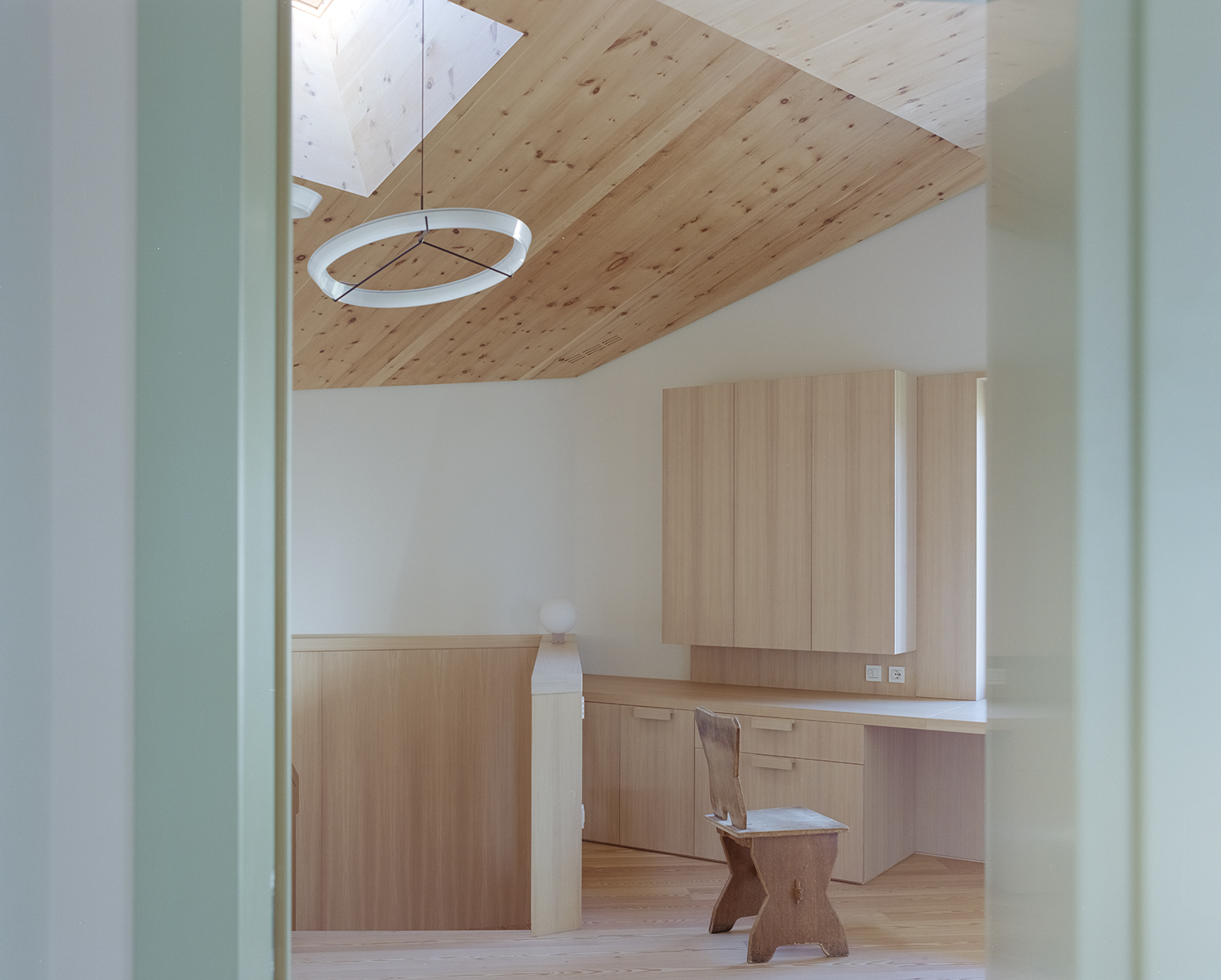 Il piano superiore ospita la zona notte, articolata in quattro camere matrimoniali. La suite padronale, dotata di bagno privato e cabina armadio, è illuminata da un grande lucernario e da due aperture laterali. Completano il livello una camera più piccola, due stanze affacciate su una terrazza coperta condivisa e i relativi servizi. Tutti gli ambienti sono collegati da un’ampia anticamera pensata come spazio per la lettura e la scrittura, caratterizzata da un soffitto rivestito in cirmolo, il cui profumo e la presenza dei nodi rosso-bruni evocano l’atmosfera delle case alpine e i ricordi d’infanzia del proprietario.