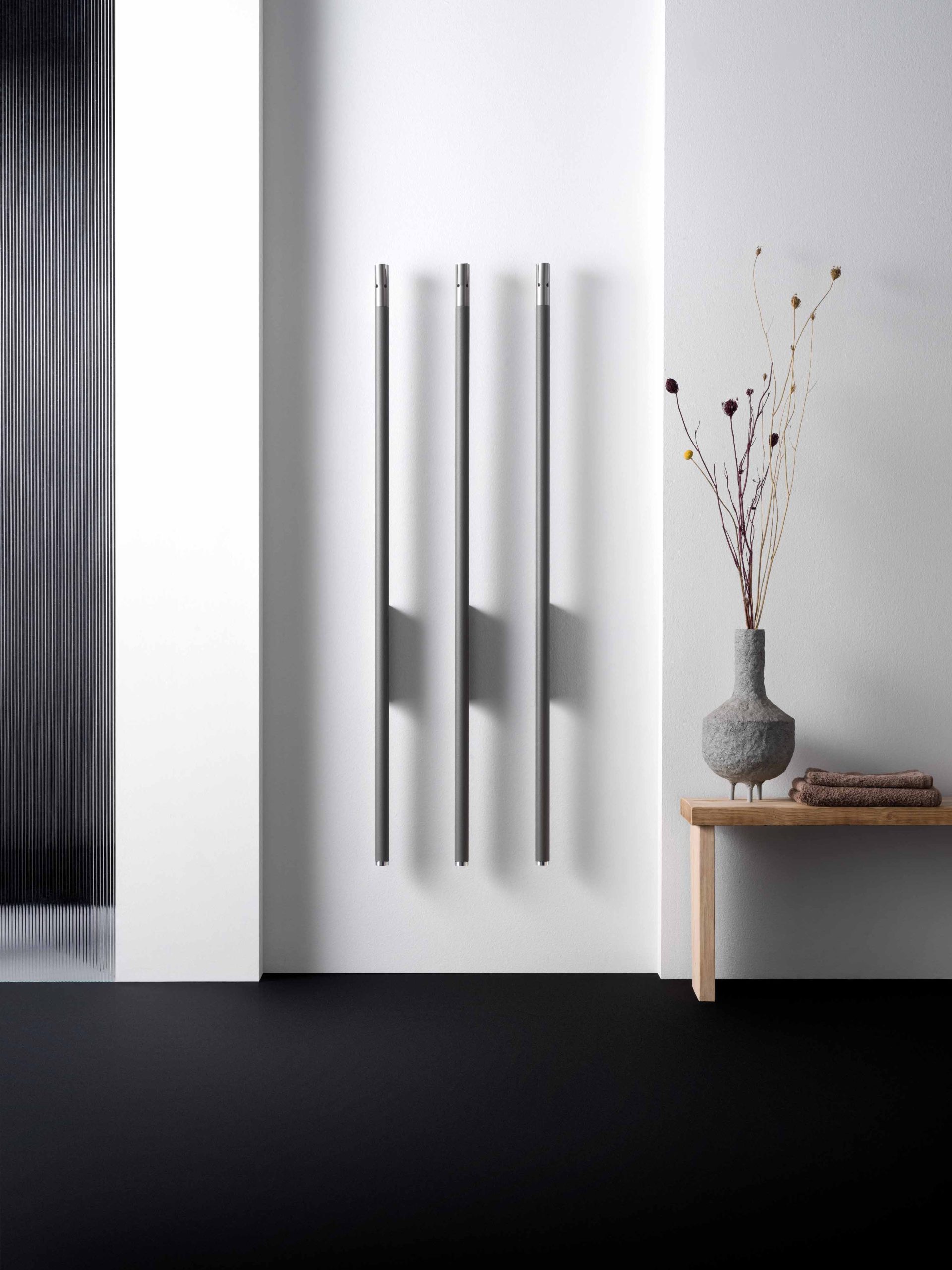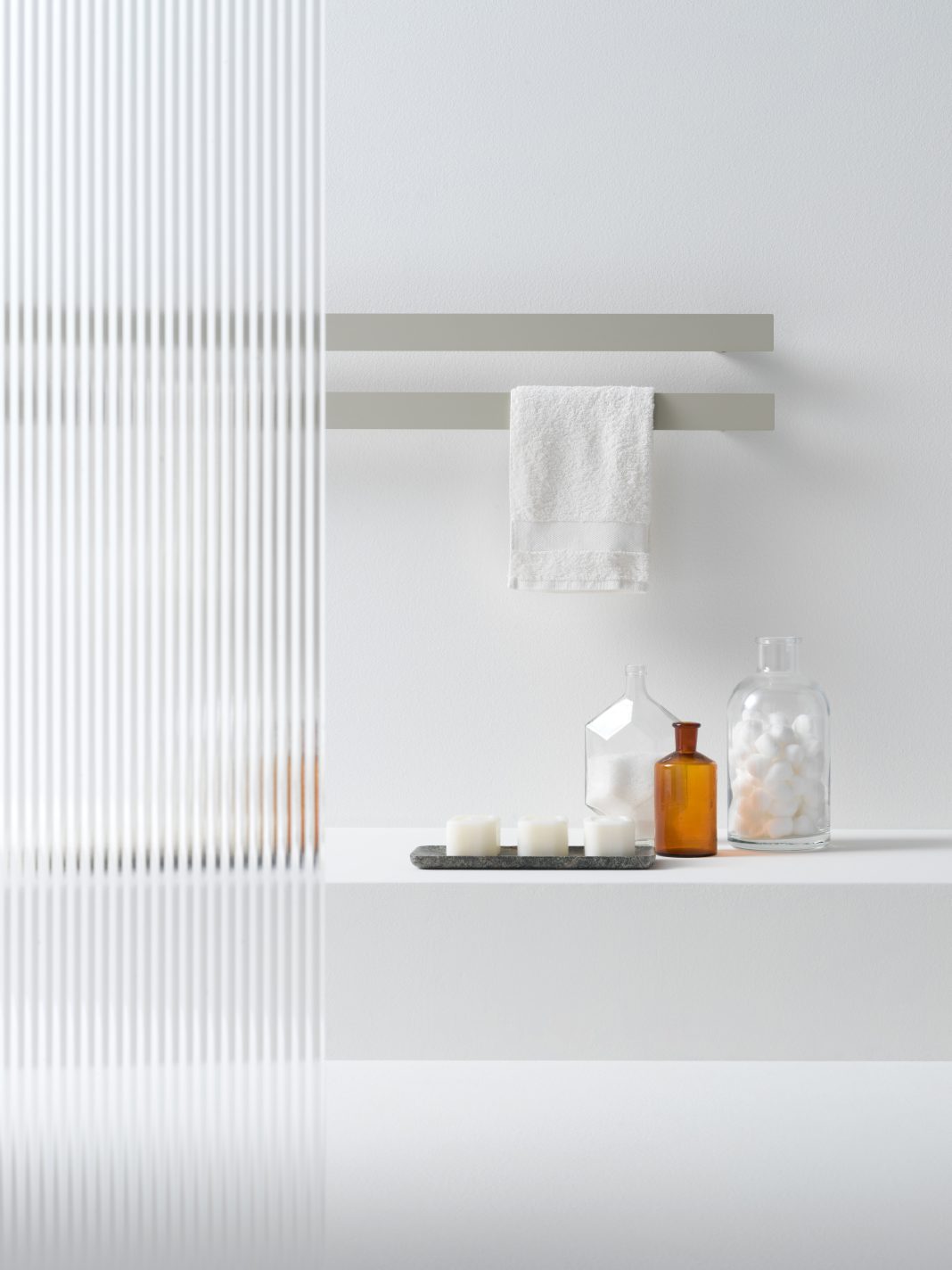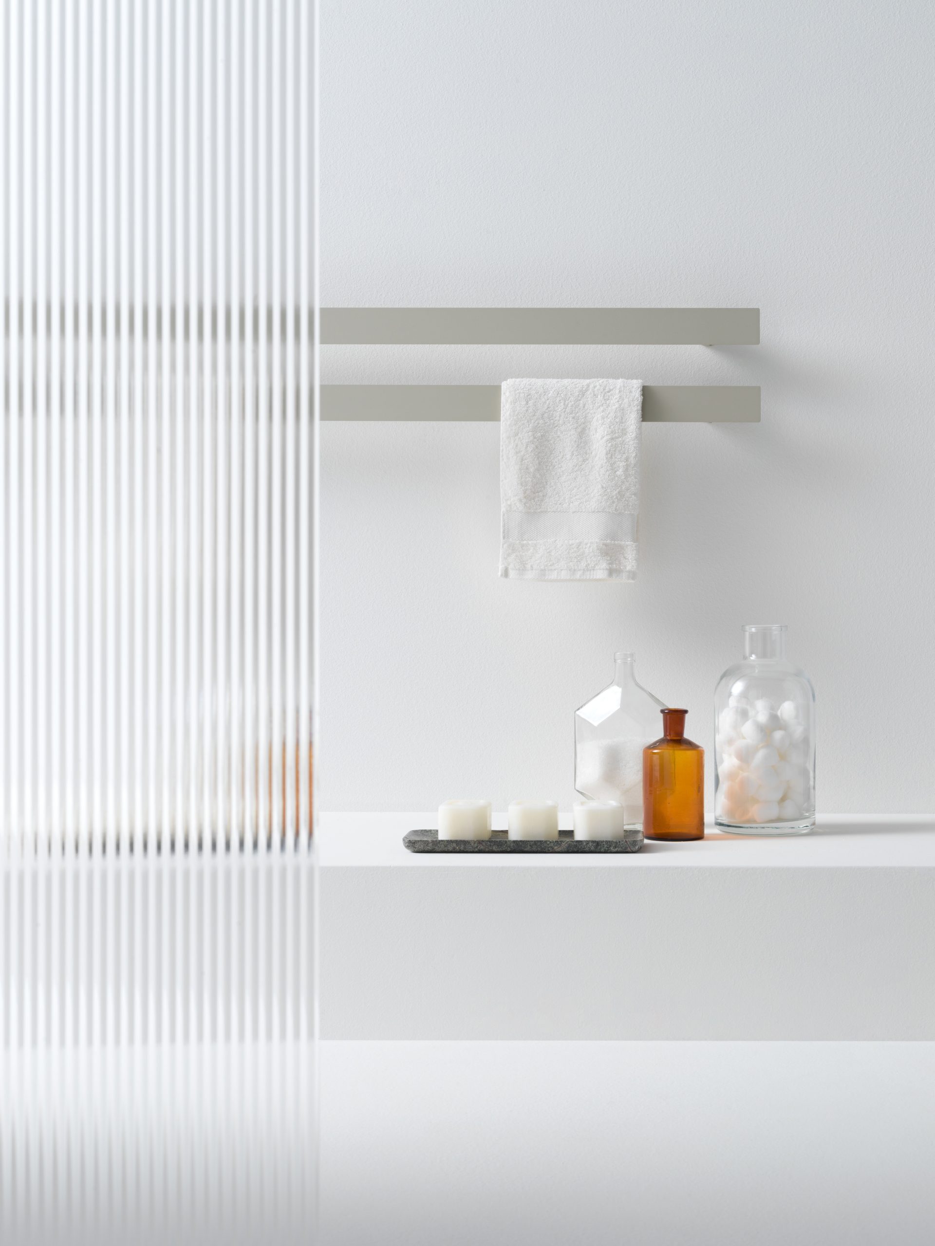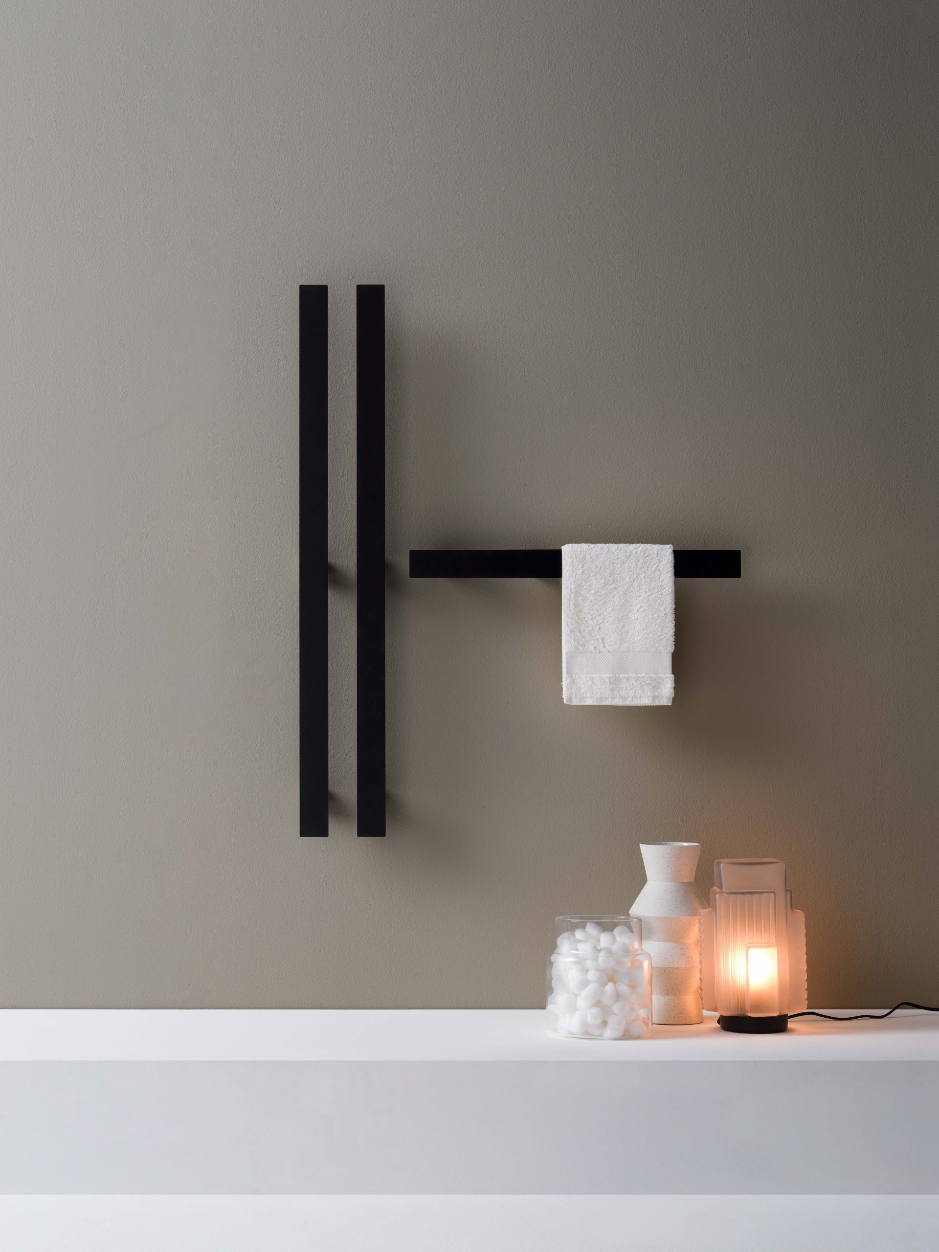Tavolina, cuore della parola chiave ricercata, assorbe dai 13 ai 38 Watt a seconda delle quattro dimensioni disponibili. Si tratta di una barra sottile in alluminio riciclabile, larga 5,2 cm, personalizzabile tramite la Color Chart Antrax IT. Anche in questo caso l’installazione non richiede predisposizioni: la posizione del sistema di fissaggio può essere adattata a esigenze e spazi, facilitando l’organizzazione delle salviette. In verticale, Tavolina diventa un ulteriore supporto per gli accappatoi e può essere inserita in composizioni modulari, assegnando a ciascun elemento una funzione specifica.