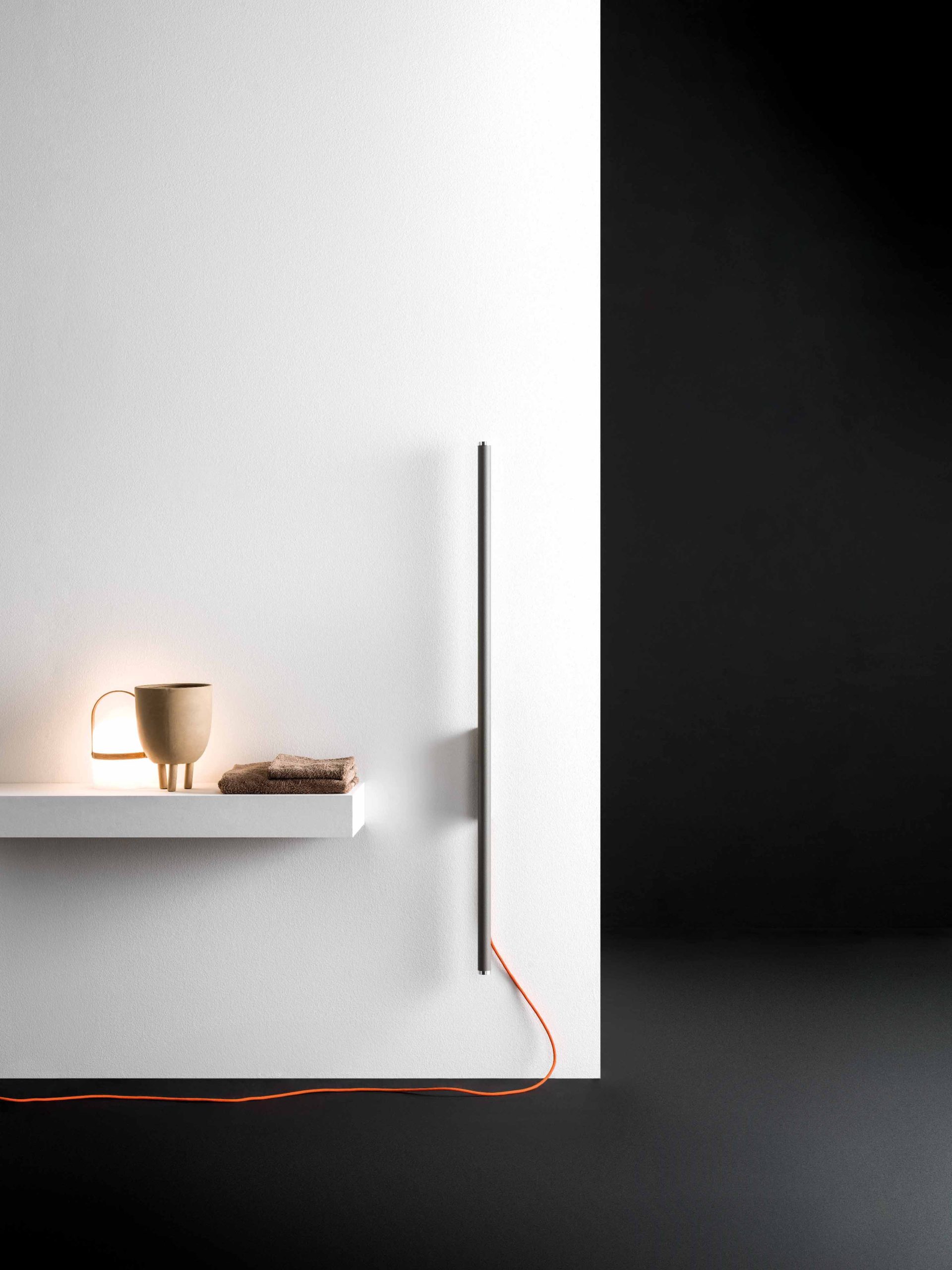 Carlo & Tina, disegnati da Dante O. Benini e Andrea Crosetta, sono tubolari verticali in alluminio riciclabile, con un sottile blocco di fissaggio sul retro e sistema on/off evidenziato da una luce LED. Pensati per essere installati senza predisposizioni a muro, si collegano direttamente alla presa, con cavo visibile o nascosto nel supporto. Con un consumo di 35 Watt possono essere utilizzati singolarmente o in combinazione, scegliendo tra oltre duecento colori e finiture galvaniche come Copper, Light Gold o Black Diamond. A caratterizzare Carlo c’è inoltre un gancio in acciaio inox, omaggio all’architettura di Carlo Scarpa, disponibile anche in versione cromata lucida o spazzolata.
