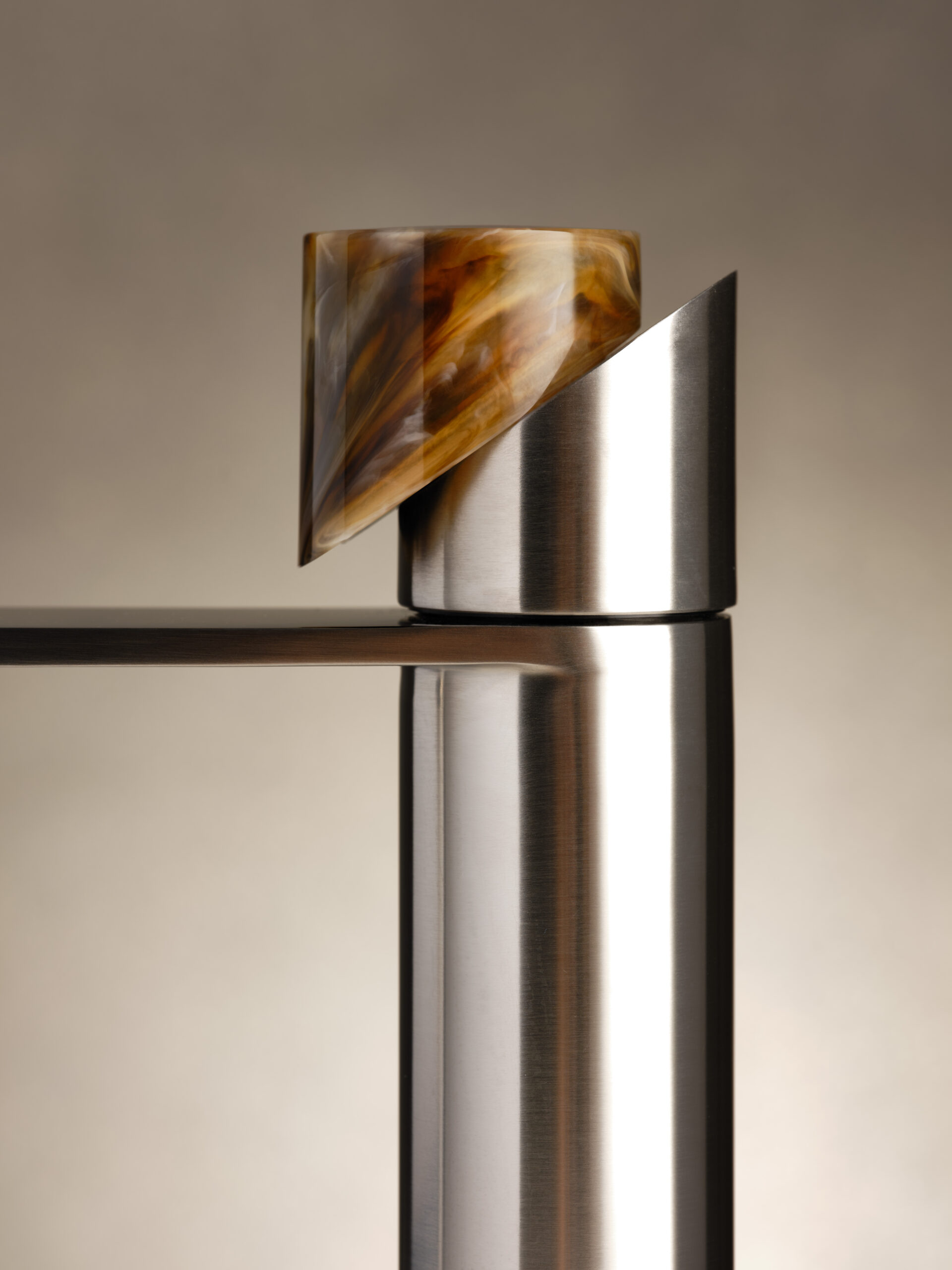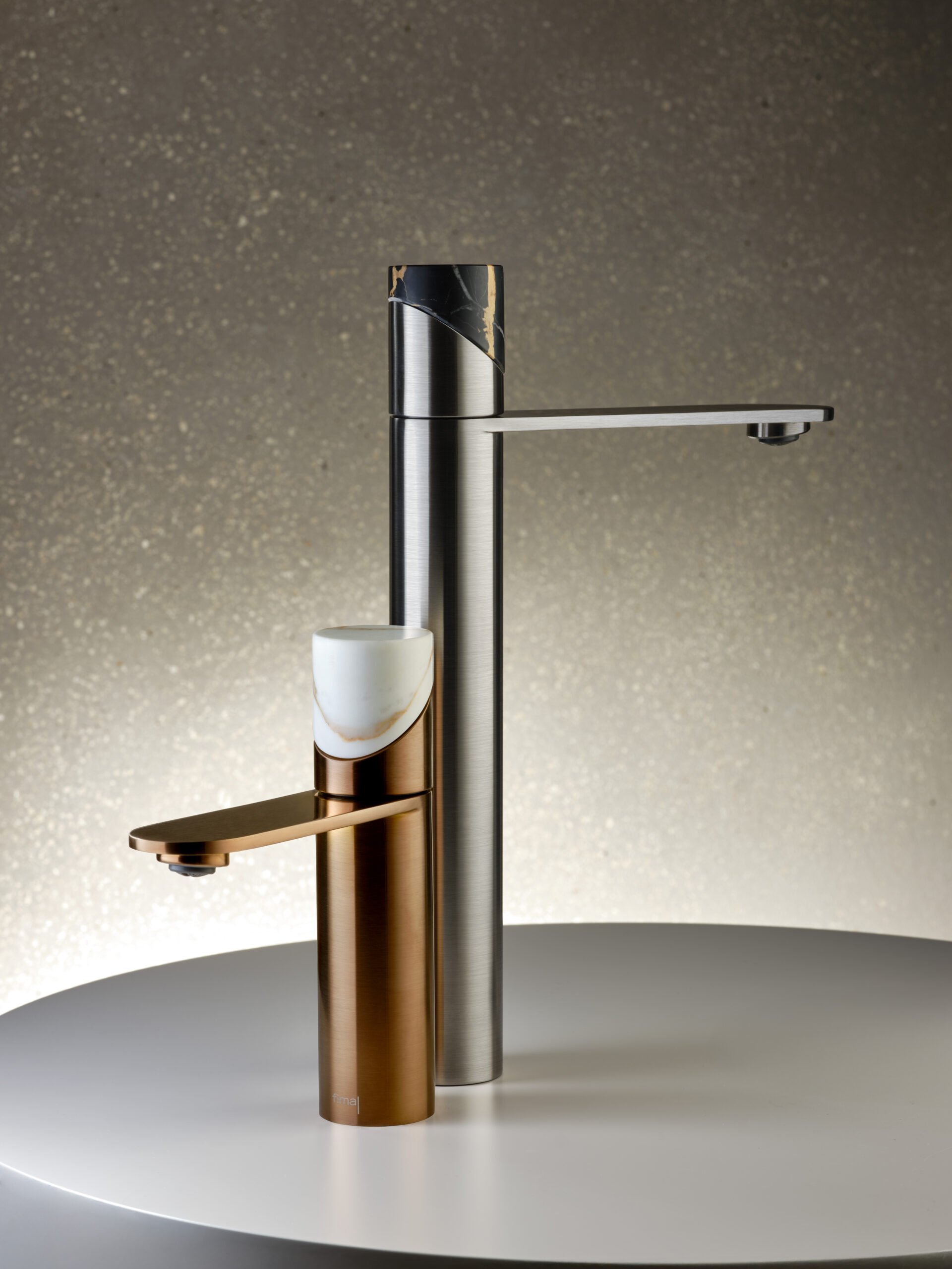 Queste varianti si integrano con le finiture della canna in acciaio Inox 316 - Cromo Nero, Nickel, Bronzo Ambrato, Champagne e Oro spazzolati - generando combinazioni che trasformano profondamente l’identità del prodotto. Il miscelatore può così passare da una presenza essenziale e rigorosa a una più materica e caratterizzata, diventando un segno distintivo all’interno dello spazio bagno, quasi un dettaglio architettonico capace di orientare l’intero progetto.