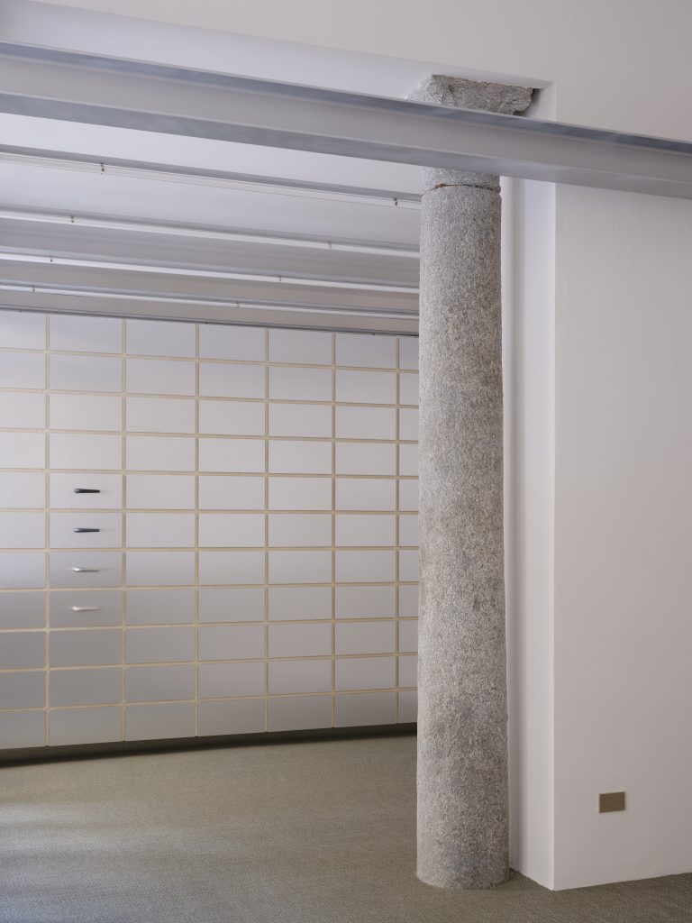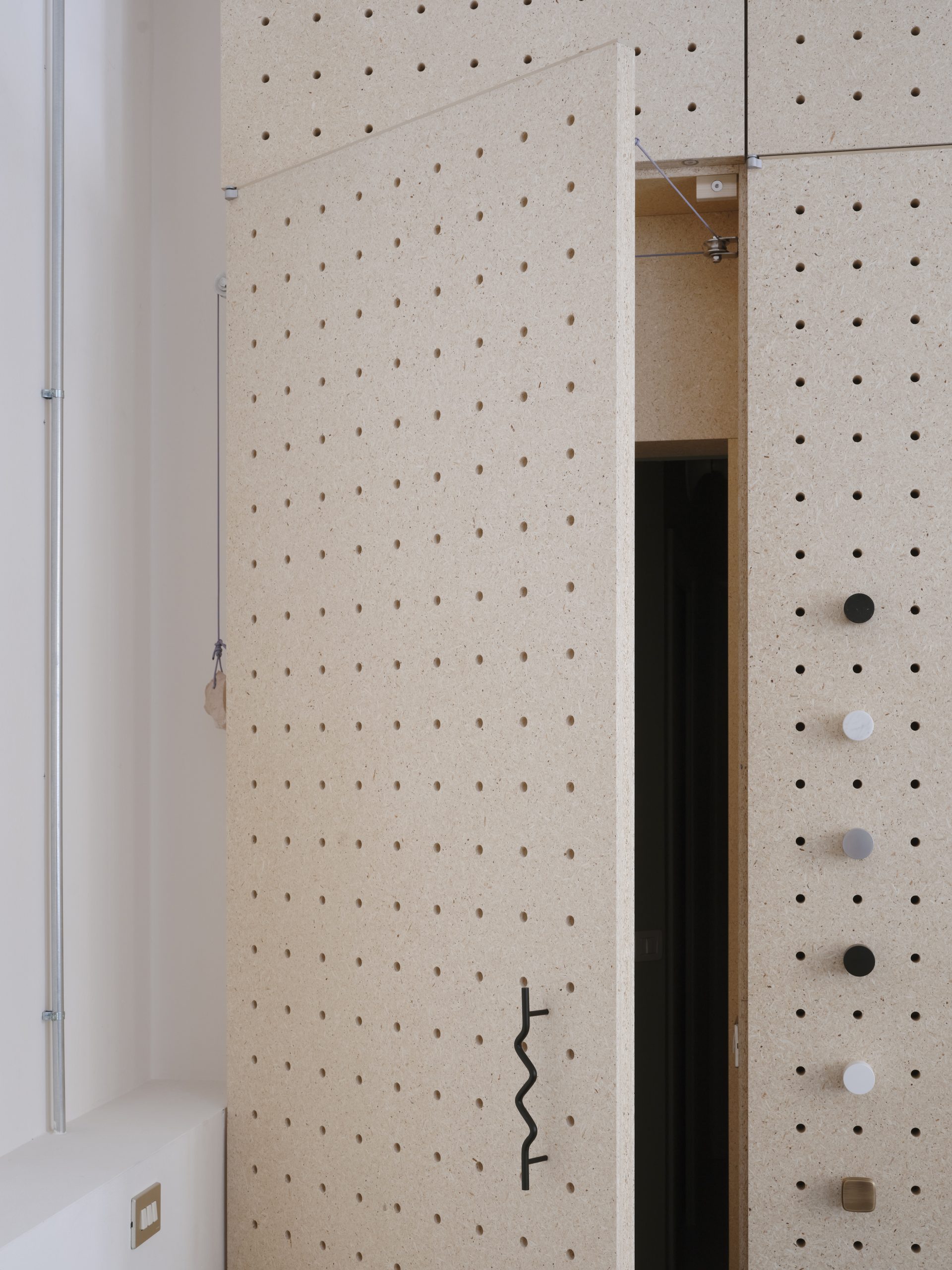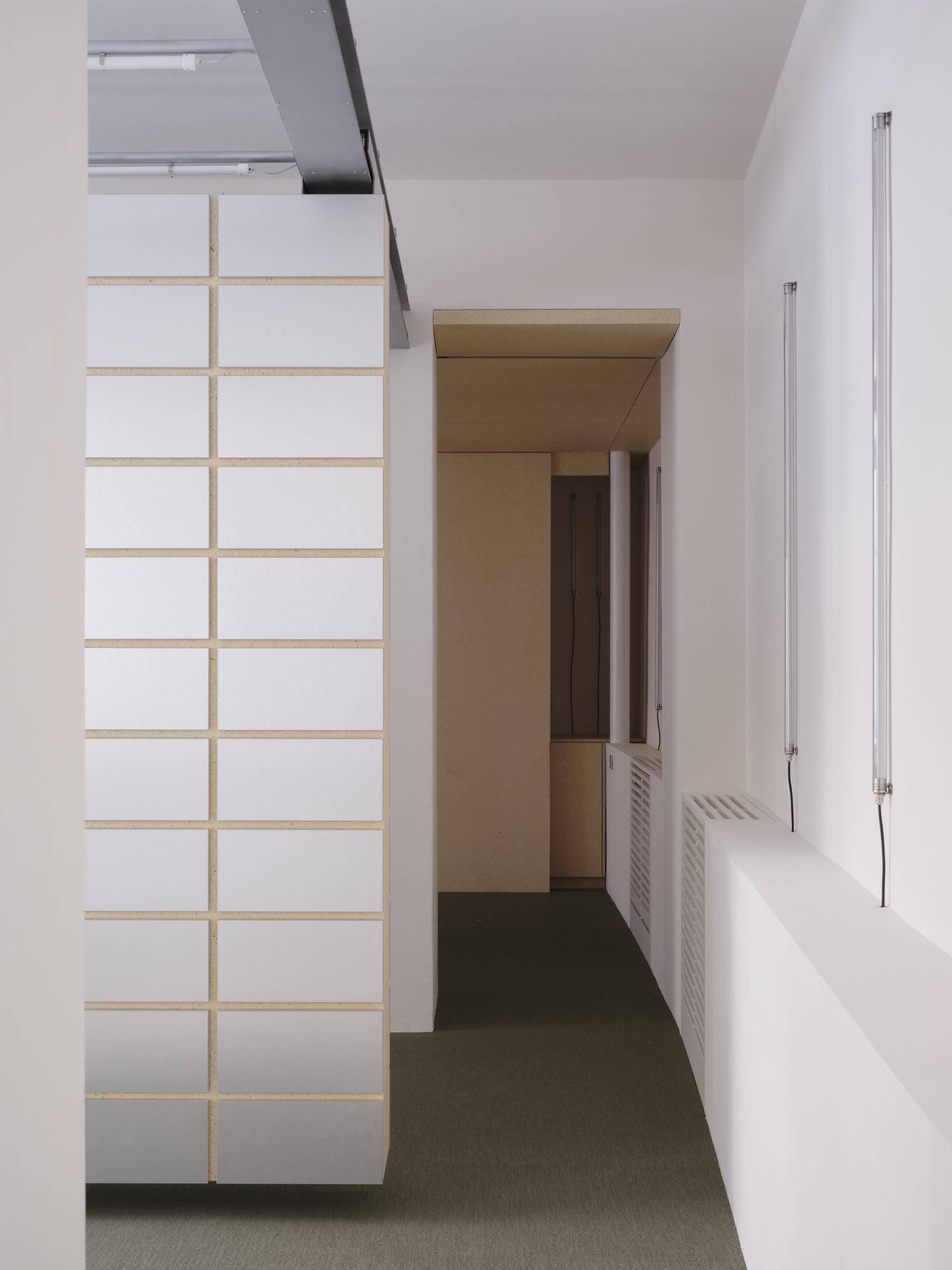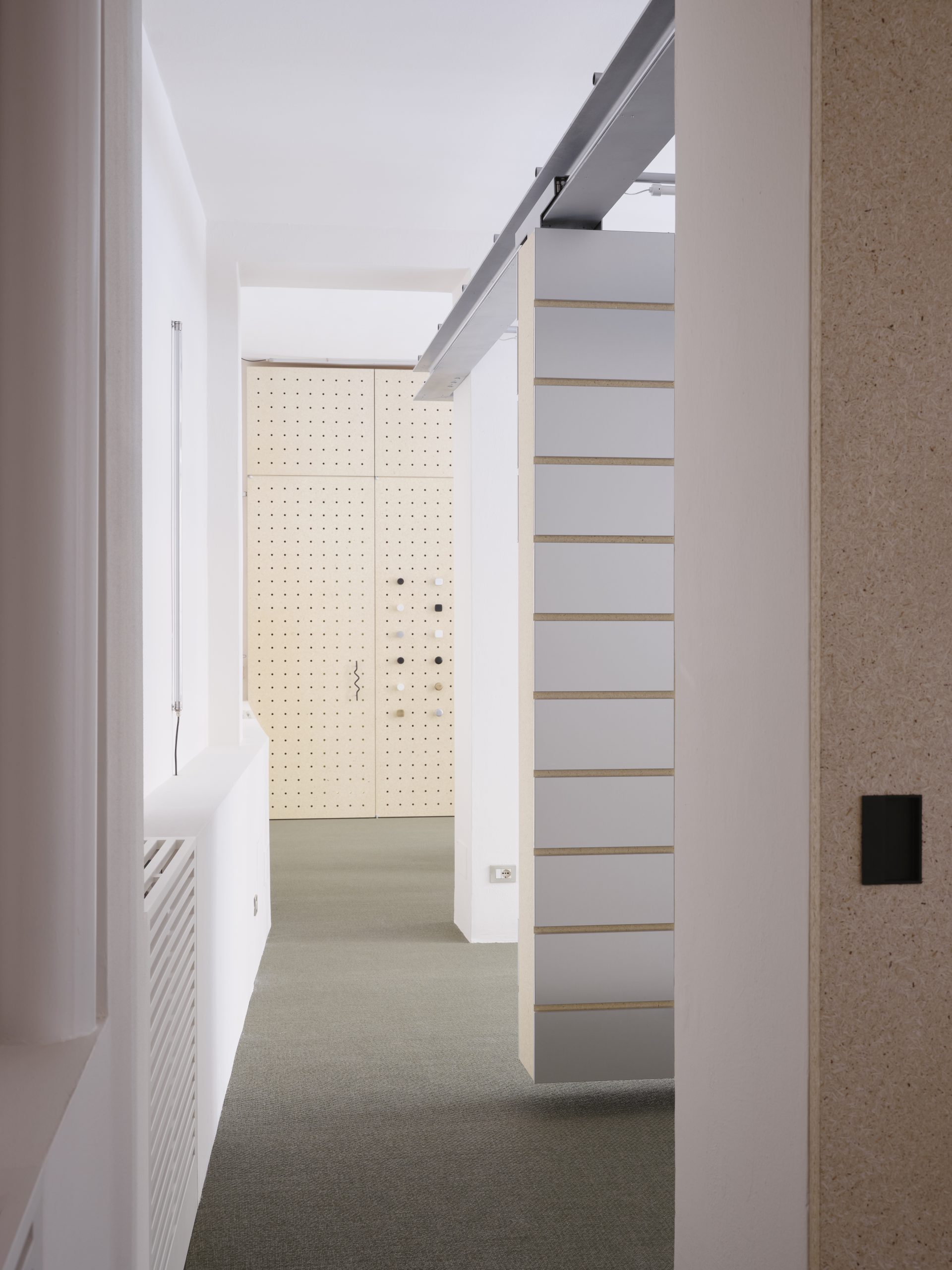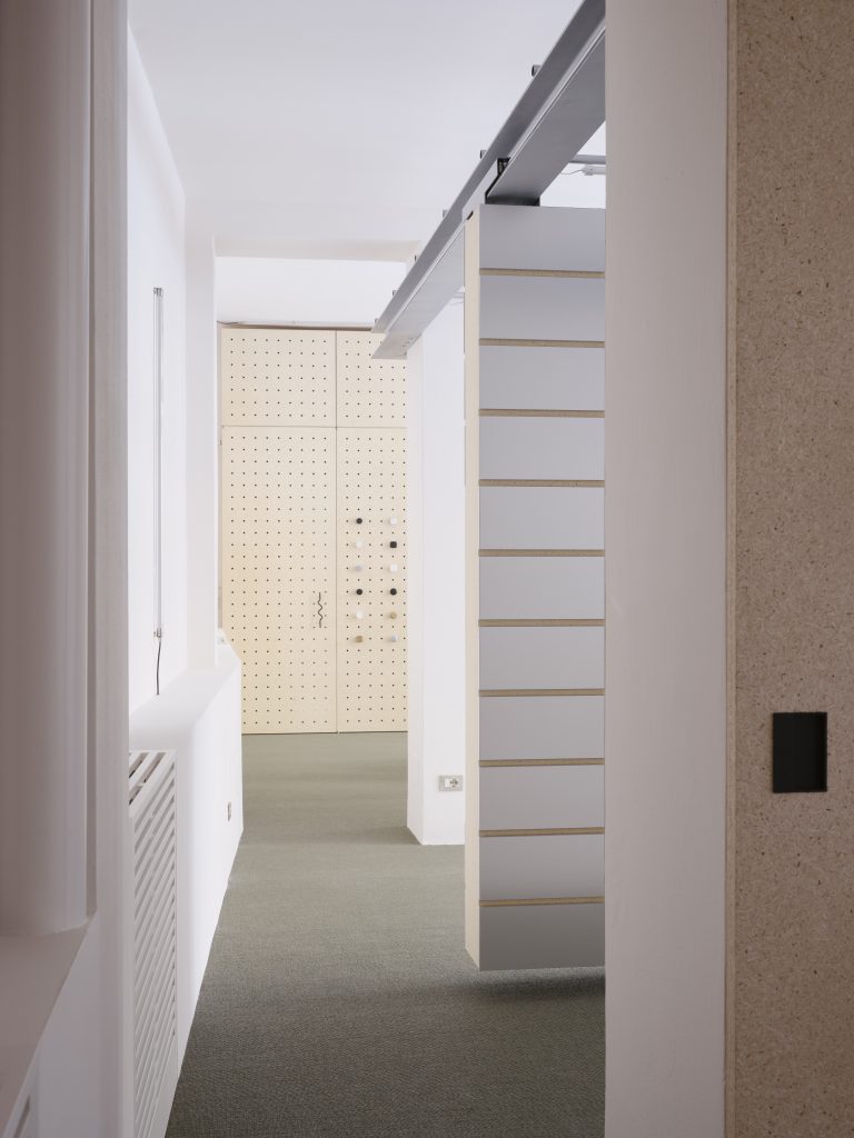 L’ingresso accoglie i visitatori con una parete in legno di pioppo con un pattern regolare di fori che espone in modo flessibile e scenografico la collezione di maniglie di Verum, mantenendo un’estetica ordinata e continua. Il cuore tecnologico dello showroom è la sala centrale, definita da una parete con un telaio sospeso che integra il sistema di binari IRONLEV, un brevetto proprietario all’avanguardia. La parete, grazie alla sua mobilità, non solo permette di offrire molteplici soluzioni espositive ma è pensata per trasformare le dimensioni e la gerarchia della stanza, variandone gli accessi e i flussi unendo questo ambiente ai due adiacenti. Rivestito in laminato metallico e illuminato da un reticolo di tubolari LED, il divisorio diventa elemento chiave del progetto, trasformando lo spazio per adattarlo alle diverse configurazioni espositive.