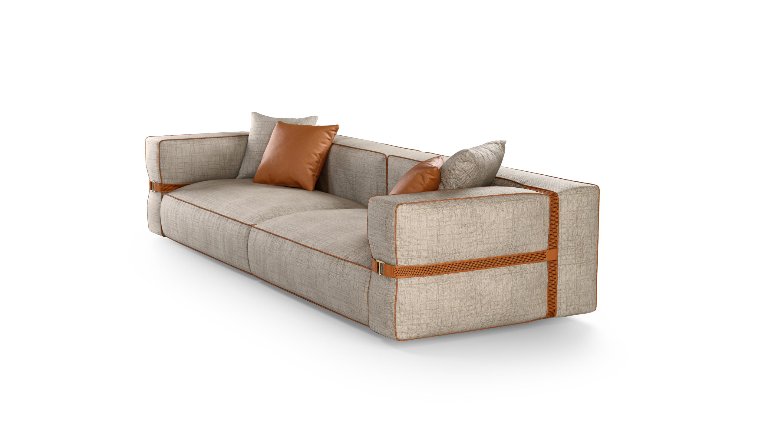 Grandi volumi rettangolari svelano una sofisticata eleganza attraverso proporzioni attentamente studiate e dettagli preziosi: profili sartoriali, piping in pelle, tessuti finemente selezionati e forme morbide, calibrate con una precisione quasi architettonica. Il comfort prende forma anche nei cuscini morbidi imbottiti, appoggiati su una struttura che sembra fluttuare leggera, pronta a offrire un abbraccio caldo e accogliente.