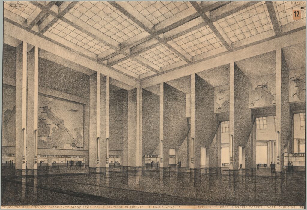 Giuseppe Torres, Carlo Keller, Concorso per il nuovo fabbricato viaggiatori Stazione di Firenze S. Maria Novella, disegno, carboncino e matita su cartoncino, firma autografa, 84 x 123 cm, [1933]. Archivio Progetti Iuav, Fondo Giuseppe Torres (proprietà architetto Giovanna Ravetta)