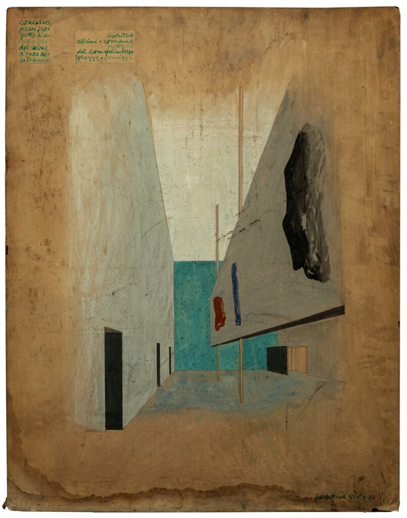 I primi disegni testimoniano gli anni di fondazione quando la Scuola superiore di Architettura sta costruendo un’identità nuova e diversa, che sostituisca quella impressa dall’Accademia di Belle Arti, di cui è filiazione. La rassegna si apre con un bozzetto di Brenno Del Giudice per il manifesto della XV Biennale d’Arte di Venezia, di proprietà della Wolfsoniana - Palazzo Ducale Fondazione per la Cultura di Genova. Una serie di opere testimonia concorsi architettonici del primo dopoguerra: la tavola di Giuseppe Torres e Carlo Keller per il concorso del nuovo fabbricato viaggiatori della stazione di Firenze S. Maria Novella; una prospettiva di Virgilio Vallot per il concorso della nuova stazione veneziana di Santa Lucia e il progetto per il ponte di Bassano di Guido Costante Sullam, di proprietà della Fondazione Musei Civici di Venezia.