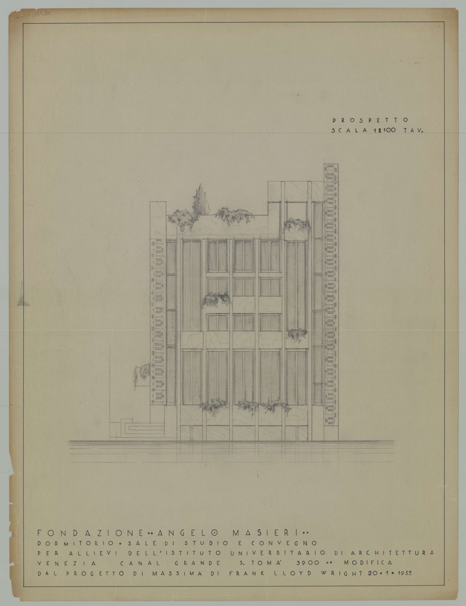 Come naturale l’oggetto ricorrente dei disegni è Venezia con i suoi monumenti e nuovi edifici: il ruolo di Iuav nella città diviene misura, paradigma e oggetto di indagine, contribuendo a orientare una riflessione costante sul rapporto tra ambiente e patrimonio culturale. Molti disegni sono relativi alle sedi Iuav, in genere adeguamenti di architetture storiche, non raramente lavori degli stessi docenti. Il progetto per il nuovo ingresso della sede dei Tolentini è illustrato da un disegno del 1938 di Guido Cirilli, conservato nell’Archivio dell’Accademia di Belle Arti. In realtà solo nel 1984 esso fu costruito da Sergio Los, ma su un progetto di Carlo Scarpa. Daniele Calabi nel 1960 firma un disegno per l’adeguamento del convento dei Tolentini come sede dell’Ateneo. L’adeguamento alla didattica degli spazi del Cotonificio Olcese è oggetto di disegni di Gino Valle e Giorgio Macola; le verifiche statiche sull’edificio sono delineate dal celebre ingegnere Franco Levi. Disegnare Venezia ha significato, e significa tutt’ora, studiarne la morfologia urbana, comprenderne la stratificazione storica e interrogarsi sulla relazione tra architettura, acqua, infrastrutture e paesaggio.