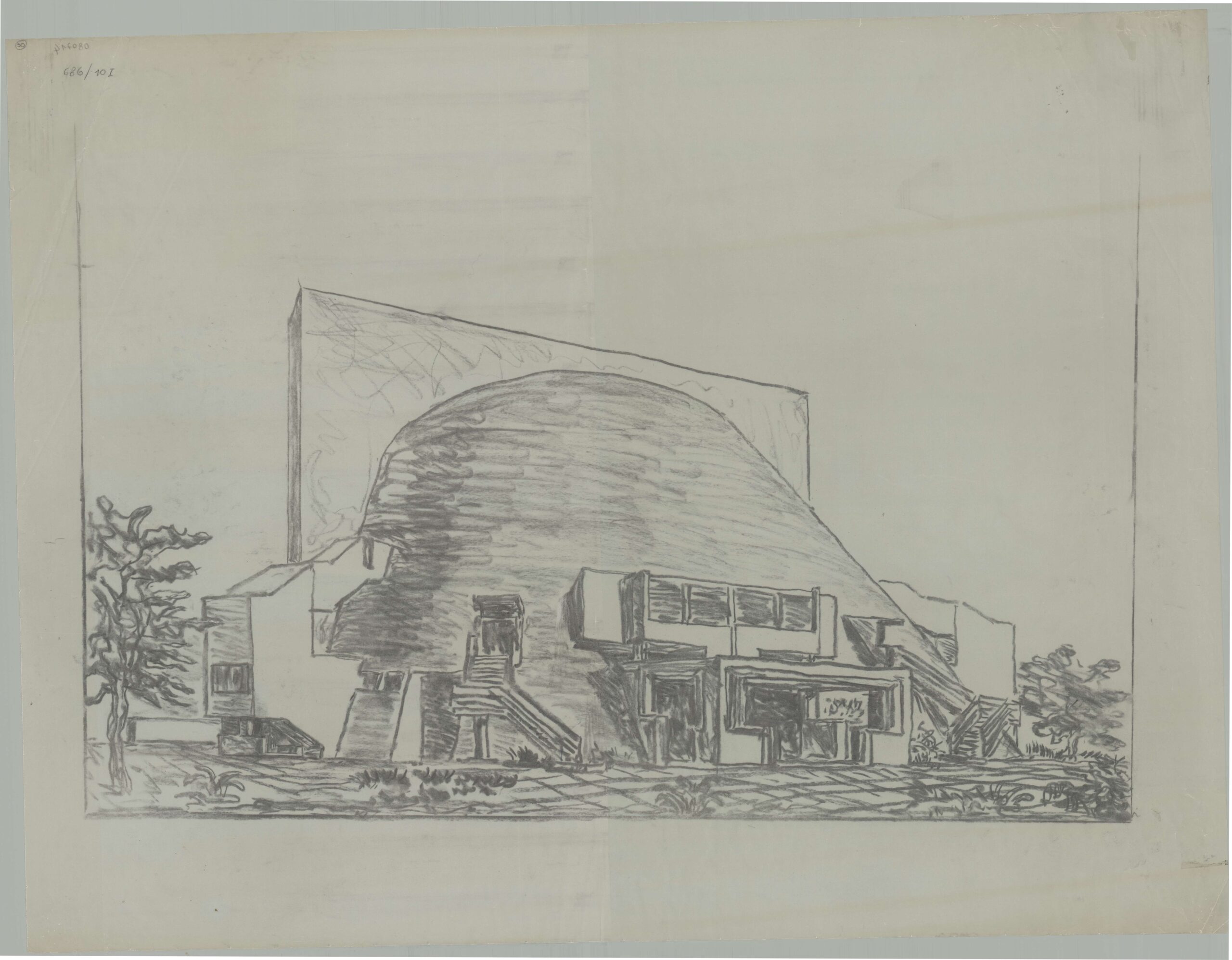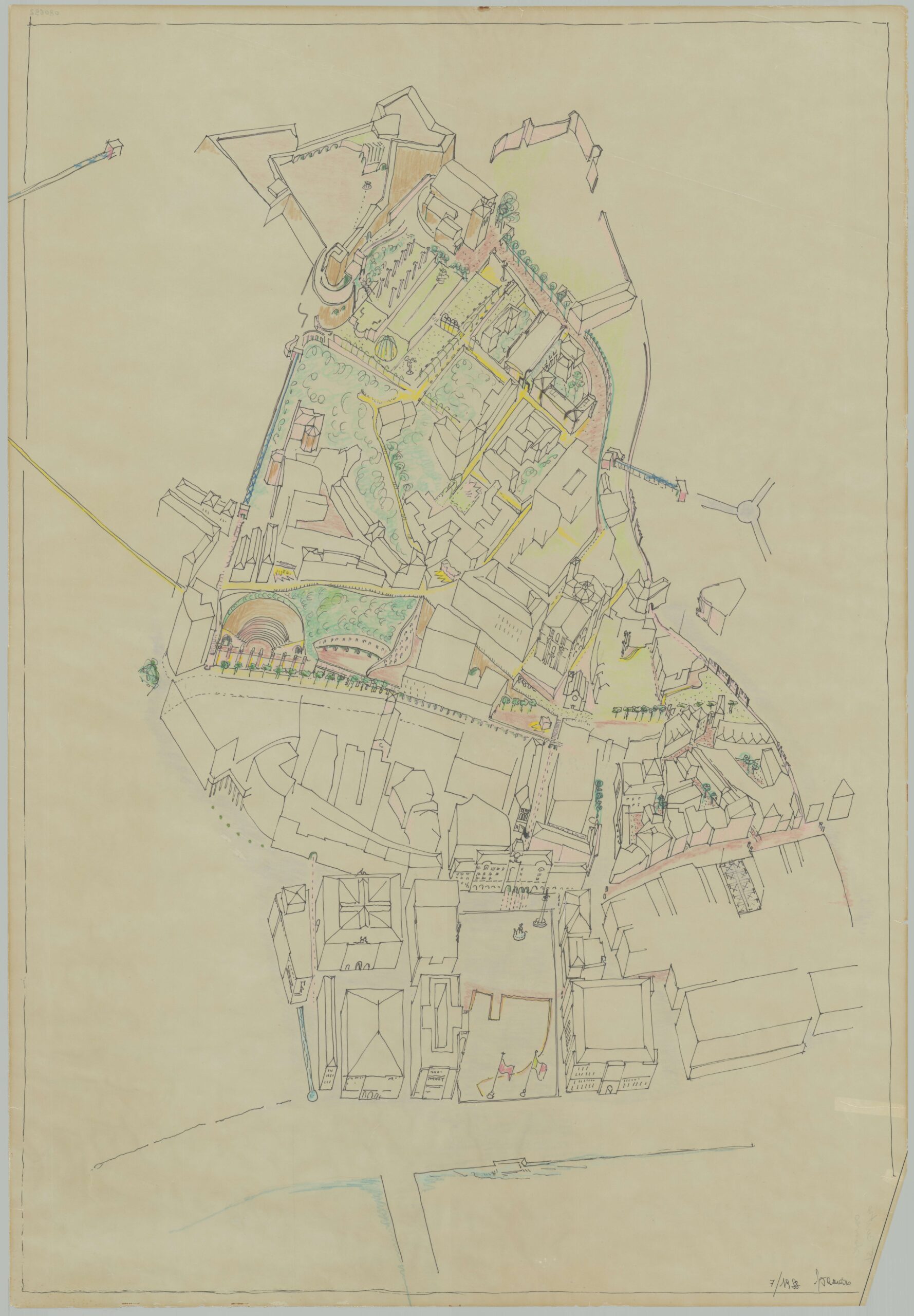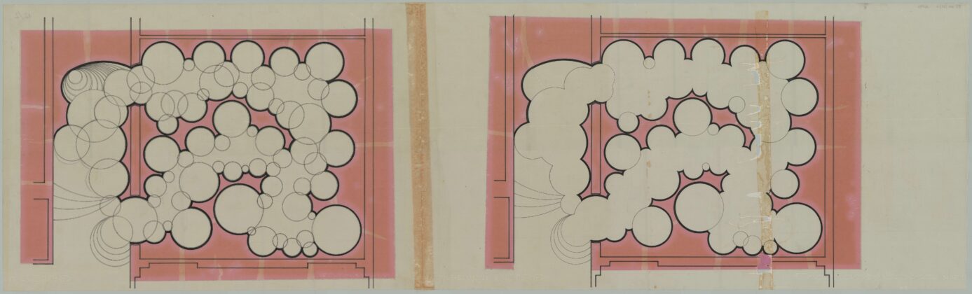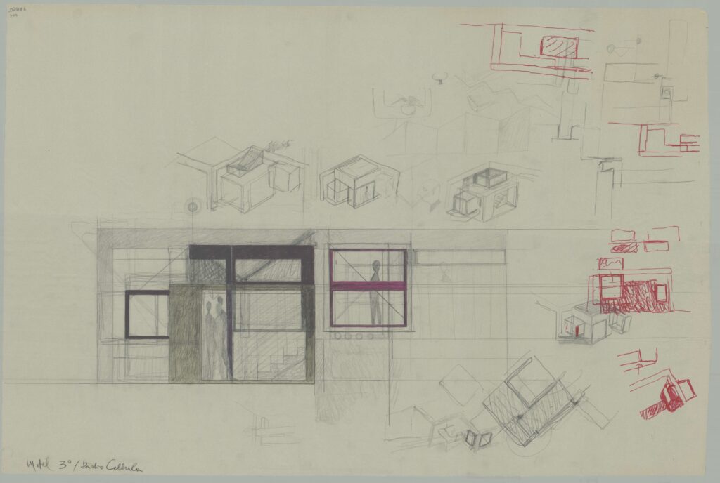 Valeriano Pastor, Motel a Cavallino. Terzo studio cellula, disegno, inchiostro di china, matita, pennarello e pastello a cera su carta vegetale, 43 x 64 cm, s.d. Archivio Progetti Iuav, Fondo Valeriano Pastor