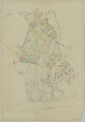 Alcuni disegni rivelano la tensione innovativa e sperimentale del secondo dopoguerra, quando Iuav si guadagnò il ruolo di laboratorio internazionale per il rinnovamento della disciplina con l’apporto di figure di grande caratura, come Carlo Scarpa, il cui modo di disegnare, composto da stratificazioni, dettagli minuziosi e continue varianti, è tra gli esempi più intensi e originali del rapporto tra disegno e costruzione. In mostra è esposto un grande disegno (100x150 cm)tra quelli che Scarpa tratteggiava rapidamente per illustrare quanto andava spiegando nelle lezioni. Sotto teca è mostrato il menabò di Egle Renata Trincanato predisposto per il volume “Venezia Minore”.