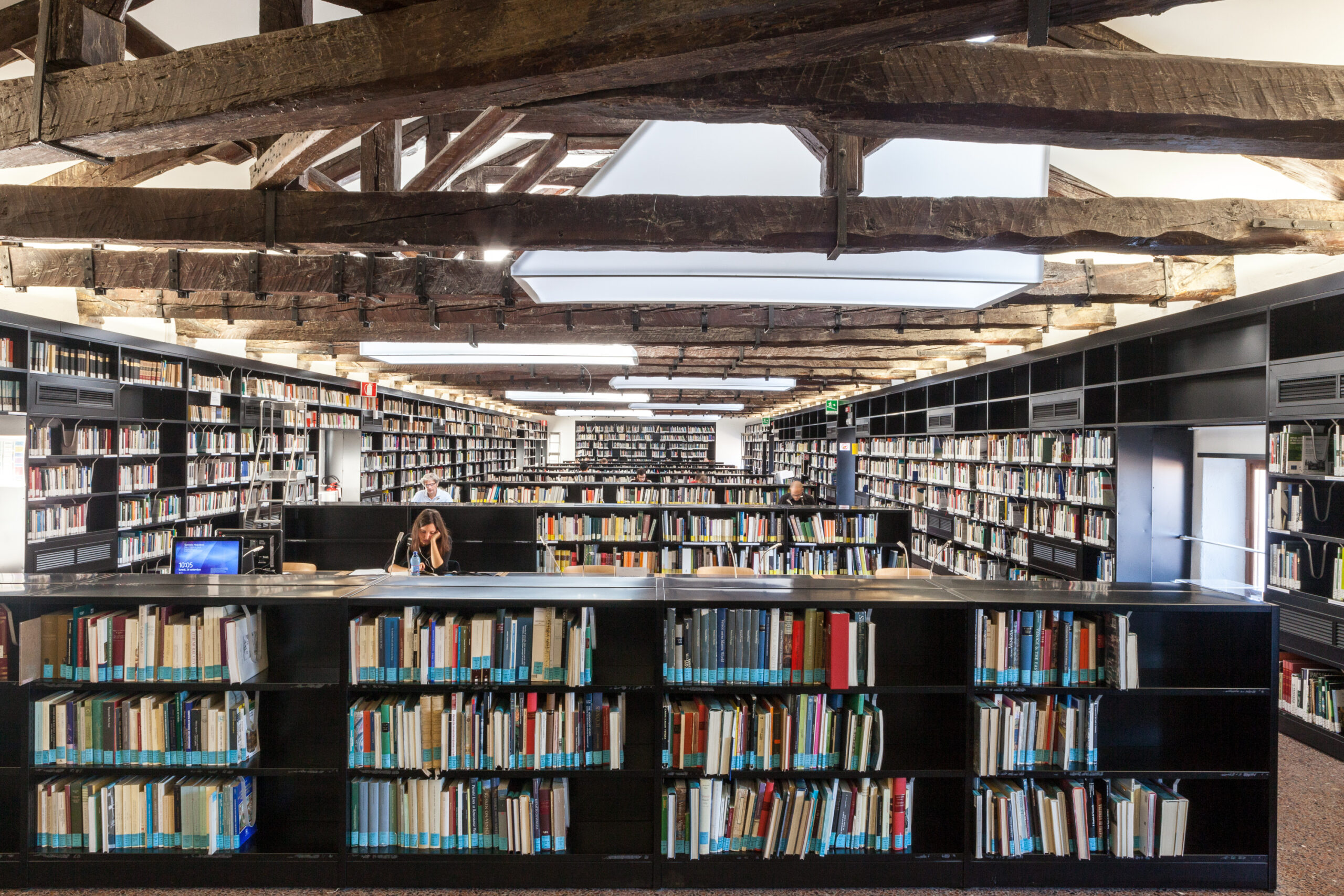 Lungo le pareti corre la cronologia storica a partire dal 1926 fino a oggi, dove si associano date e protagonisti, si evidenziano i cicli dei rettorati, i cambiamenti di statuto, il numero degli studenti. Pannelli verticali, ognuno dedicato a un quinquennio, sintetizzano dati e informazioni, che ricostruiscono il passaggio dalla Scuola superiore di Architettura all’Università Iuav di Venezia.