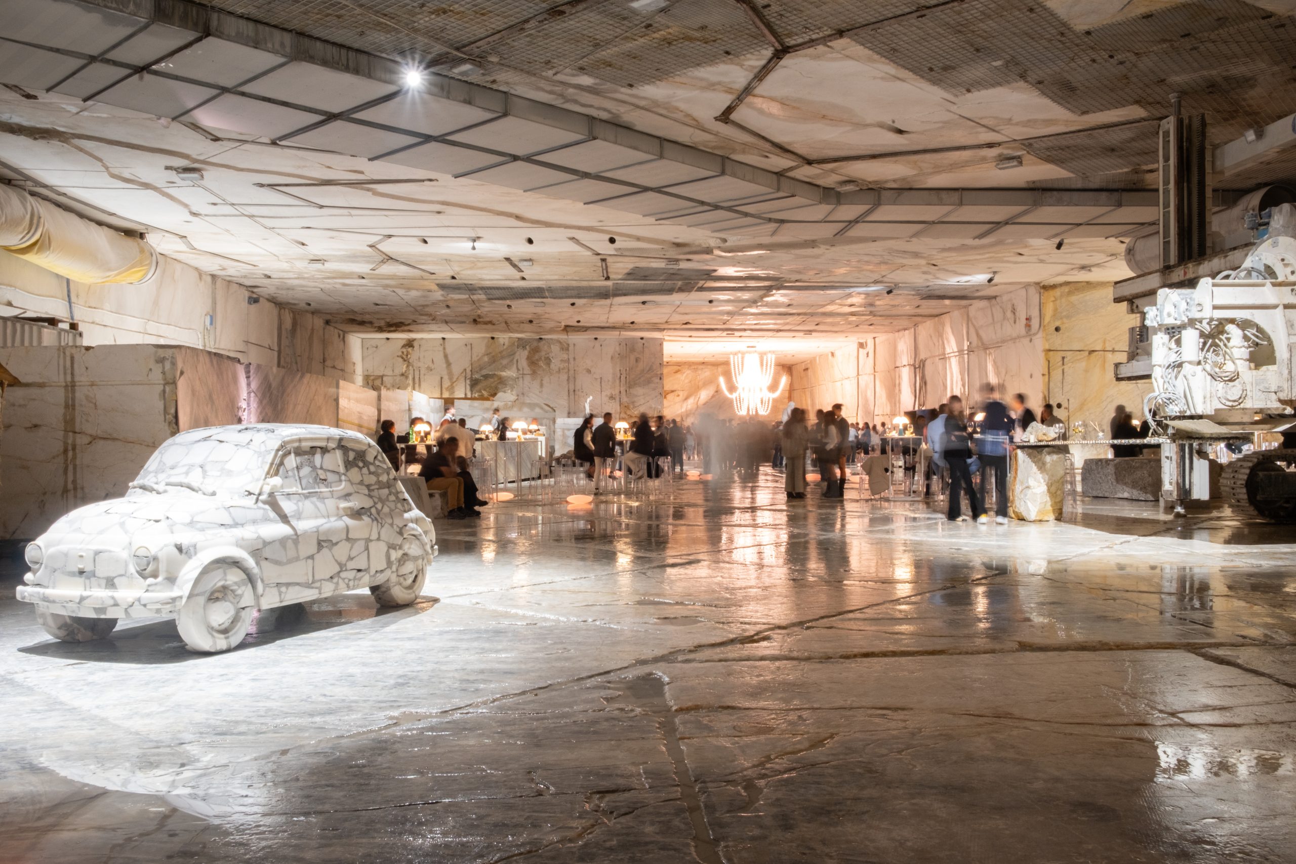 Nel percorso troviamo tre opere della serie “Rinascita dagli scarti” di Filippo Tincolini: il Satiro dei Sassi, la Venere dei Sassi e una Fiat 500 a grandezza naturale. Tutte realizzate partendo da scarti di lavorazione del marmo, riaggregati in nuovi blocchi di pietre e cemento, esse stesse dispositivi di meraviglia. Blocchi “ricostruiti”, scolpiti poi con tecnologie robotiche e rifiniti a mano, che reinterpretano con ironia e rigore la statuaria classica e la cultura popolare italiana. Il risultato è un’estetica che evoca una manualità collettiva e una memoria territoriale come se ogni opera fosse nata da una stratificazione culturale che unisce archeologia, tecnologia, arte, design.