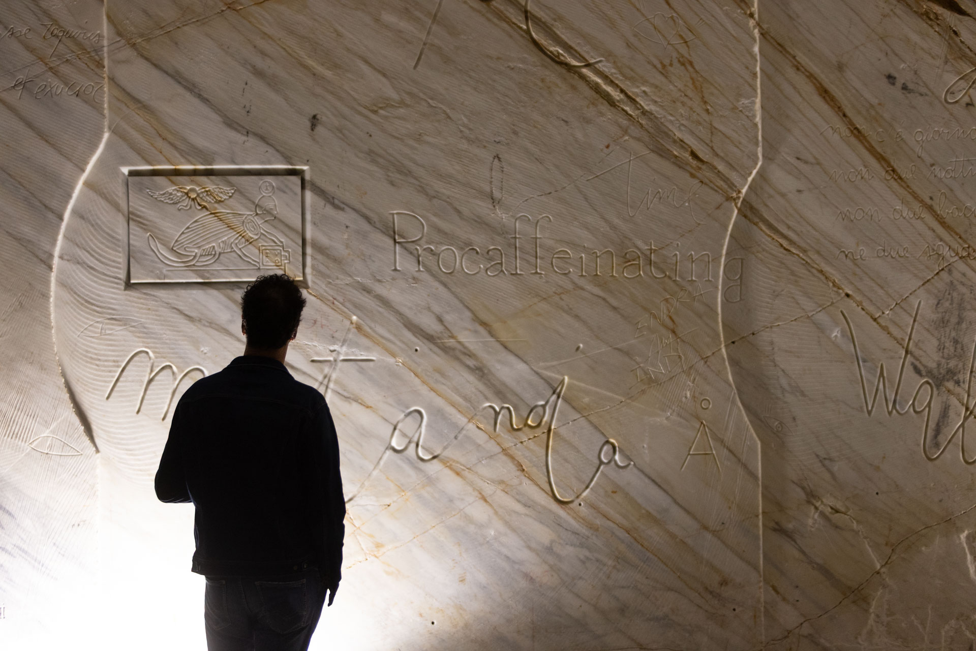 Wunderkammer è un percorso nella galleria della cava, dove ogni ambiente svela una nuova “stanza delle meraviglie”. Non solo le opere di Filippo Tincolini, ma altre presenze, silenziose e disarmanti: opere non finite, provenienti dai margini dei laboratori, dai punti in cui la lavorazione si arresta, dalla soglia tra pensiero e realizzazione. Sculture interrotte, corpi sospesi, oggetti segnati dal tempo e dalla macchina. In questo viaggio lo sguardo è inevitabilmente attratto da “Lingua Animae”, una parete su cui parole intraducibili sono scolpite nel marmo, accanto ad antichi geroglifici tratti dagli studi di Athanasius Kircher, gesuita del seicento, uno dei primi a studiare la scrittura egizia. Le parole diventano geroglifici, e i geroglifici simboli dell’anima — ponti tra culture, tempi e significati. In questo dialogo tra pietra e segno, il linguaggio si trasforma in un alfabeto universale delle emozioni.